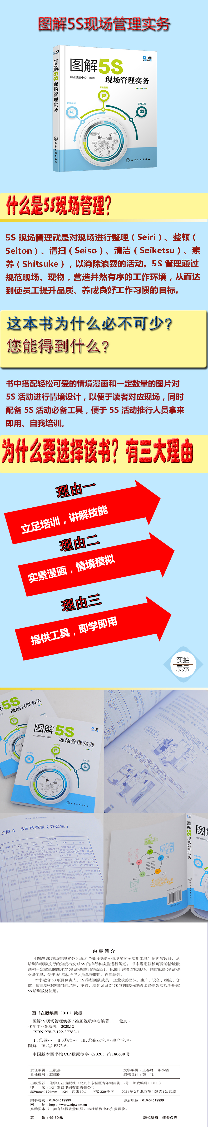 《图解5S现场管理实务》通过“知识技能+情境漫画+实用工具”的内容设计,从培训和现场执行的角度出发对5S的推行和实施进行阐述。书中搭配轻松可爱的情境漫画和一定数量的图片对5S活动进行情境设计,以便于读者对应现场,同时配备5S活动必备工具,便于5S活动推行人员拿来即用、自我培训。