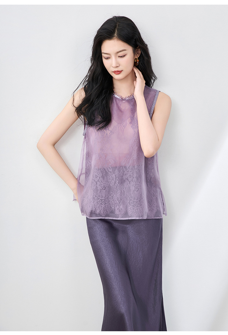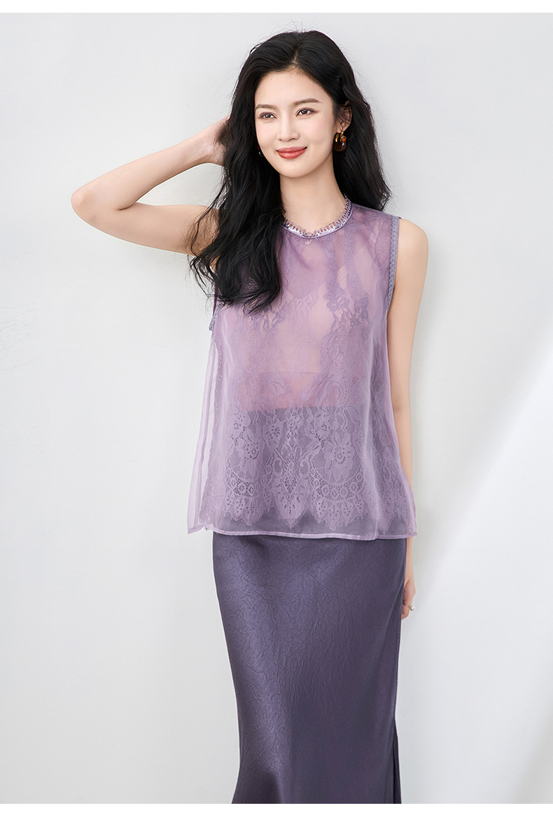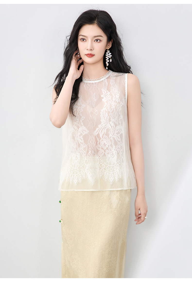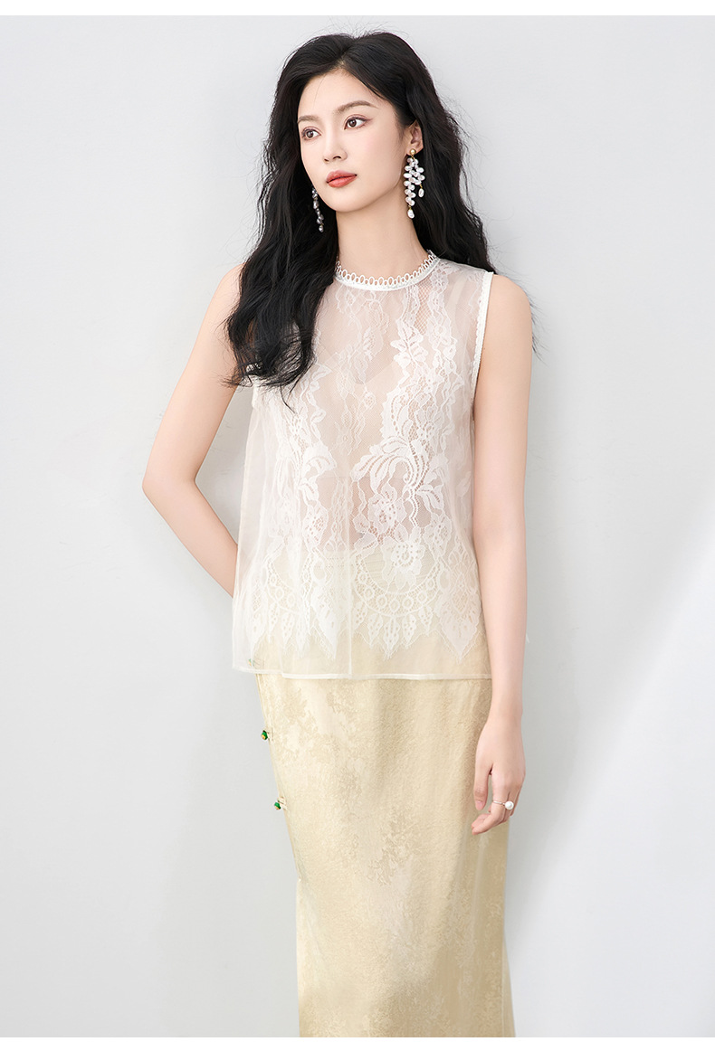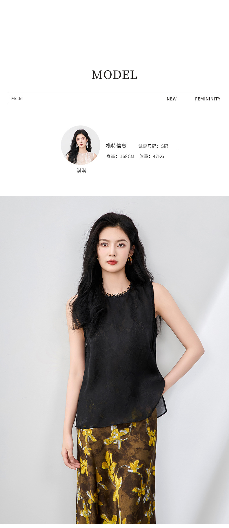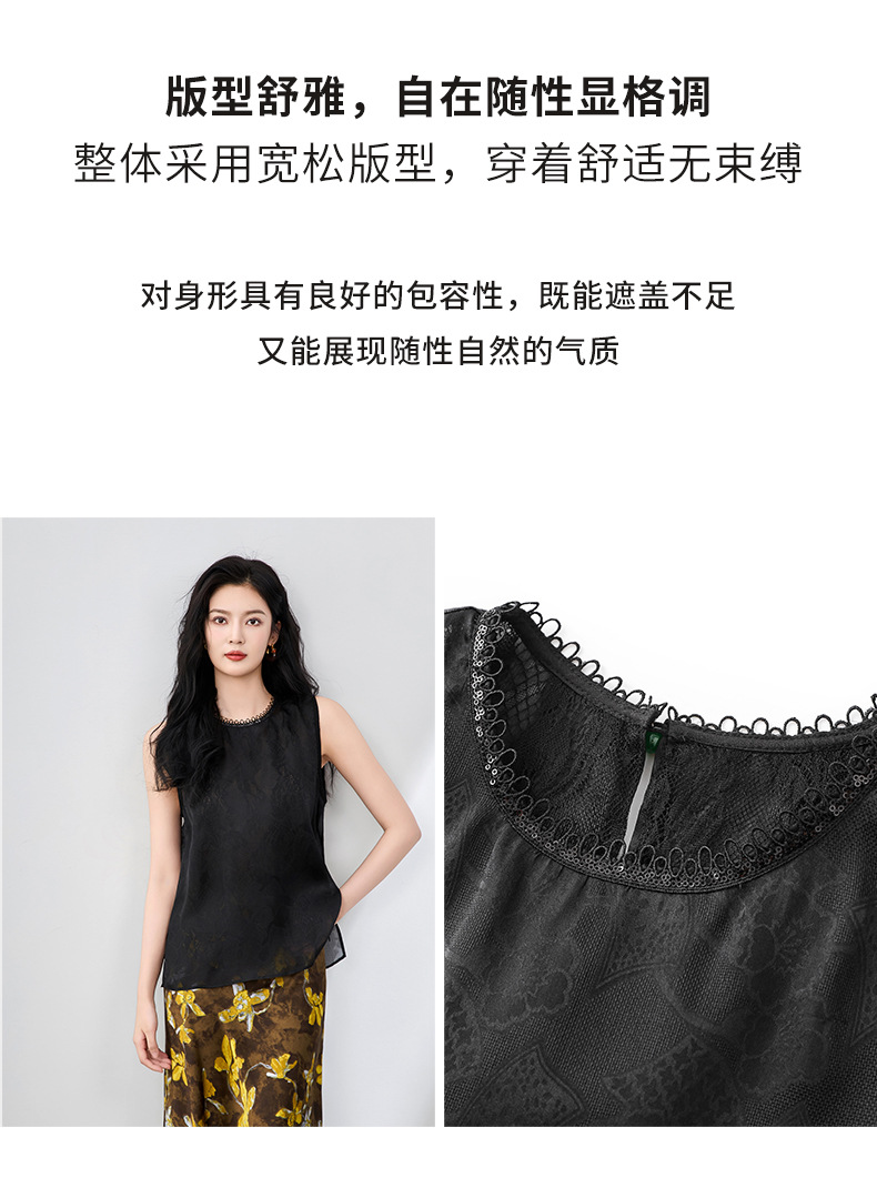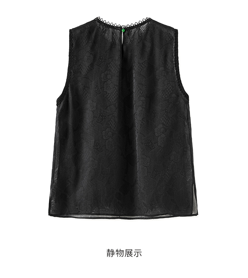 「高货wl」全新升级【铂金会员247/天猫329/差价82】(93601)洛诗琳时尚优雅欧根纱上衣蕾丝花边拼接圆领时髦洋气背心