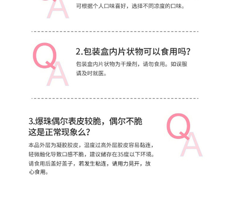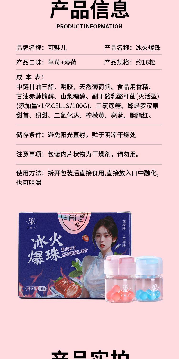 主要成分:t中链甘油三酯,明胶,天然薄荷脑,食品用香精,甘油,赤藓糖醇,山梨糖醇,副干酪乳酪杆菌(灭活型)(添加量>1亿CELLS/100G),三氯蔗糖,蜂蜡,罗汉果甜苷,纽甜,二氧化钛,柠檬黄,亮蓝,胭脂红。