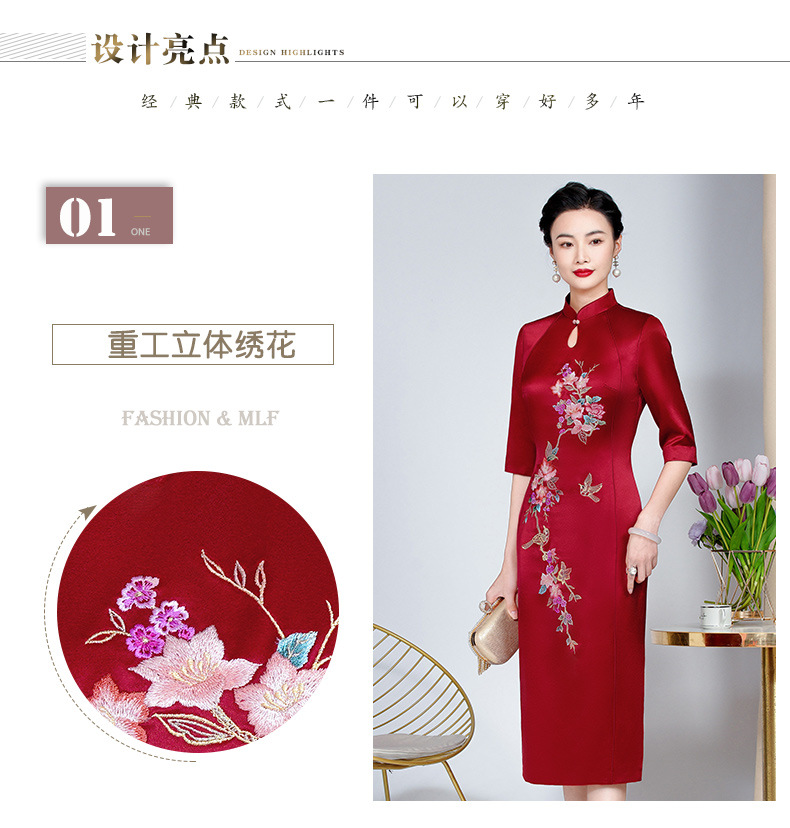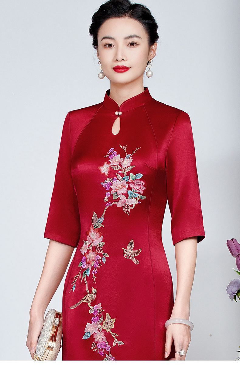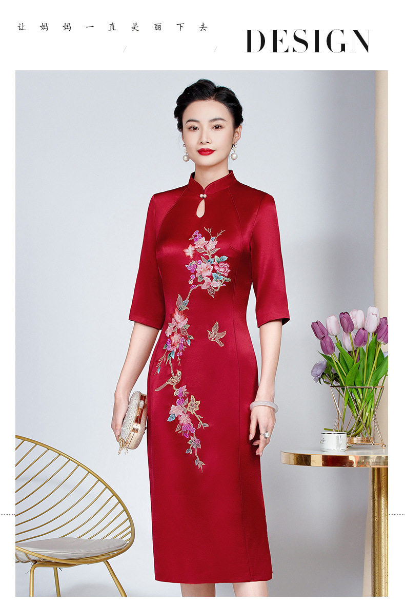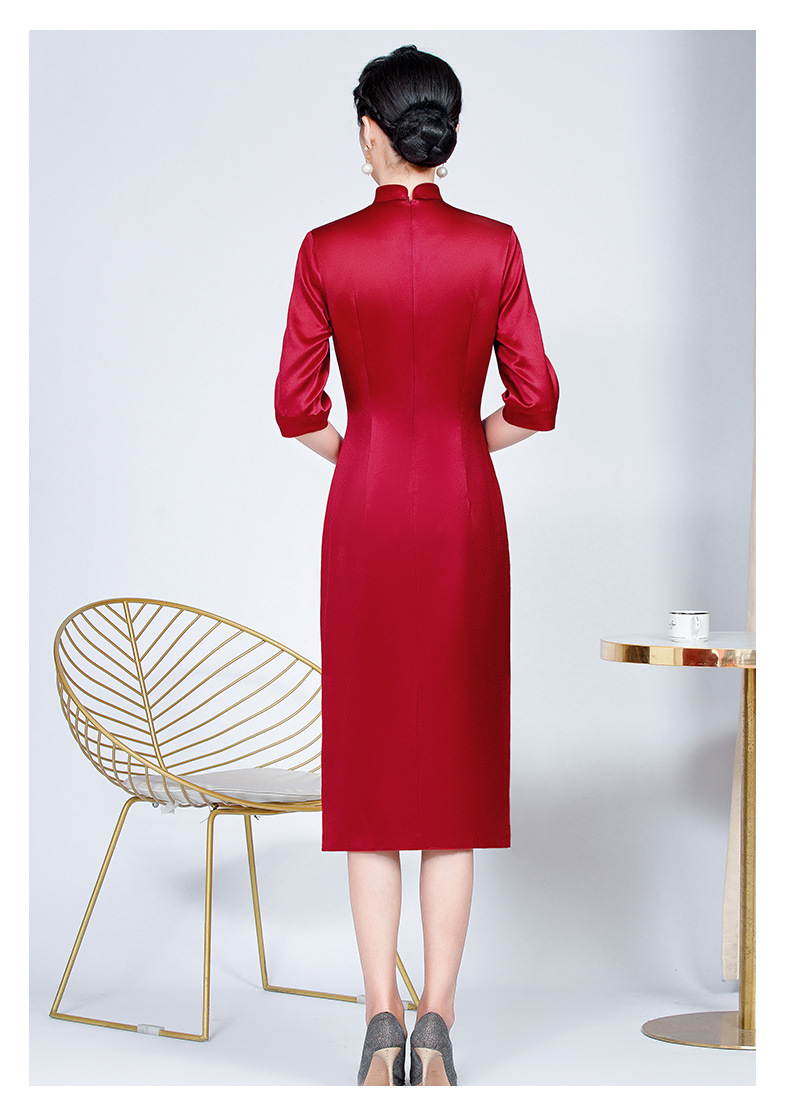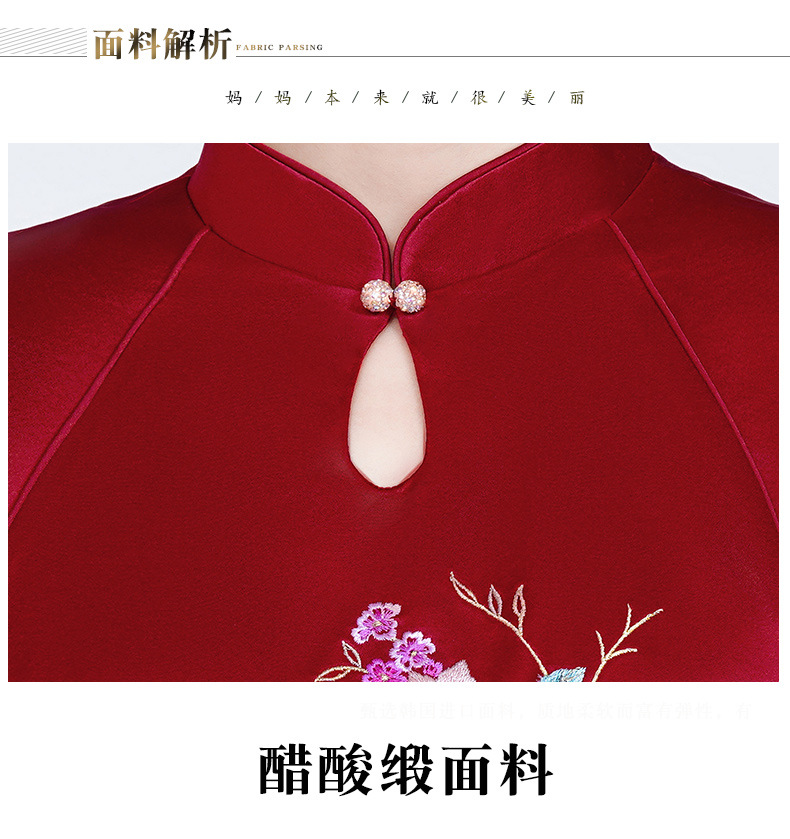 MLY醋酸缎改良妈妈岳母婚宴立领旗袍礼服过膝显瘦气质喜婆婆红色礼服