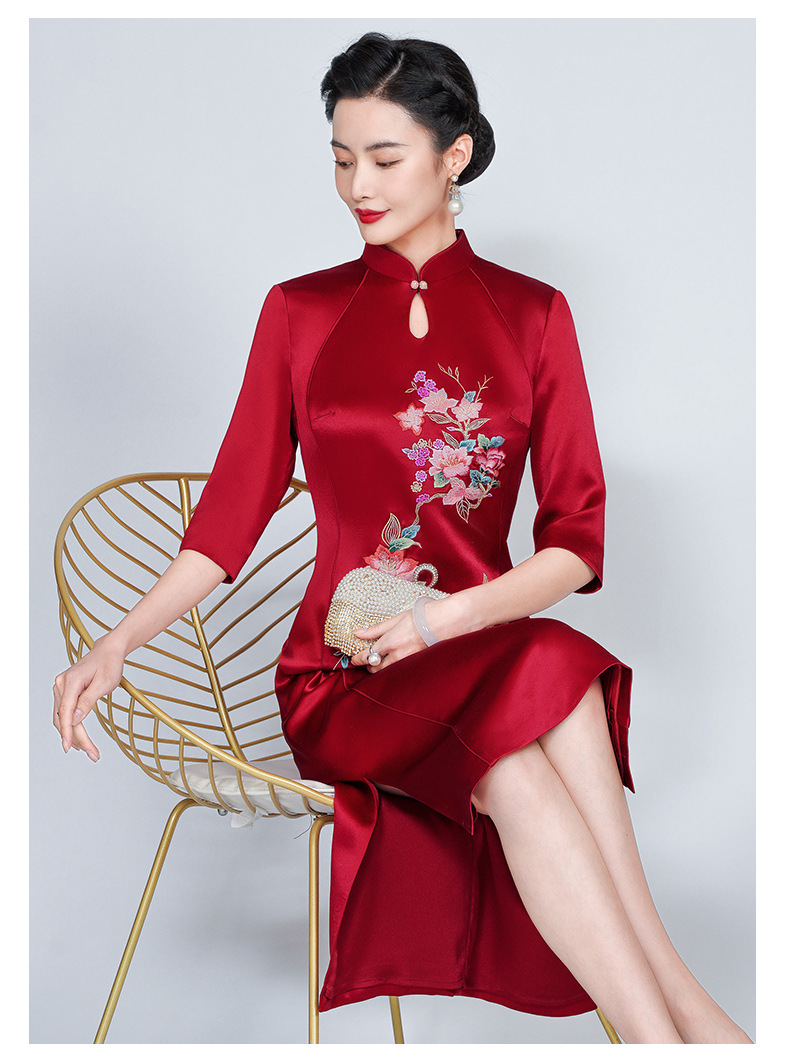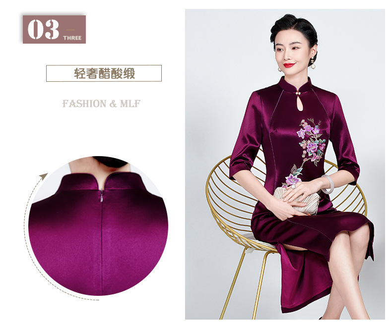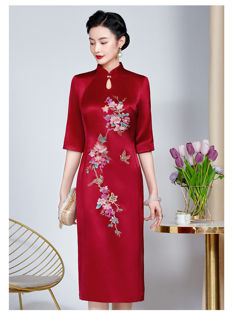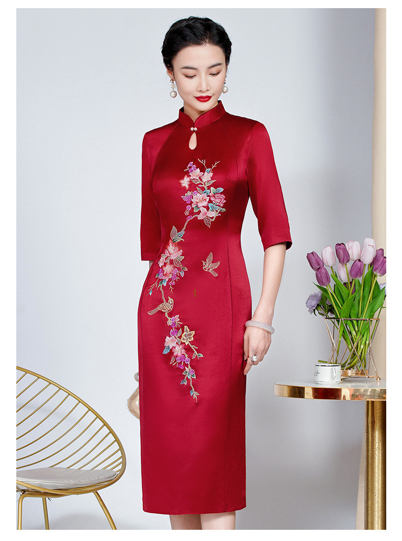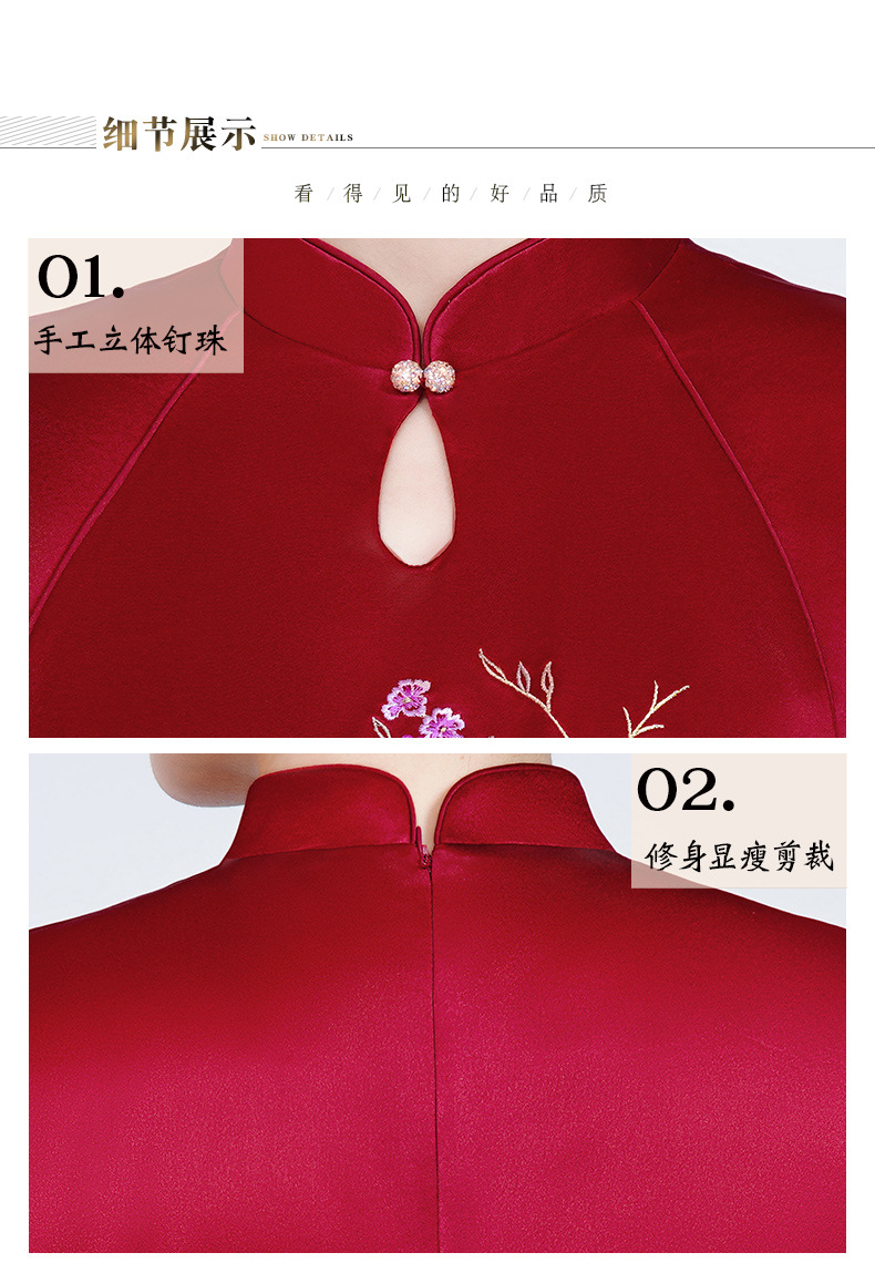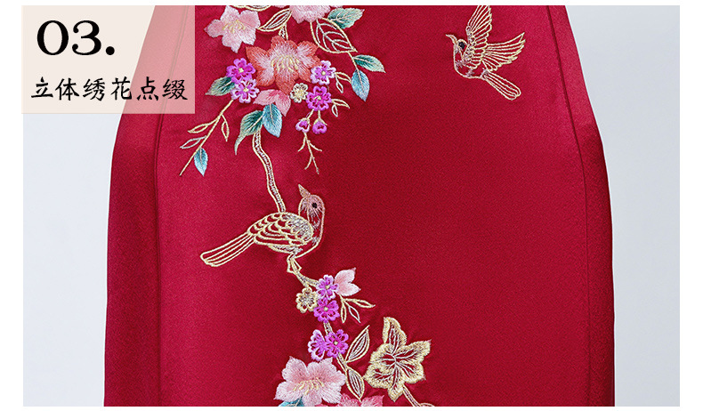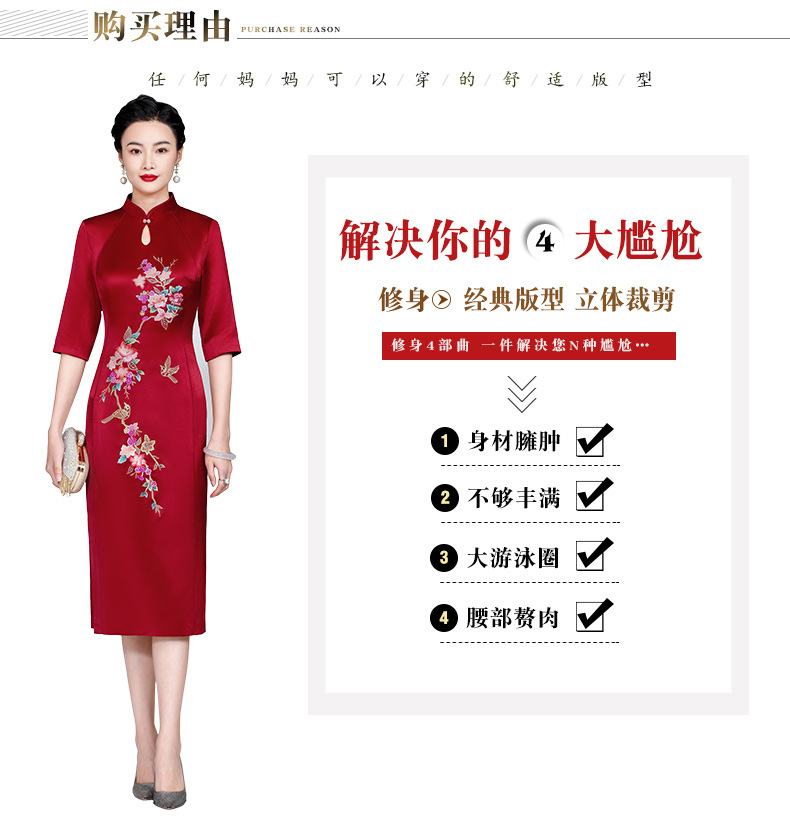 MLY醋酸缎改良妈妈岳母婚宴立领旗袍礼服过膝显瘦气质喜婆婆红色礼服