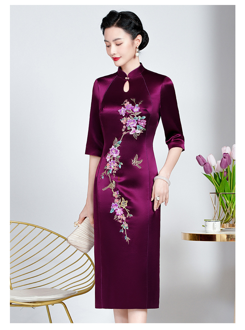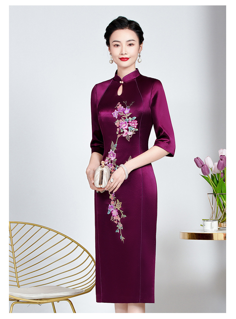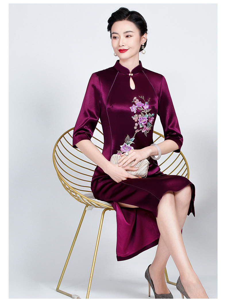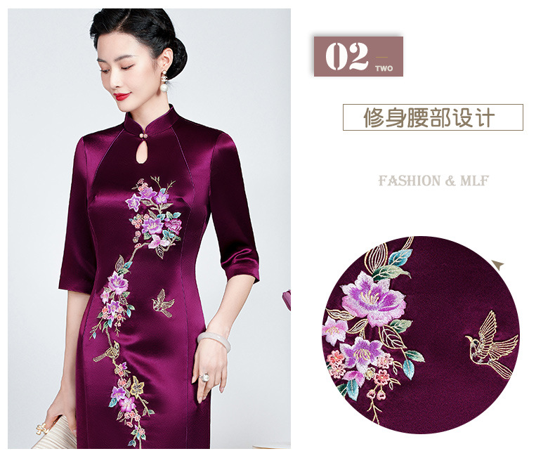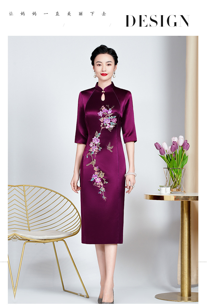 MLY醋酸缎改良妈妈岳母婚宴立领旗袍礼服过膝显瘦气质喜婆婆红色礼服