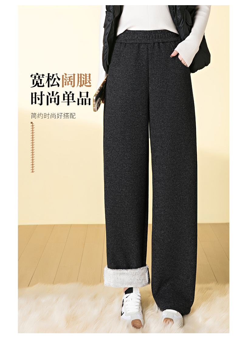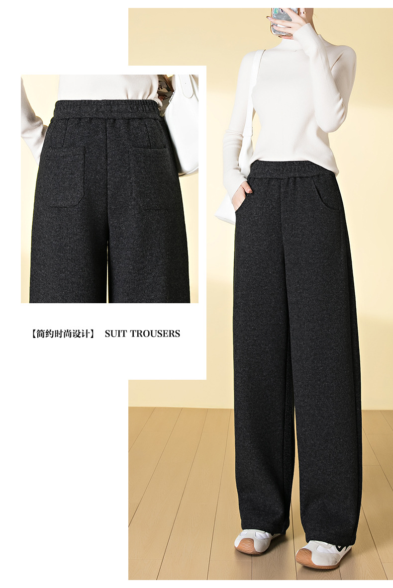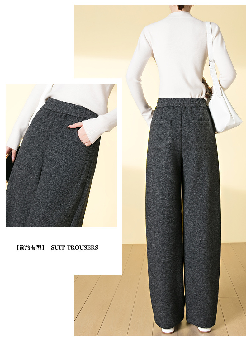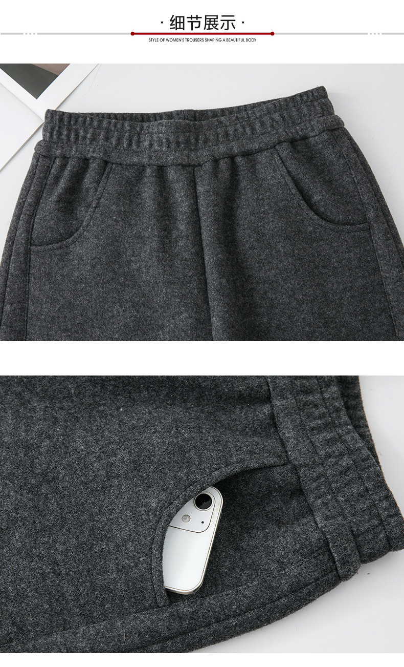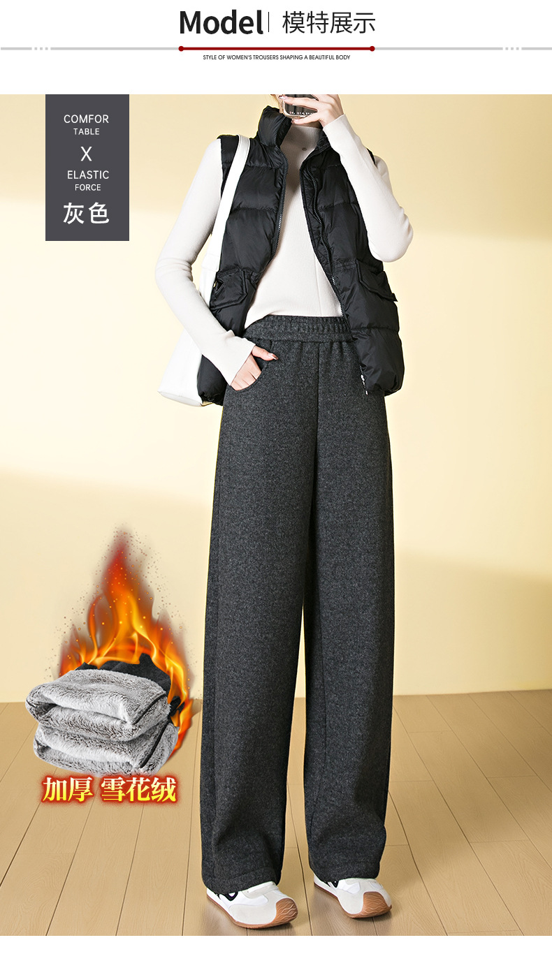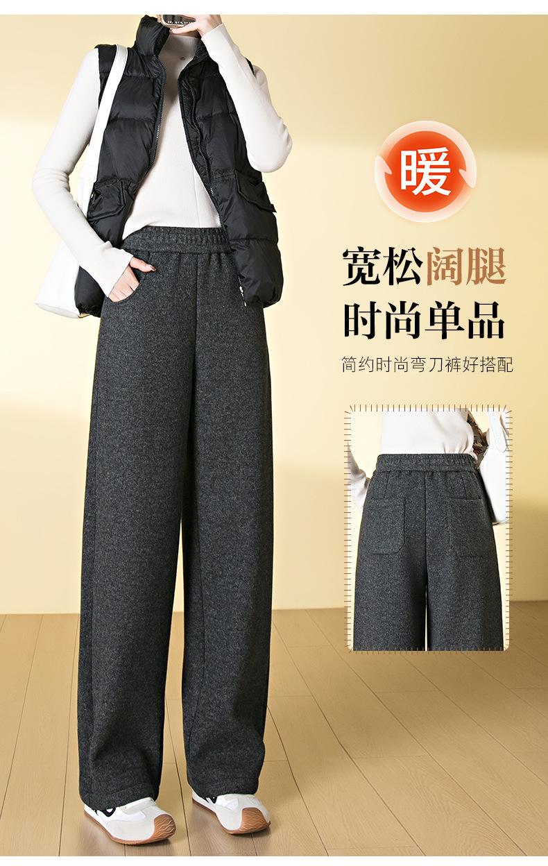 HSS 3091加绒加厚灰色雪花绒弯刀裤松紧腰保暖羊毛呢阔腿裤