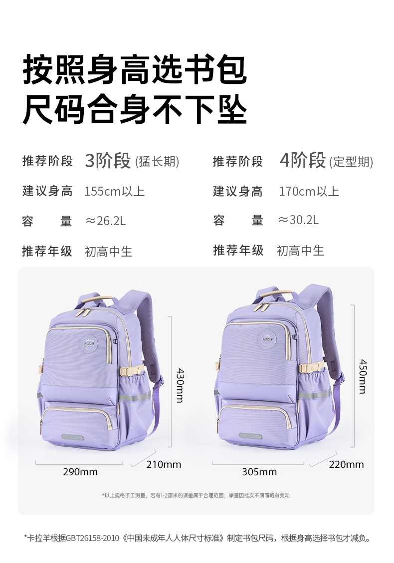 卡拉羊26.2L/30.2L中学生5维减负防下坠护脊风琴书包大容量双肩包领航 CX5190/L