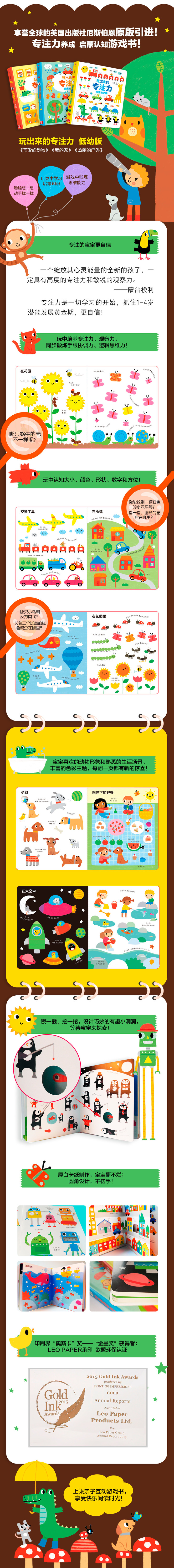 这是一套合适1-4岁小朋友阅读的专注力养成启蒙认知游戏书,分别以宝宝最熟悉的动物和家庭、户外为主题,共三册:《可爱的动物》《我的家》《热闹的户外》。