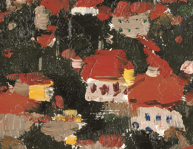 画作中,吴冠中更多的使用了纯色,红的绿的颜色基本上是直接涂抹、铺施在画面上的。他没有过分强调形似,而是着重刻画了八大关风景中的自然色彩,更多地强调了色彩作为艺术语言本身所具有的表现力。