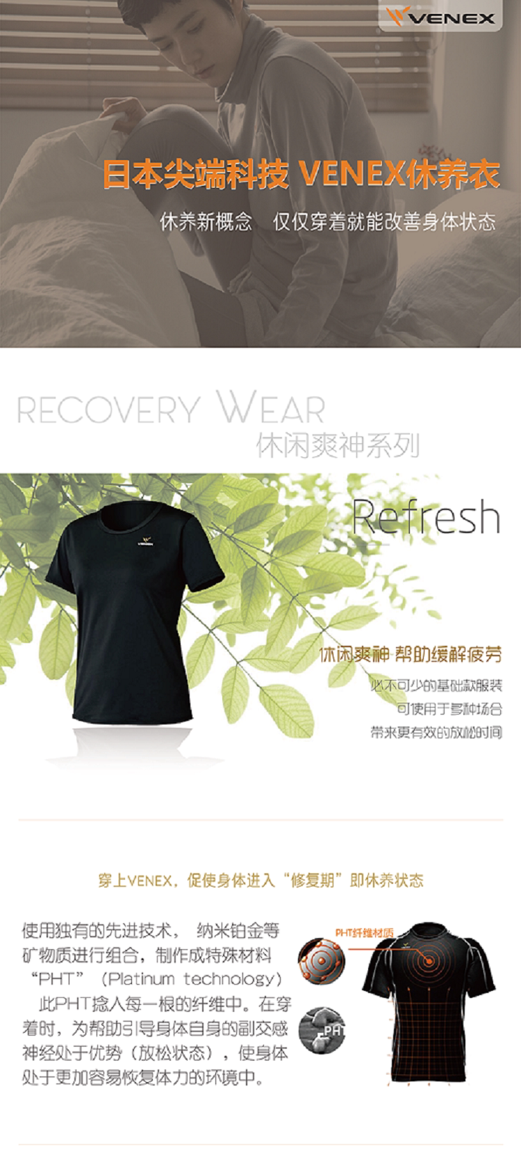 日本VENEX威耐可适 抗疲劳缓解疼痛促睡眠功能衣原装进口爽神女款T恤衫 Refresh