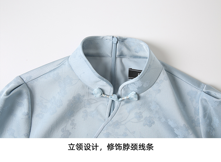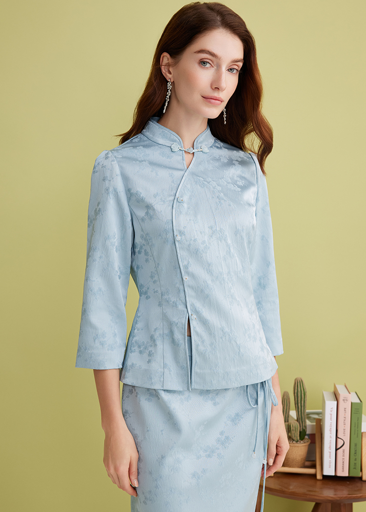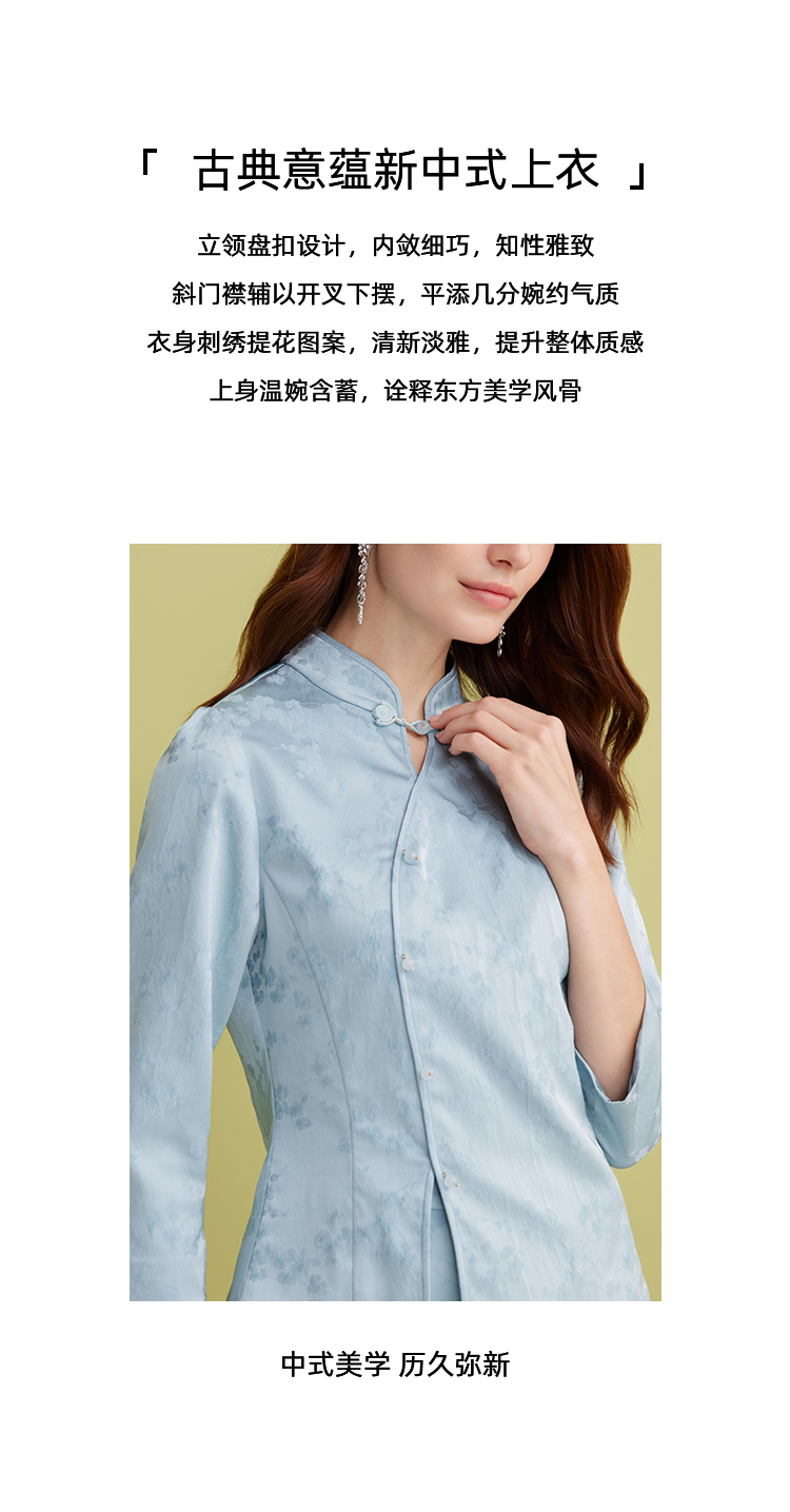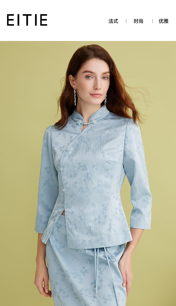 EITIE爱特爱新中式立领盘扣不对称收腰蓝色显瘦上衣2025春季新款A2513501