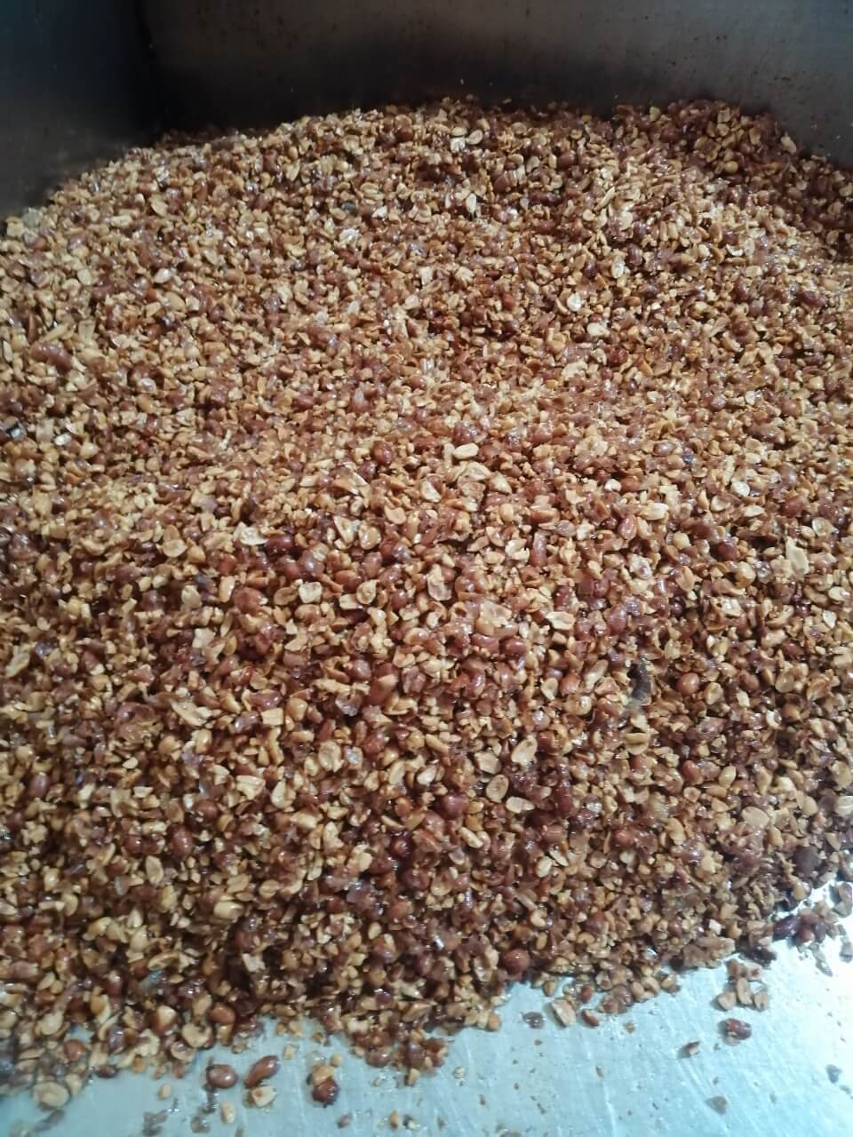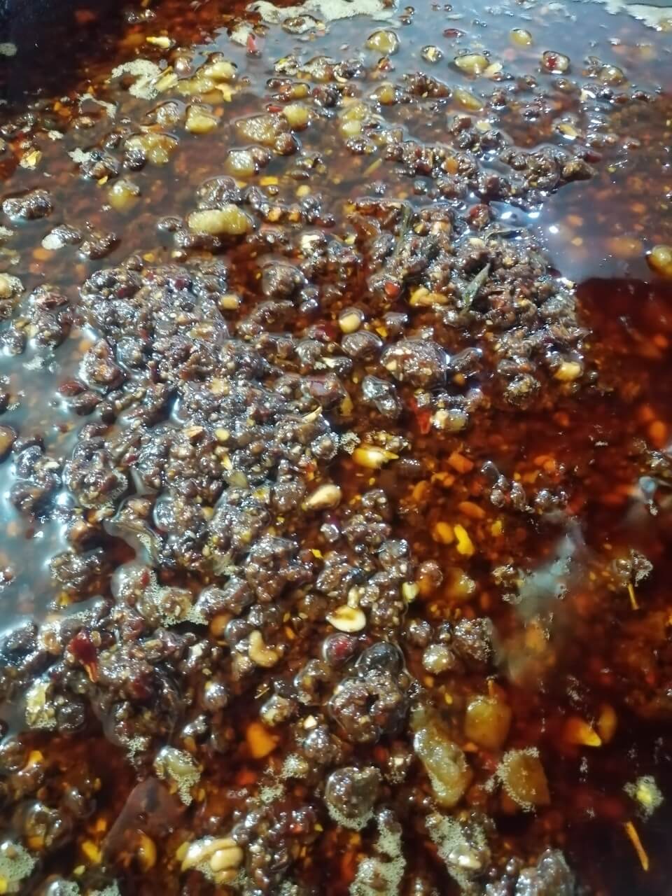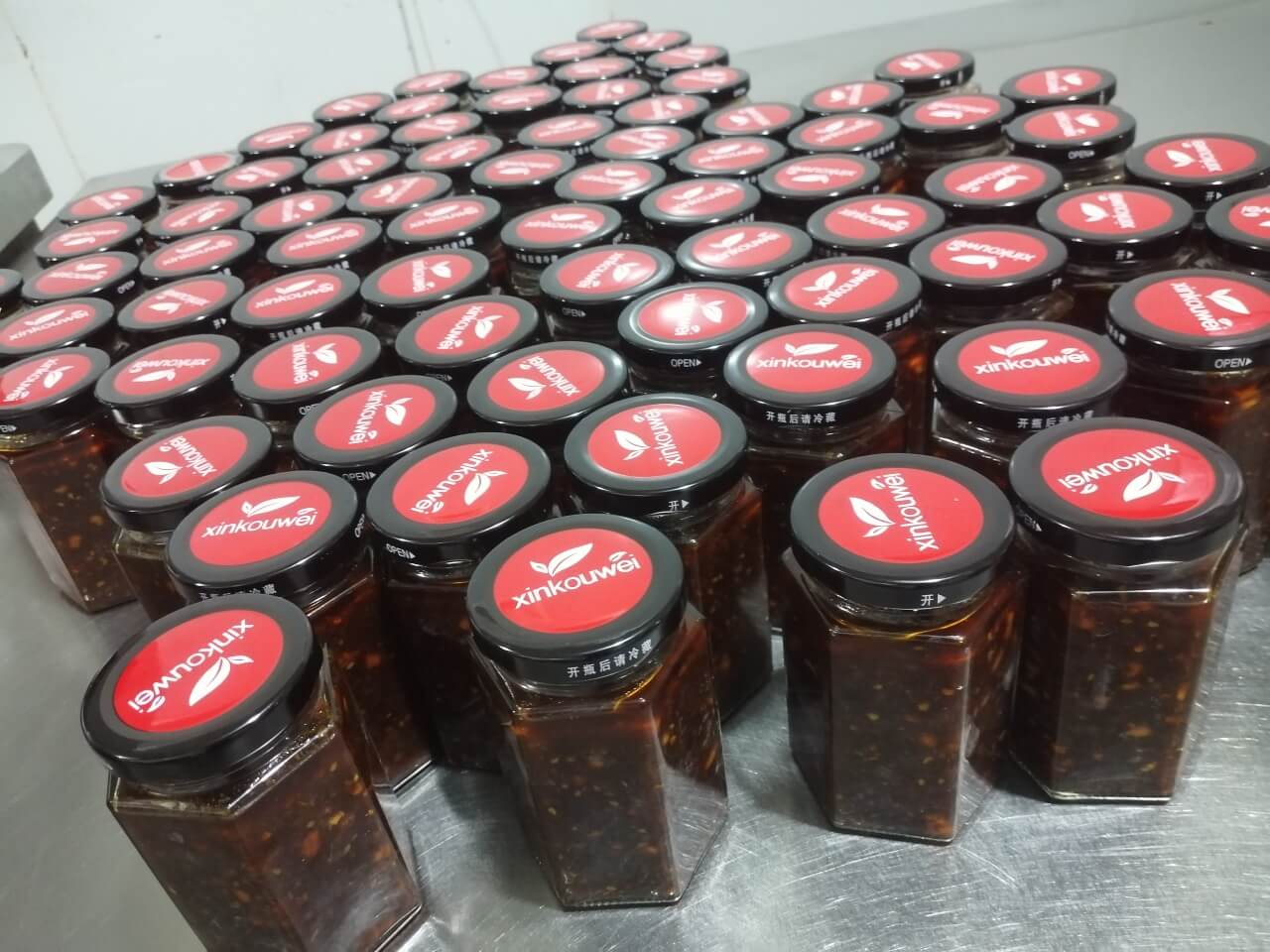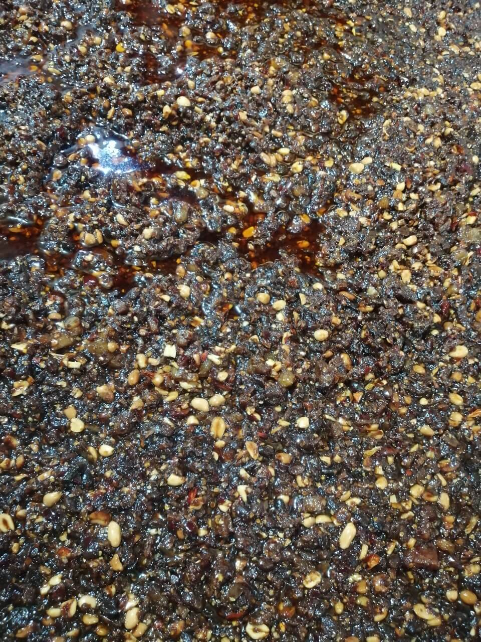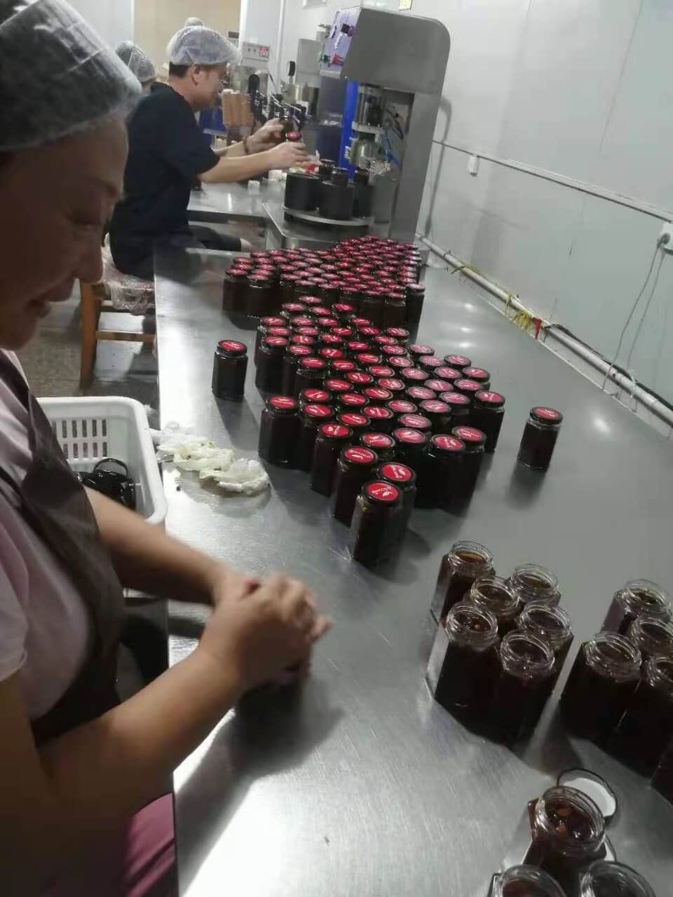 炒制有机花生后压碎,有机黑猪肉切丁,加入豆瓣酱和油等配料入锅熬制,罐装称重,真空拧盖,缩膜贴标,喷码装箱。