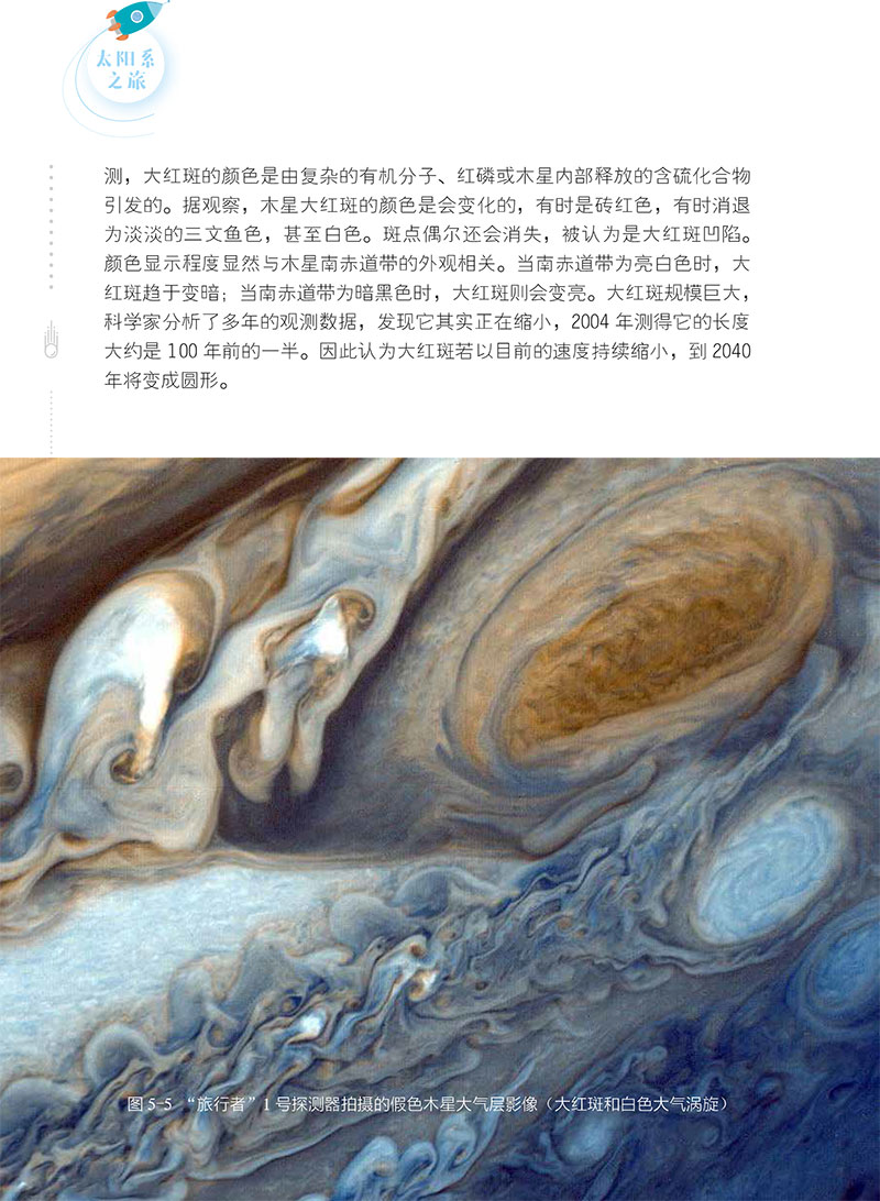 (3)太阳系里最有特色的行星无疑是木星。木星是一颗巨大的气体行星,有绚丽的花纹,可以看到美丽的大红斑在移动。木星的成分与太阳很相似,如果木星总质量增大至现在的80倍,其内部就会有足够强大压力,使里面的氢原子发生热核反应,如果这样的话,我们就会看到太阳系里面有两个太阳。