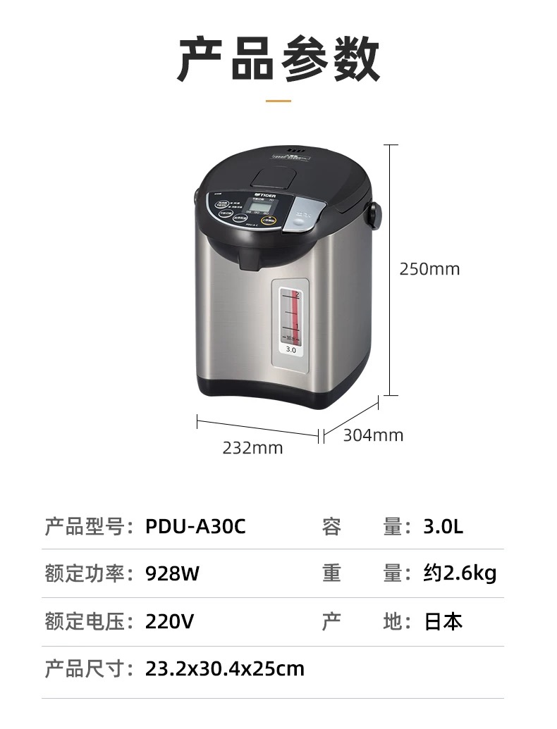 虎牌进口电热水瓶,PDU-A30(黑色)