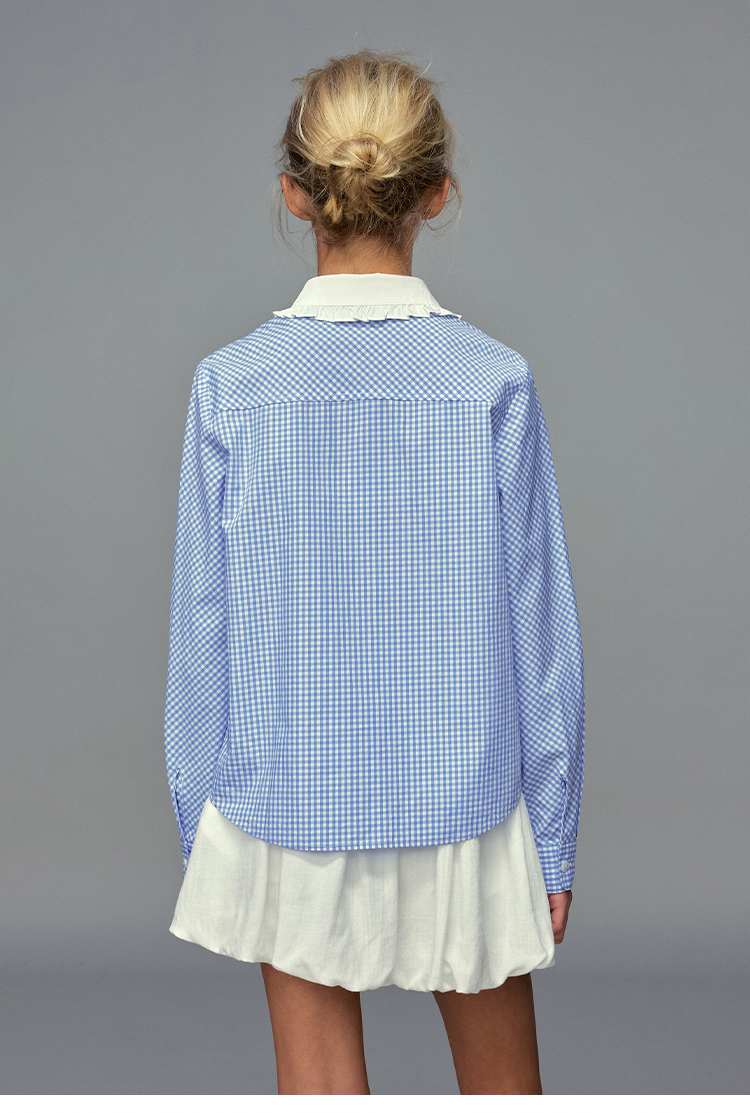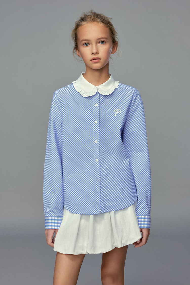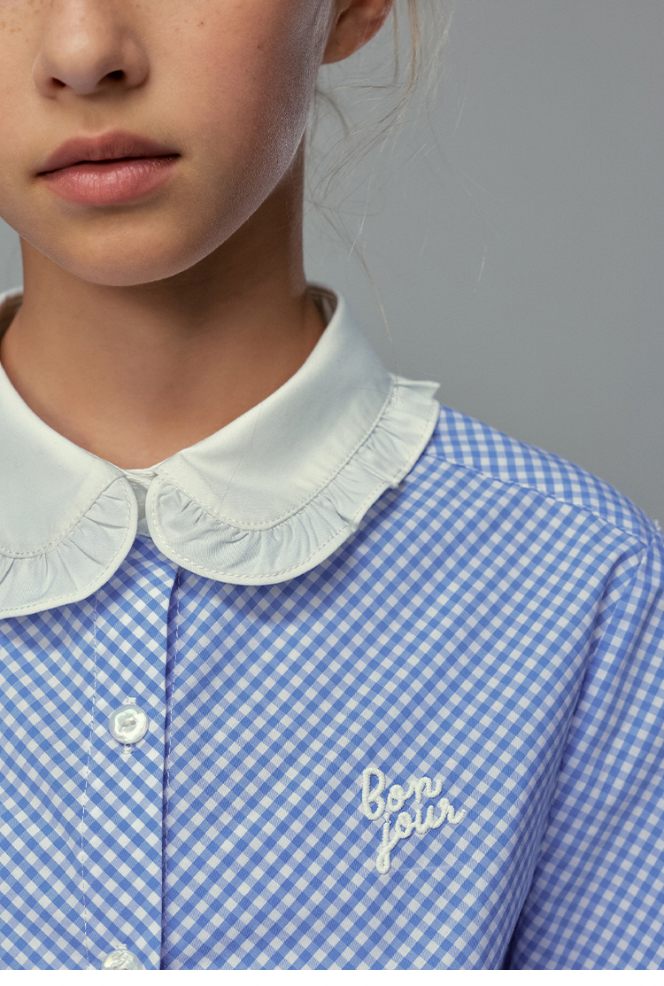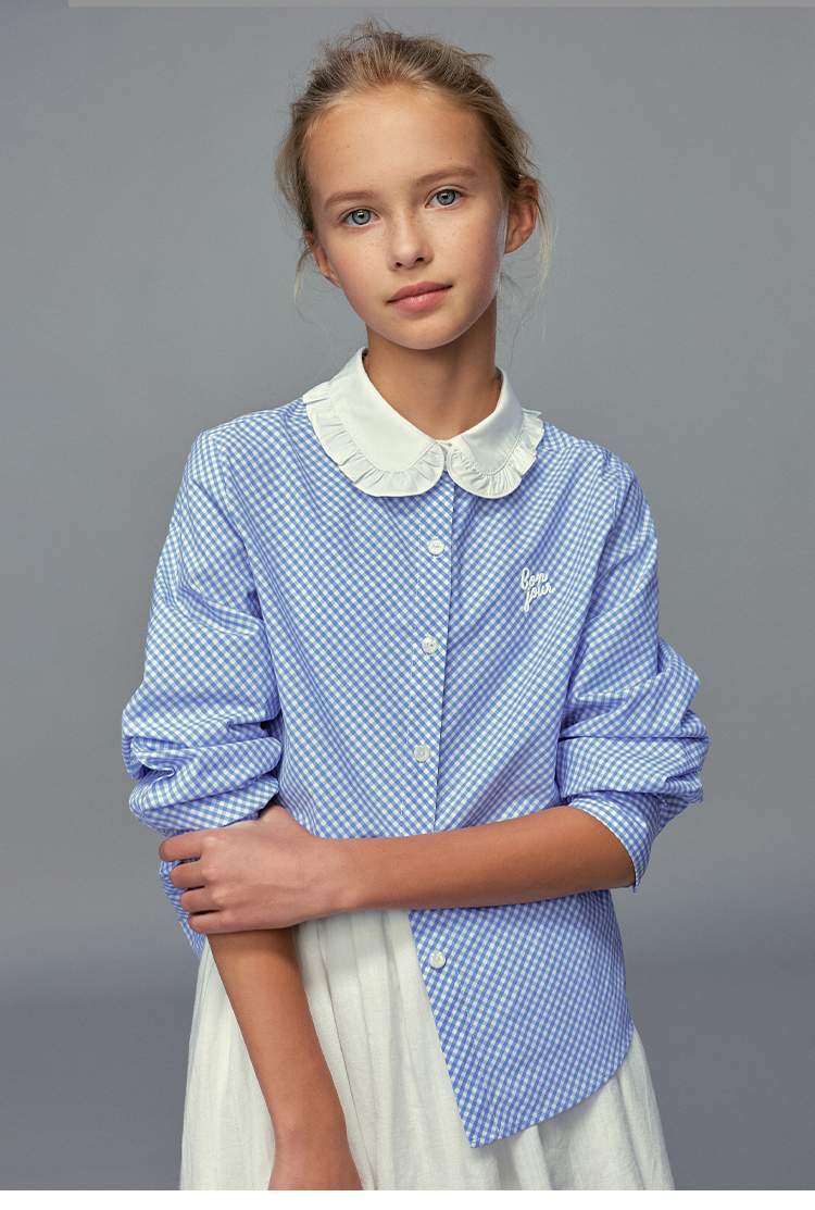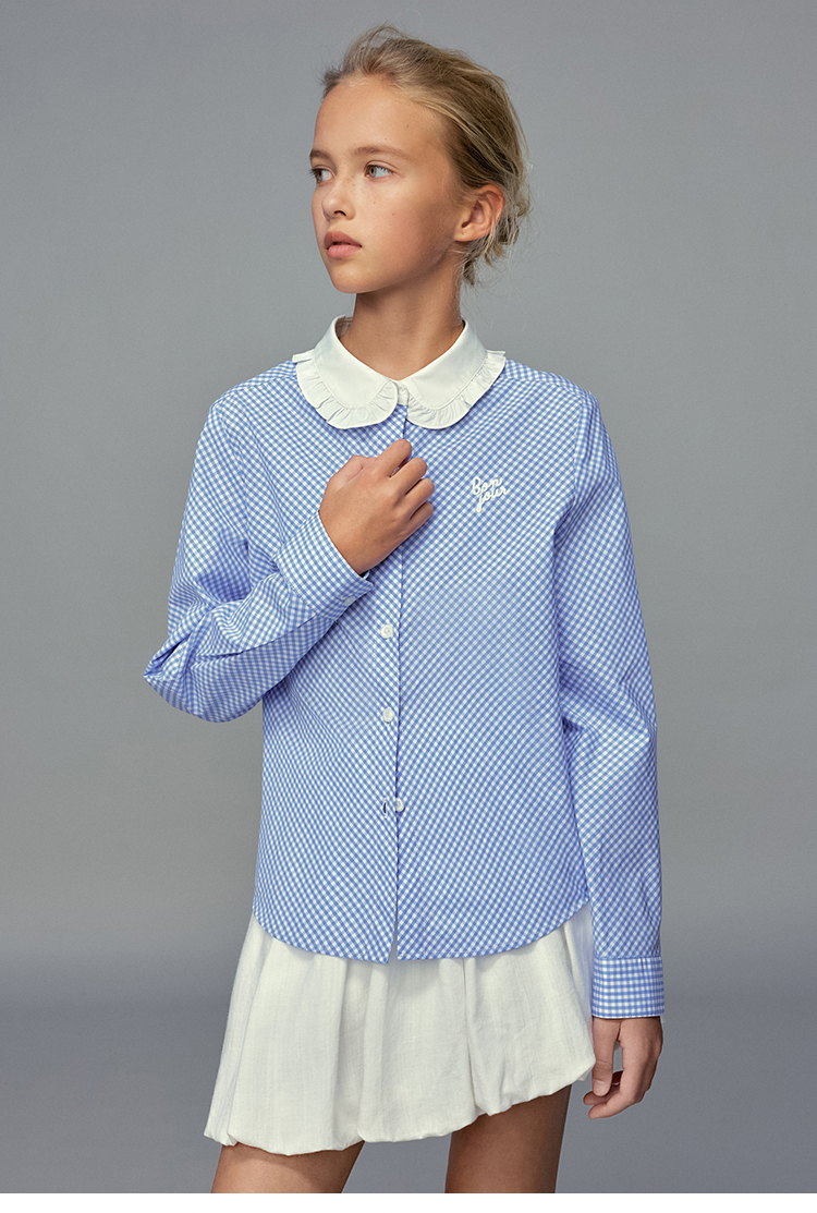 💕春3童装法式荷叶领蓝白格纹长袖衬衫 商品图0