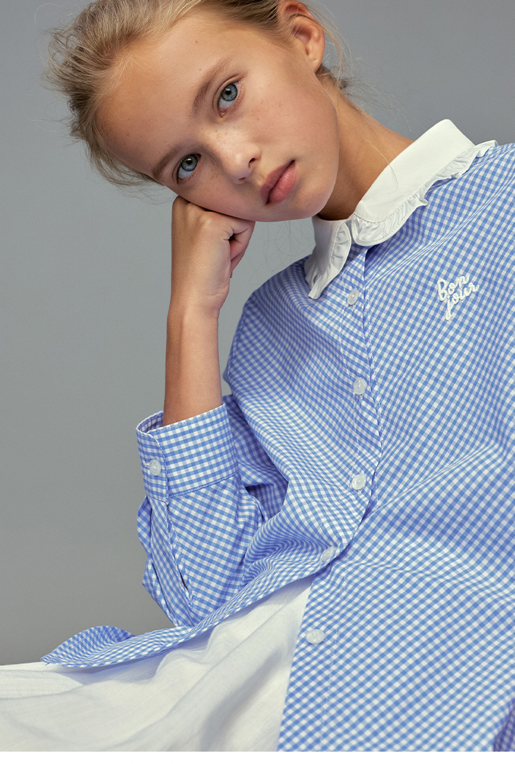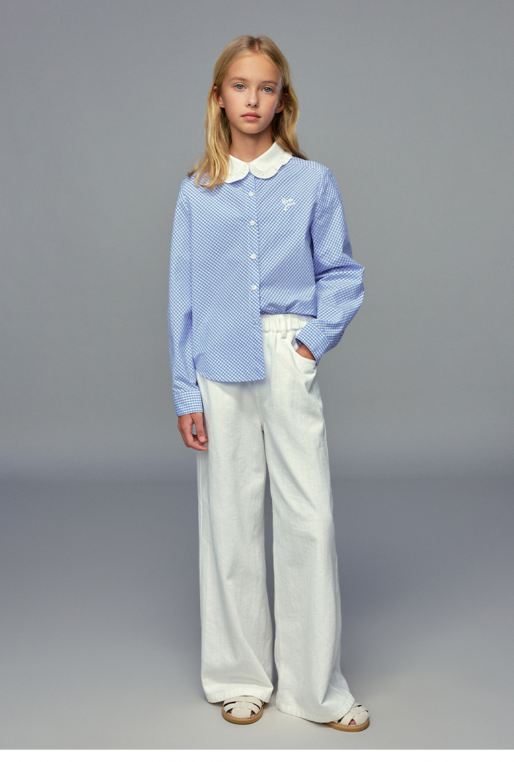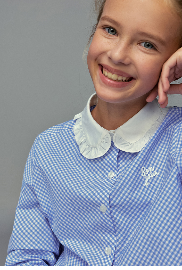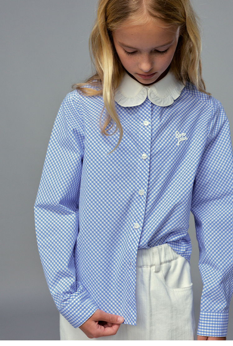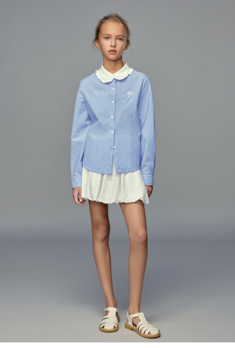 💕春3童装法式荷叶领蓝白格纹长袖衬衫 商品图0