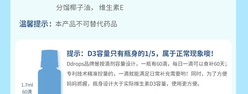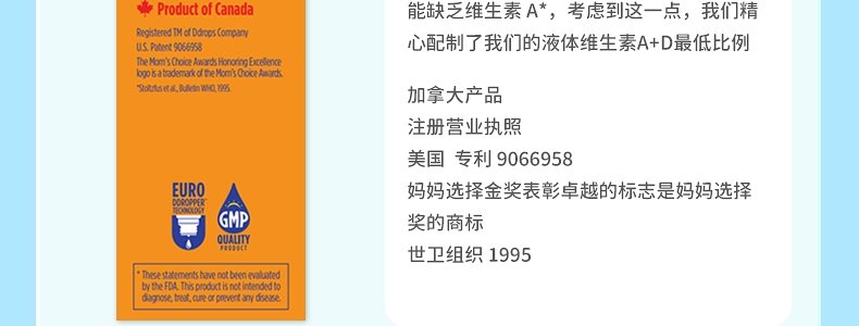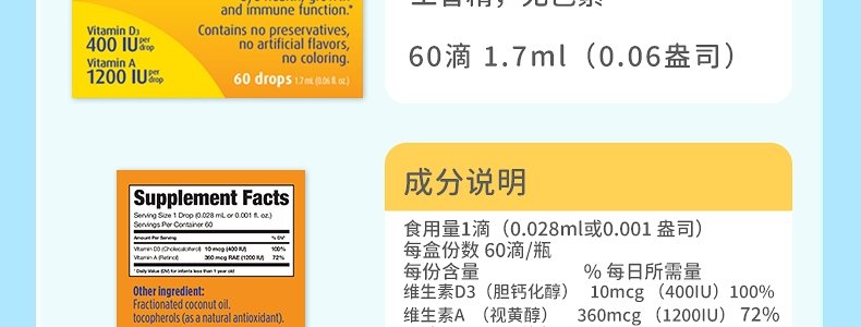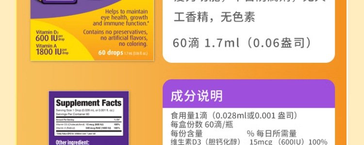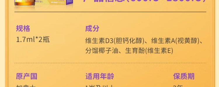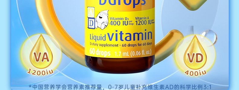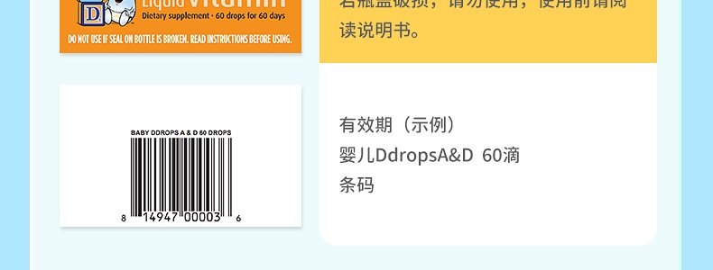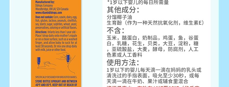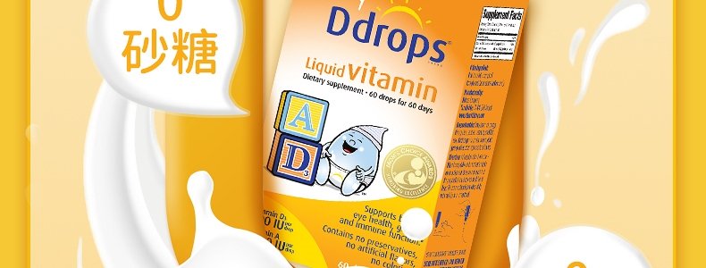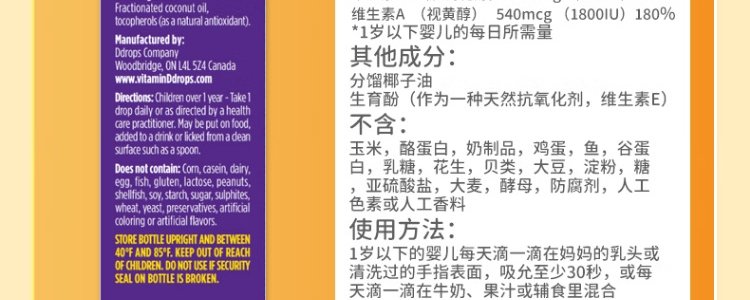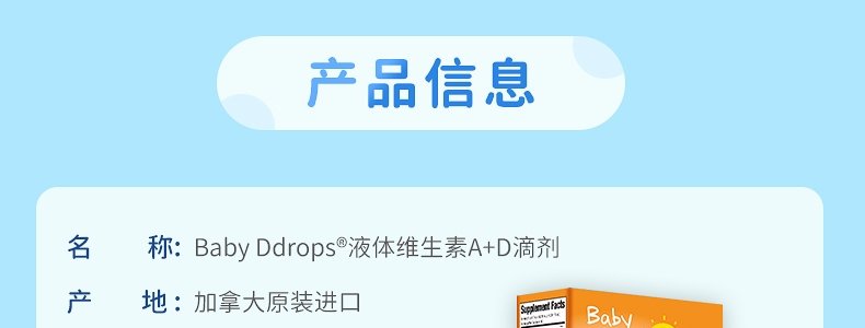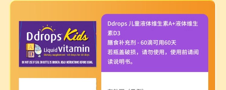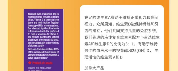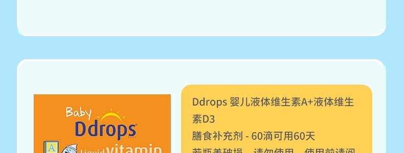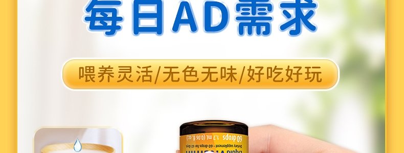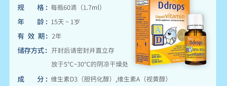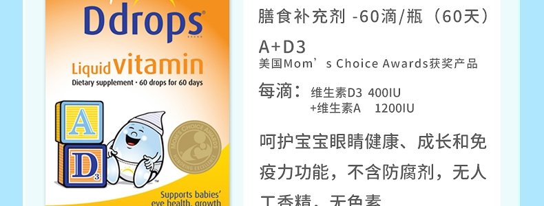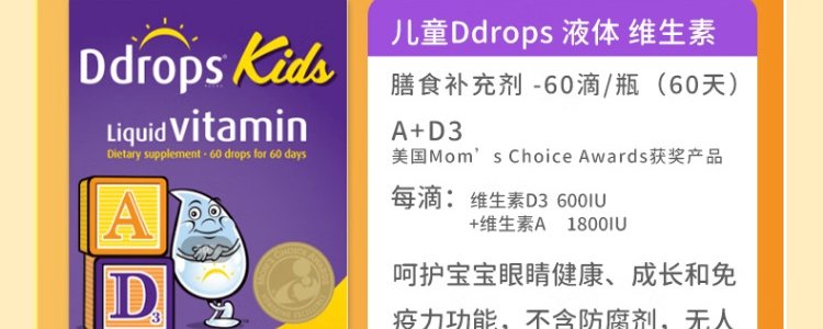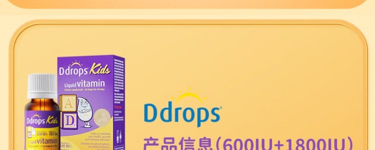 【保税】加拿大 Ddrops 婴幼儿/儿童 维生素A+D滴剂 60滴 天然纯净 助钙吸收