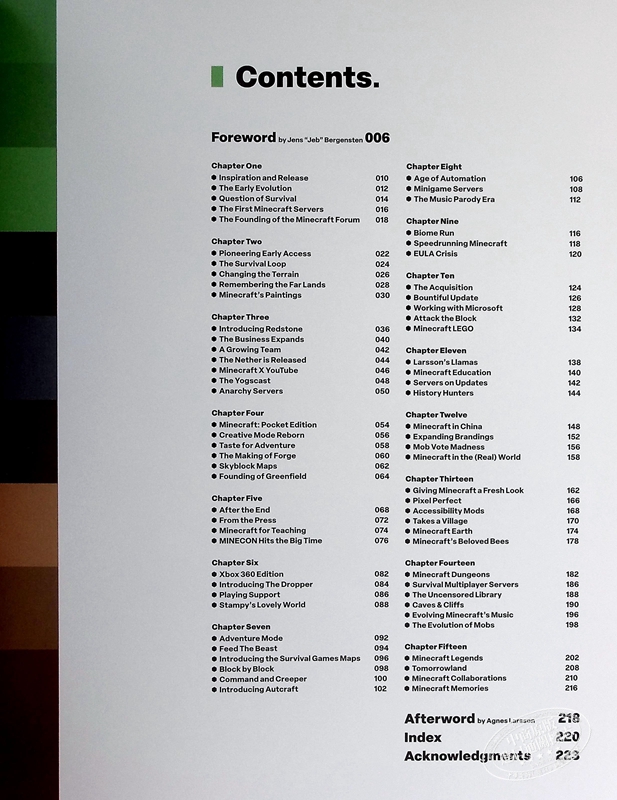 这本收藏品包含创意官 Jens “Jeb” Bergensten 和原版 Minecraft 游戏总监 Agnes Larsson 撰写的前言和后记,以及原创概念艺术、精美细致的渲染图和之前从未见过的档案材料,这些资料说明了这款游戏在起初十五年的发展历程。在这部记录 Minecraft 故事的书中,您可以回顾游戏的过去时代,展望未来。