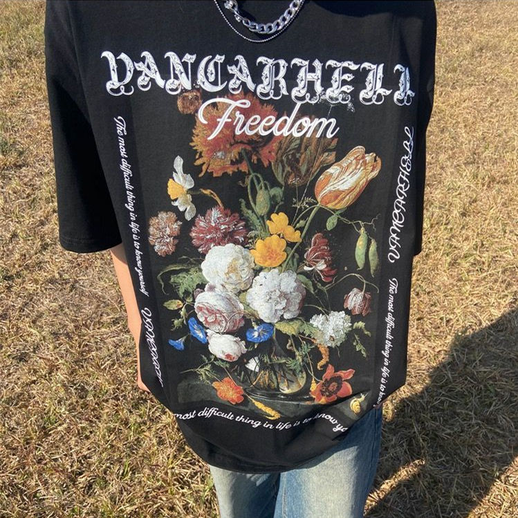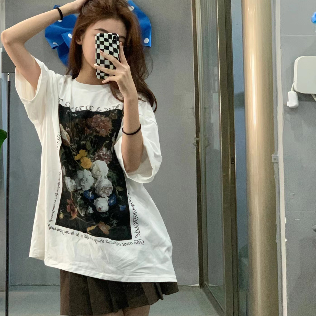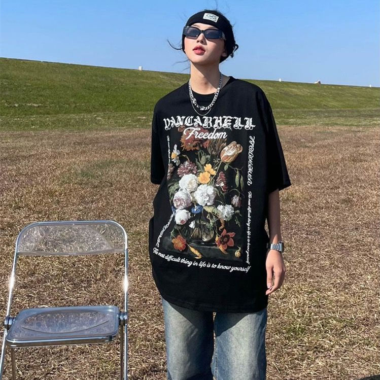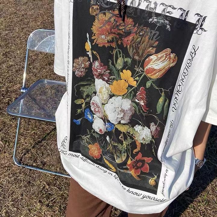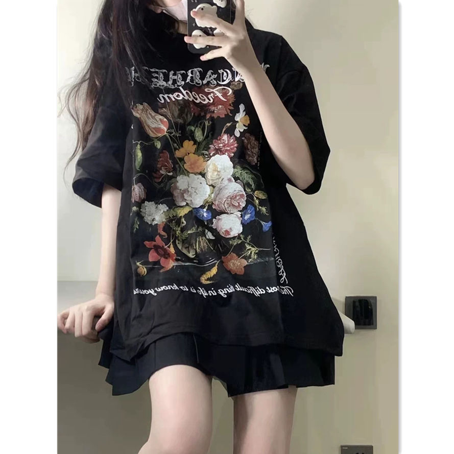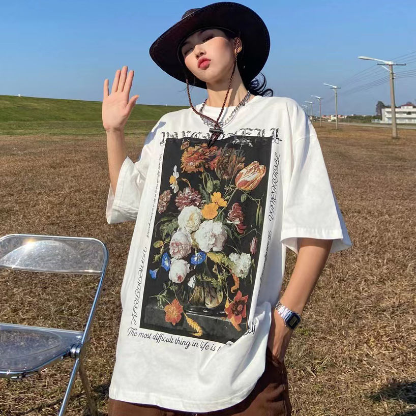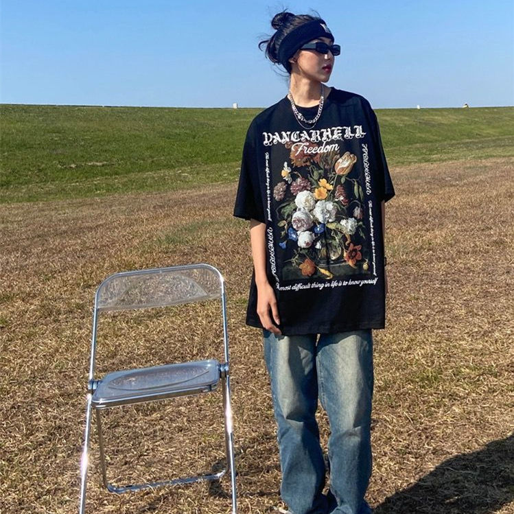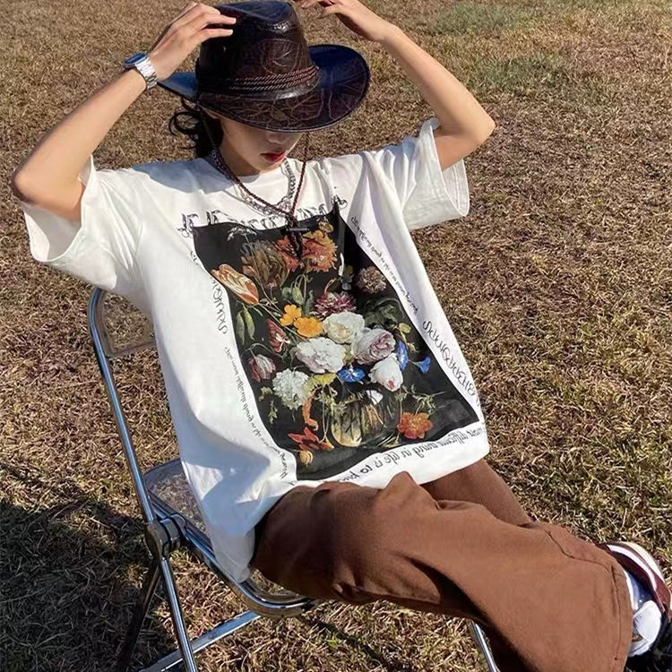 【美式复古花卉短袖T恤,时尚美观】黛唯梵爆款纯棉T恤,2022新款,小众设计上衣热卖