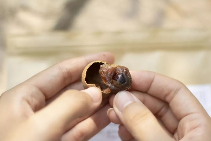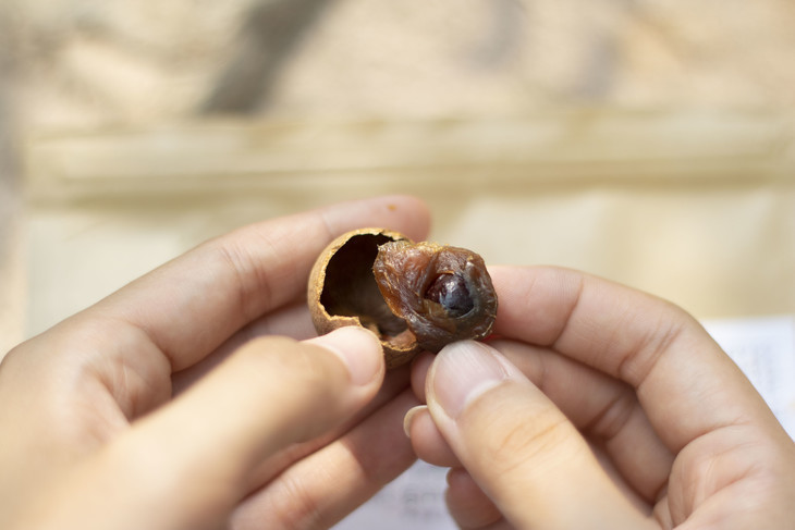 ▲带壳的原只桂圆因为晒制方法不同,会更干一些,剥开,里面的肉是这样黑亮黑亮的。