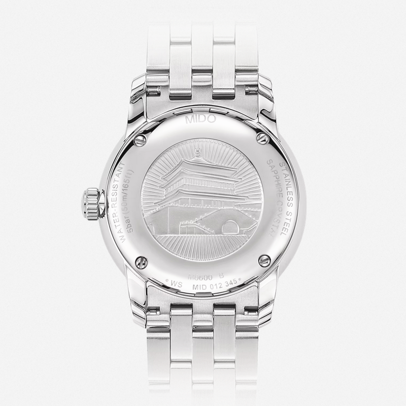 镜面 材质 | 蓝宝石水晶玻璃 | 表盘 | 不锈钢表壳 白色表盘 中国古建筑的代表性设计 – 钟楼建筑的致敬。将典雅的线条感与建筑架构, 通过瑞士的制表工匠, 在方寸之间将精美的制表工艺与独特的设计风格进行结合, 通过腕间时计来赋予这一典型中国建筑风格的崭新意象。 |