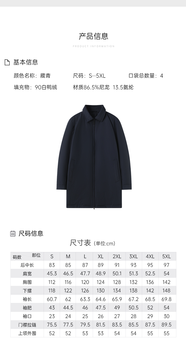 【中长款翻领羽绒服外套】防风保暖羽绒外套 中长款白鸭绒通勤棉服