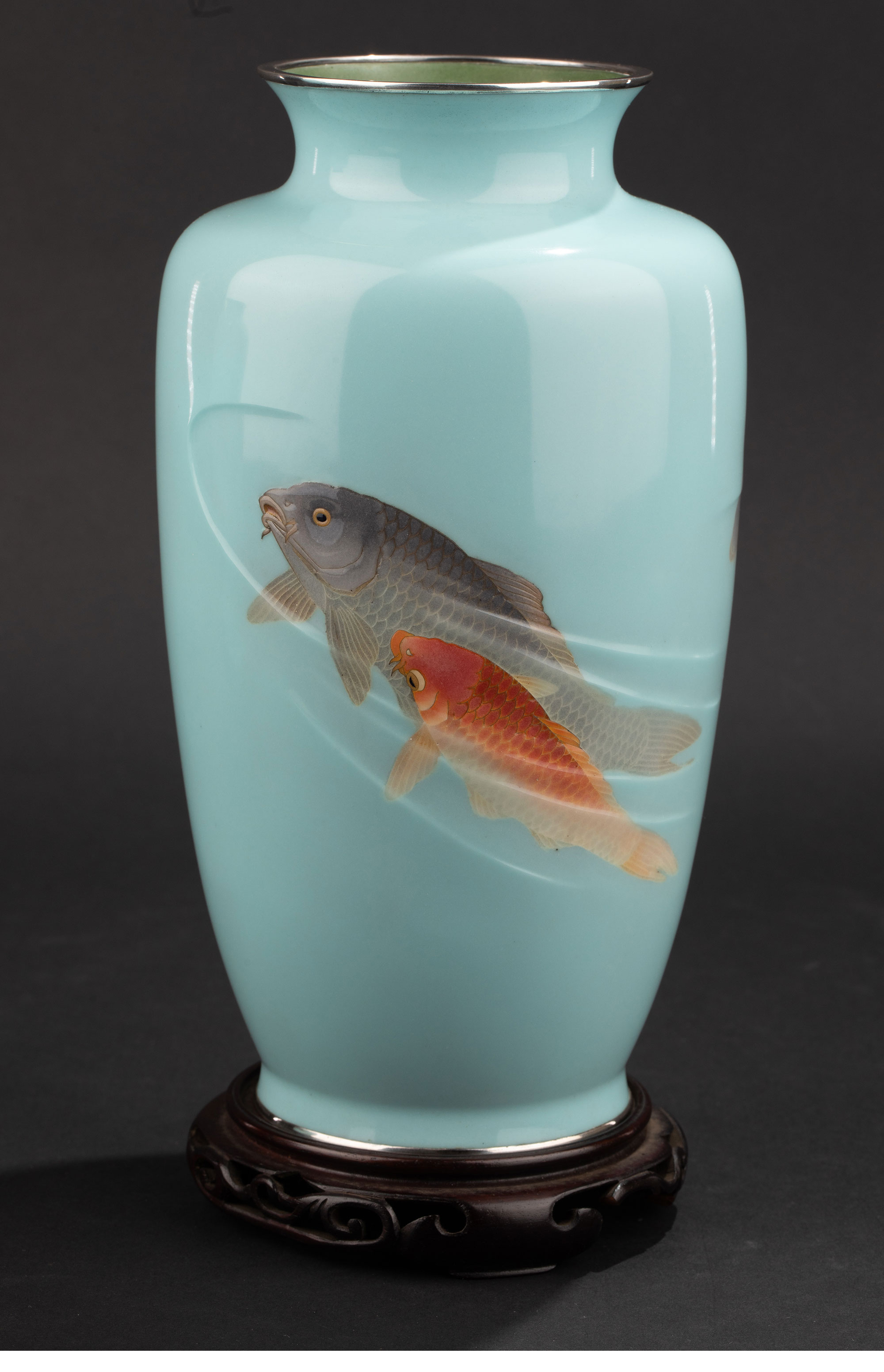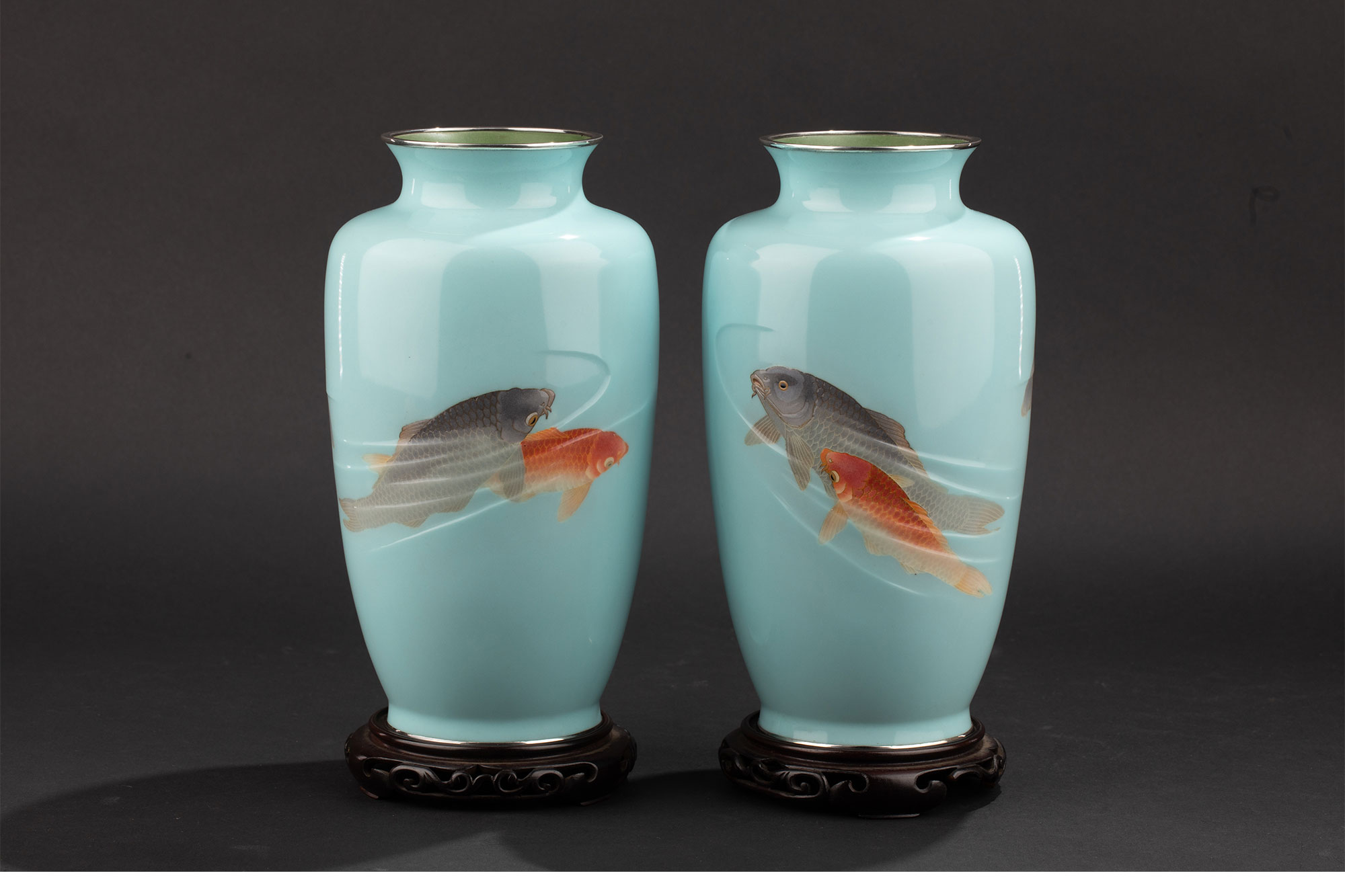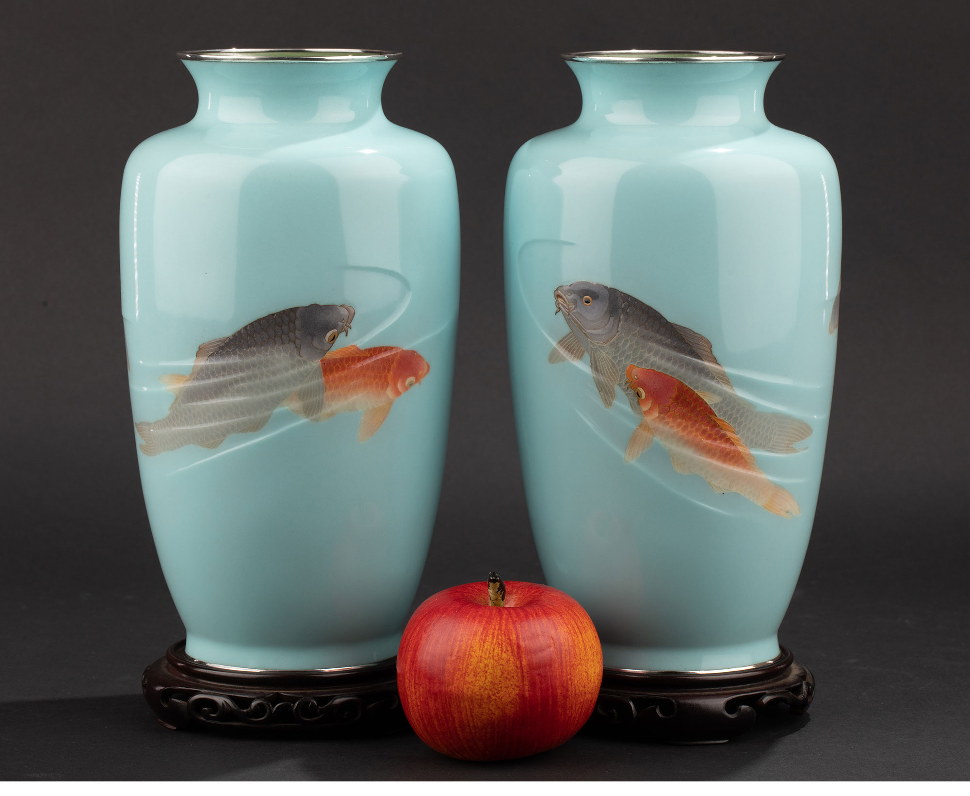 20世纪日本大正时期七宝烧大师権田広助出品「遊鯉」主题七宝烧赏瓶一对