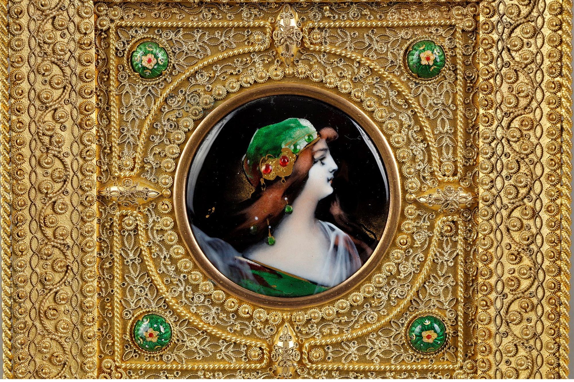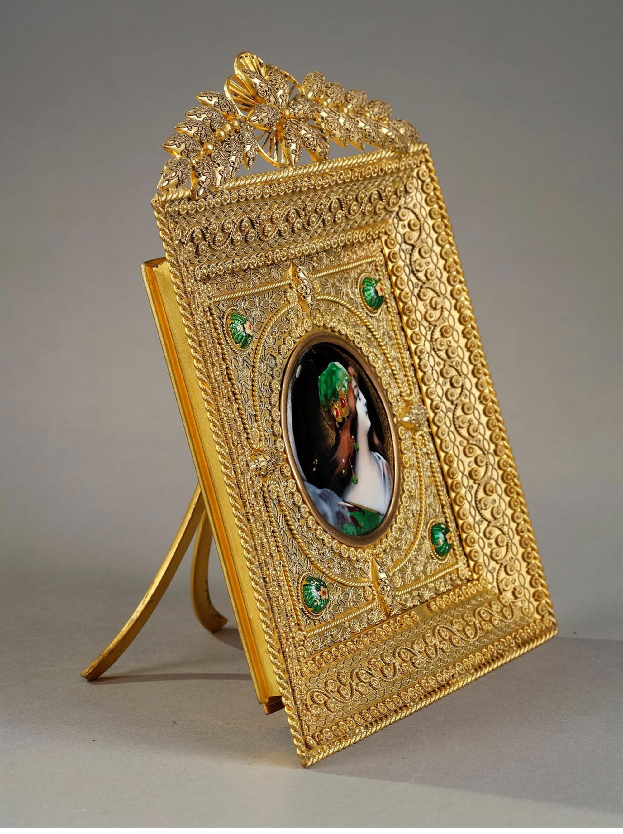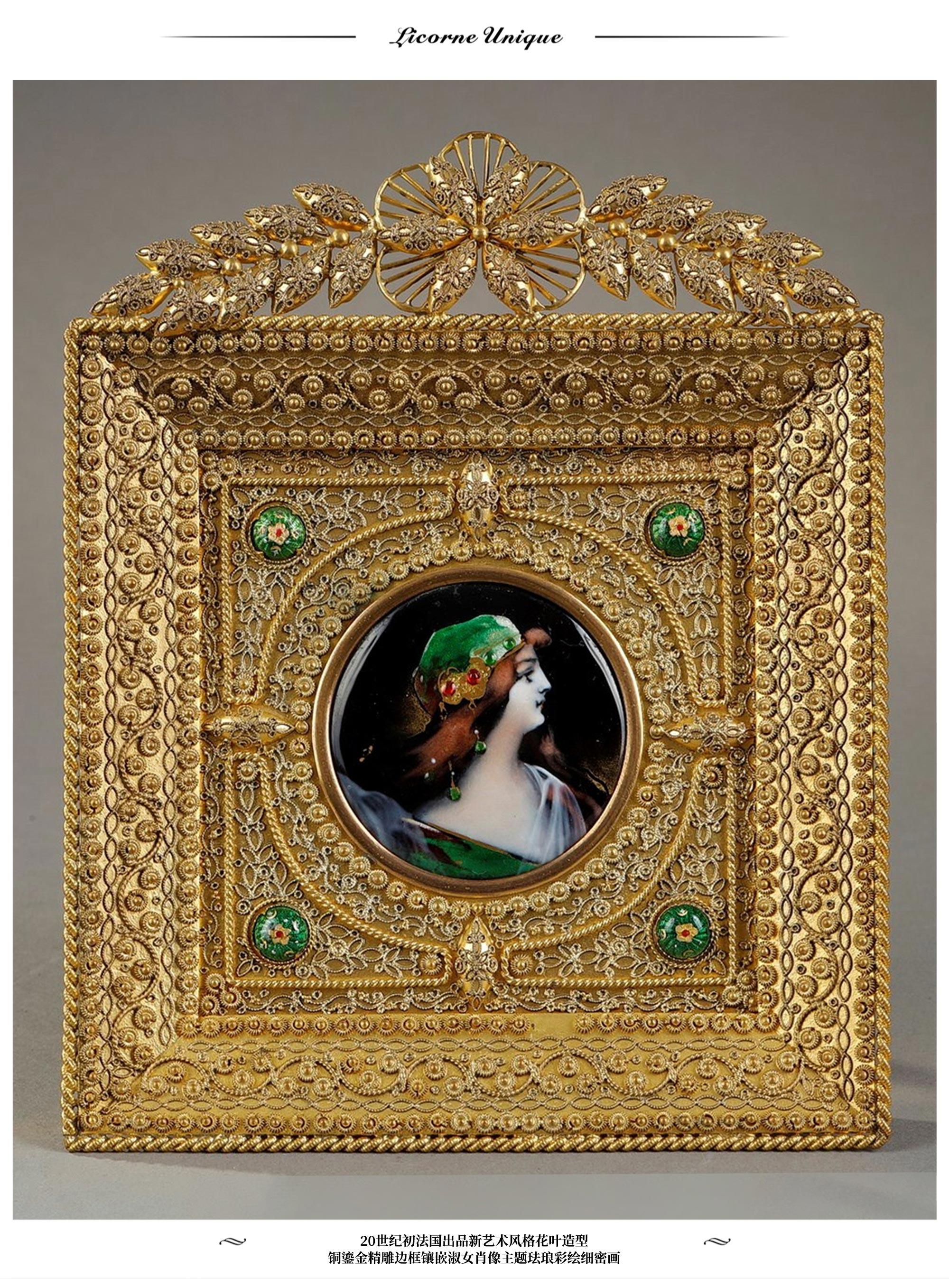 20世纪初法国出品新艺术风格花叶造型铜鎏金精雕边框镶嵌淑女肖像主题珐琅彩绘细密画