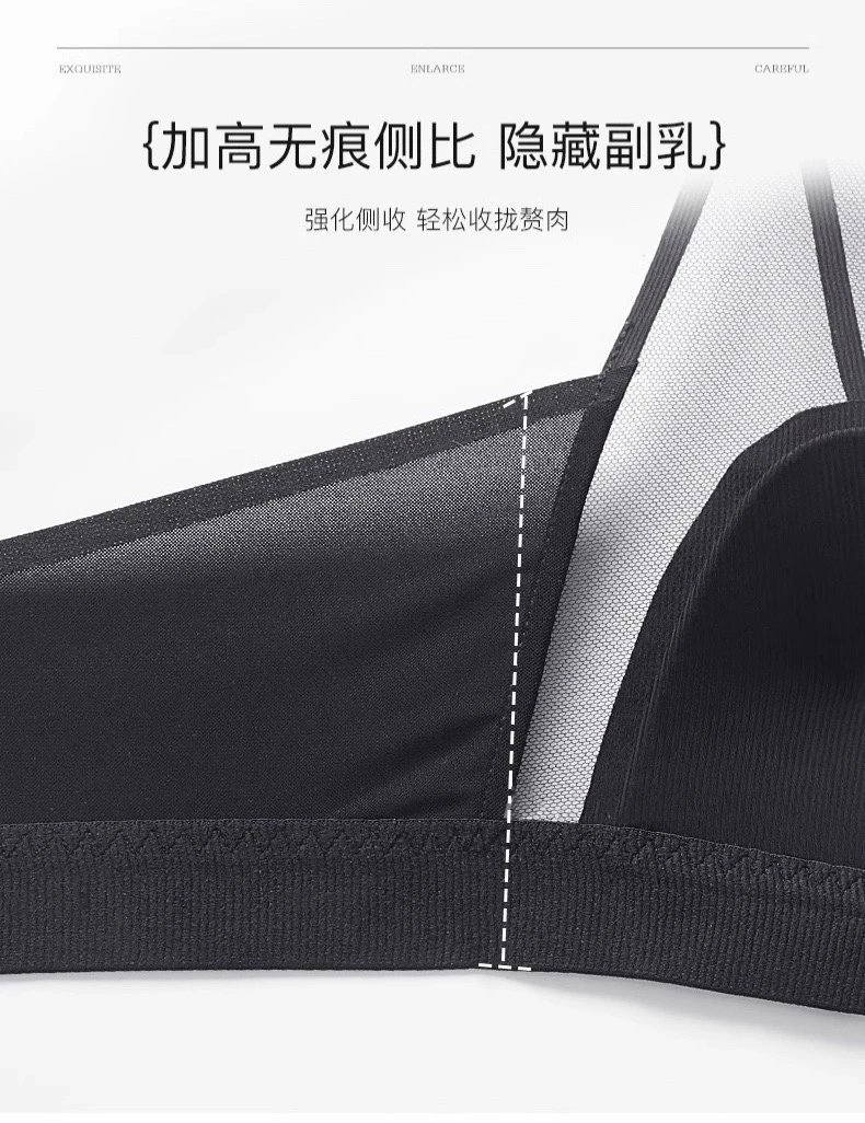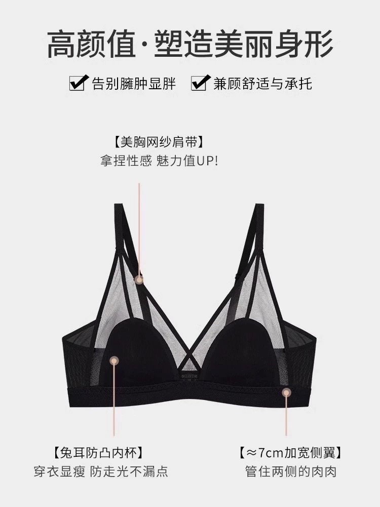 轻薄无钢圈 但不代表“没料”哦~它的软支撑技术可不容小觑。 有姐妹会问看着这么透,日常穿真的不会走光吗?” 这你大可放心,设计师早已想你所想插入兔耳模杯,有小放肆但尺度刚刚好:凸点尴尬不存在 而且整体材质上手摸着触感软软的~滑滑的~丝丝凉~ 怕热汗星人更能深刻体会到它的“福利”,一天8小时下来内衣都不会被热到湿哒哒黏得难受!