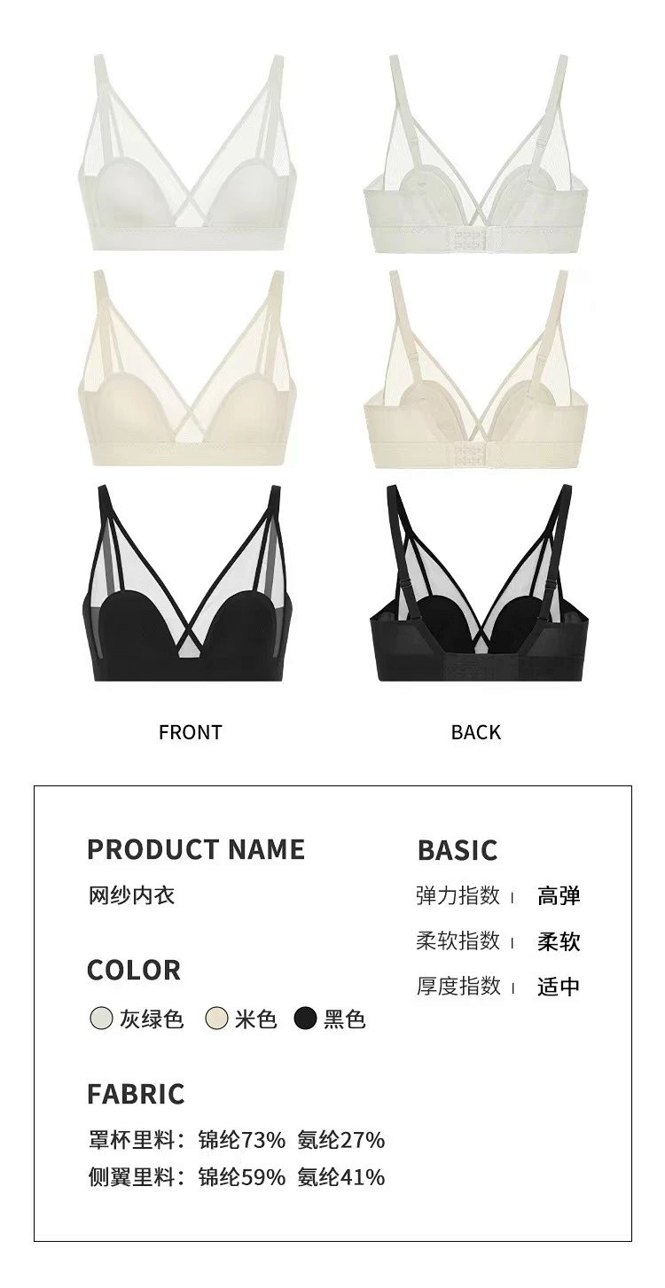 有米色、黑色、灰绿色三色选择,ALL IN不纠结也可以按照衣橱夏装深浅比例的来选择哦~ 任意一款都是疯狂心动的存在!行走的小清新高级范,额外还有小性感 这款精致又舒服的兔耳朵网纱内衣简直是“bra圈天菜”,建议每个女孩儿都要拥有!