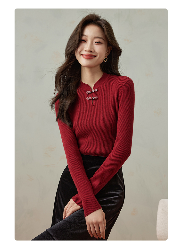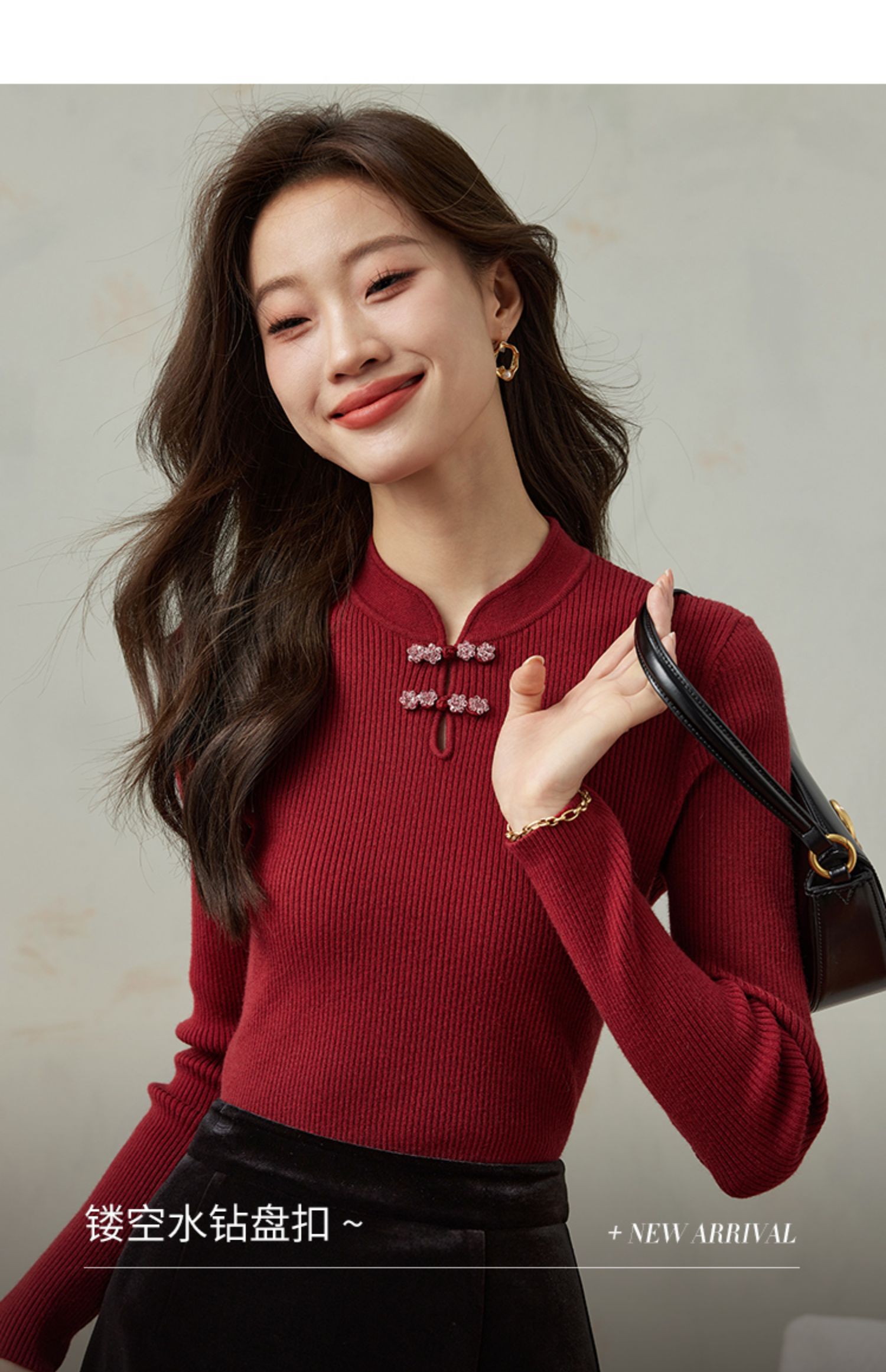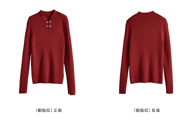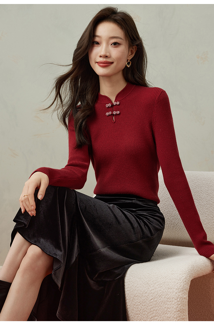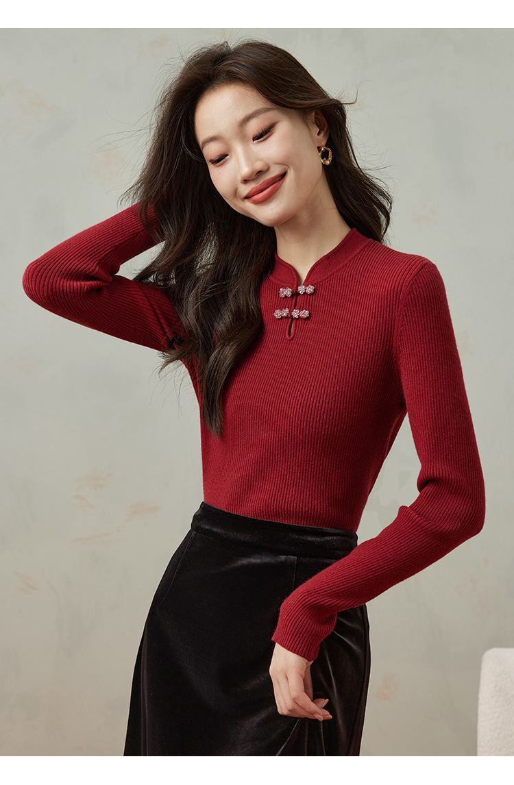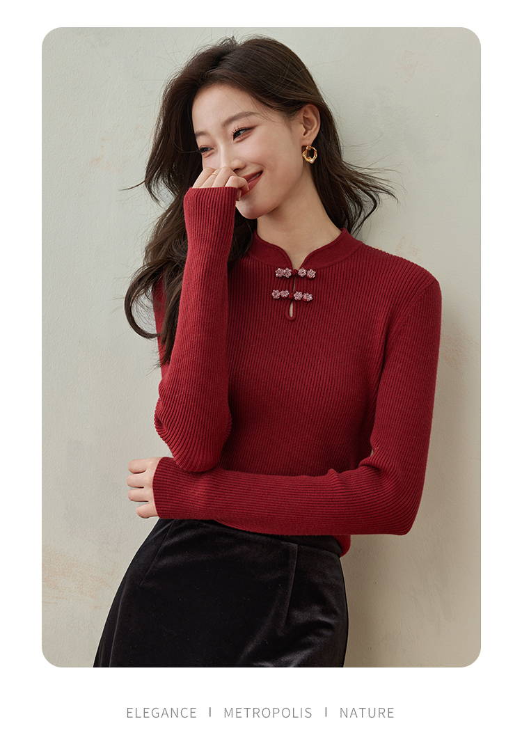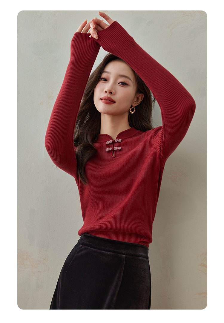 【年终特卖】熙世界新中式国风盘扣红色毛衣女秋冬新款修身显瘦内搭针织打底衫