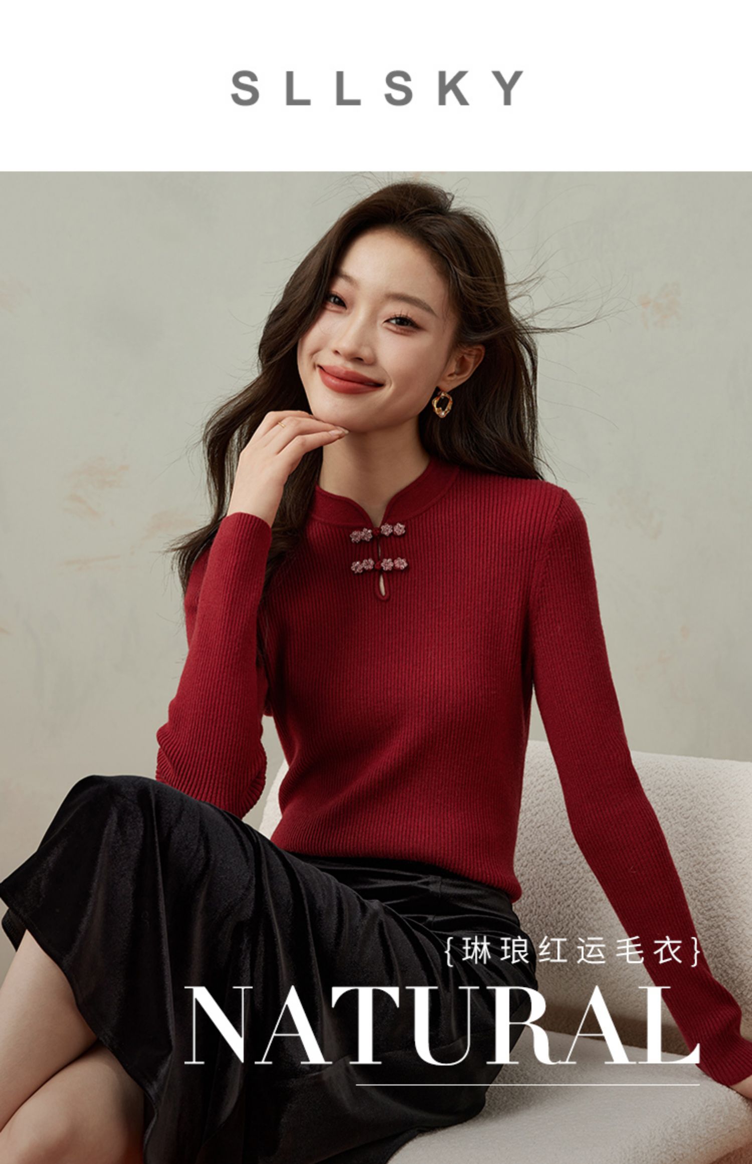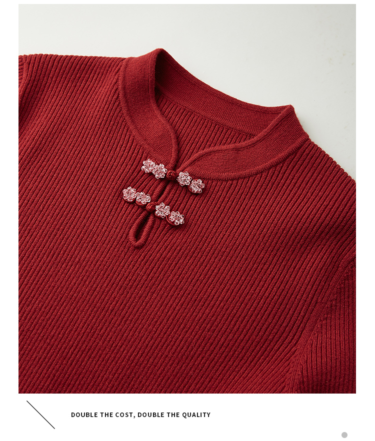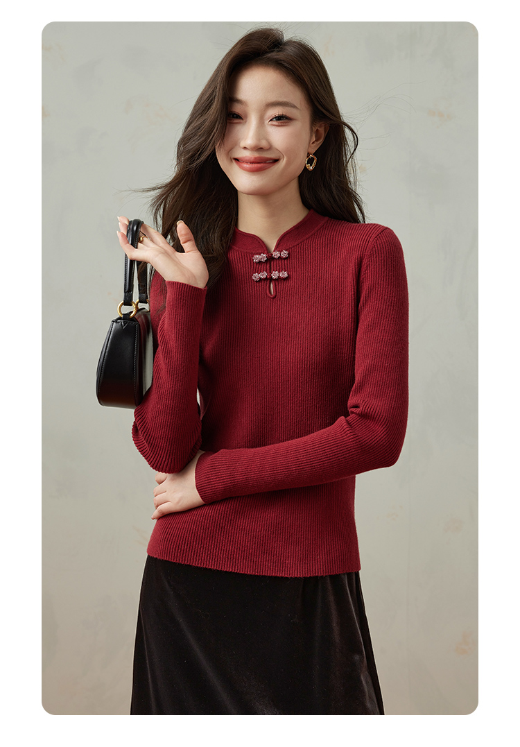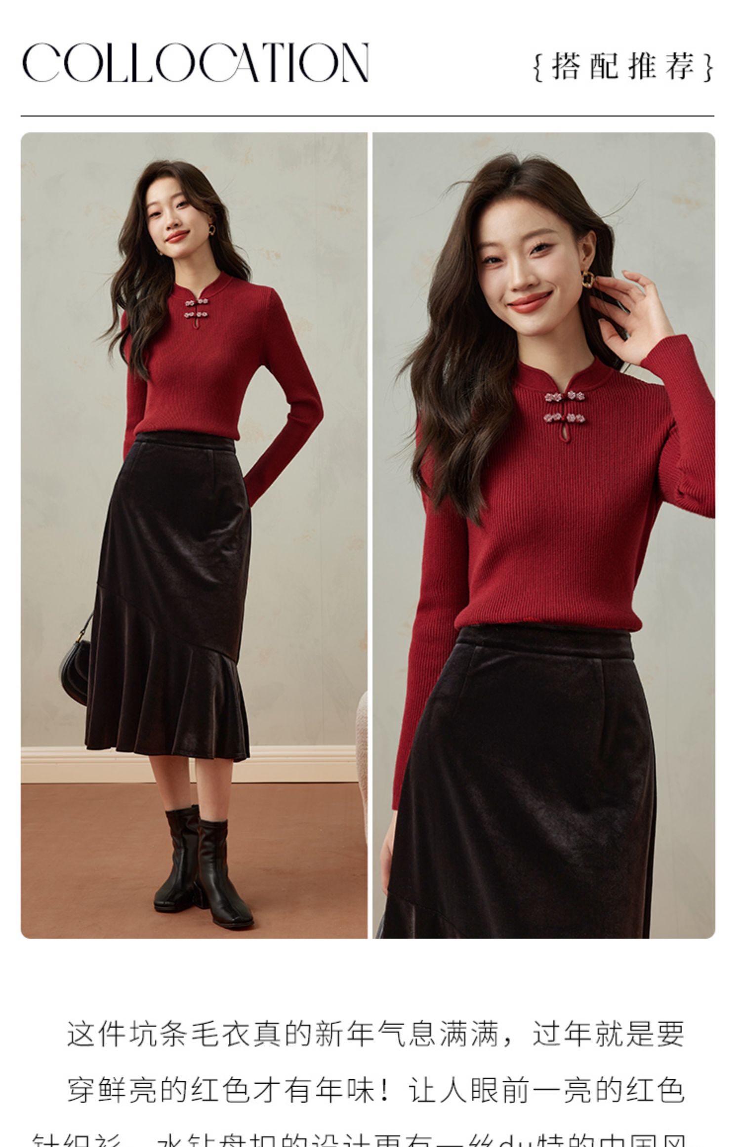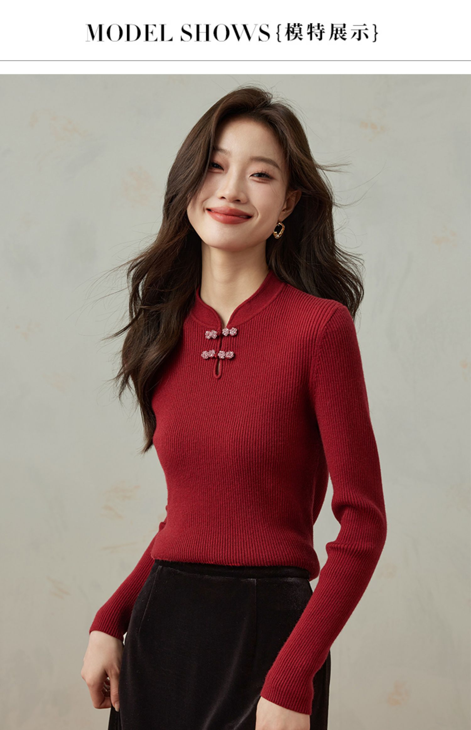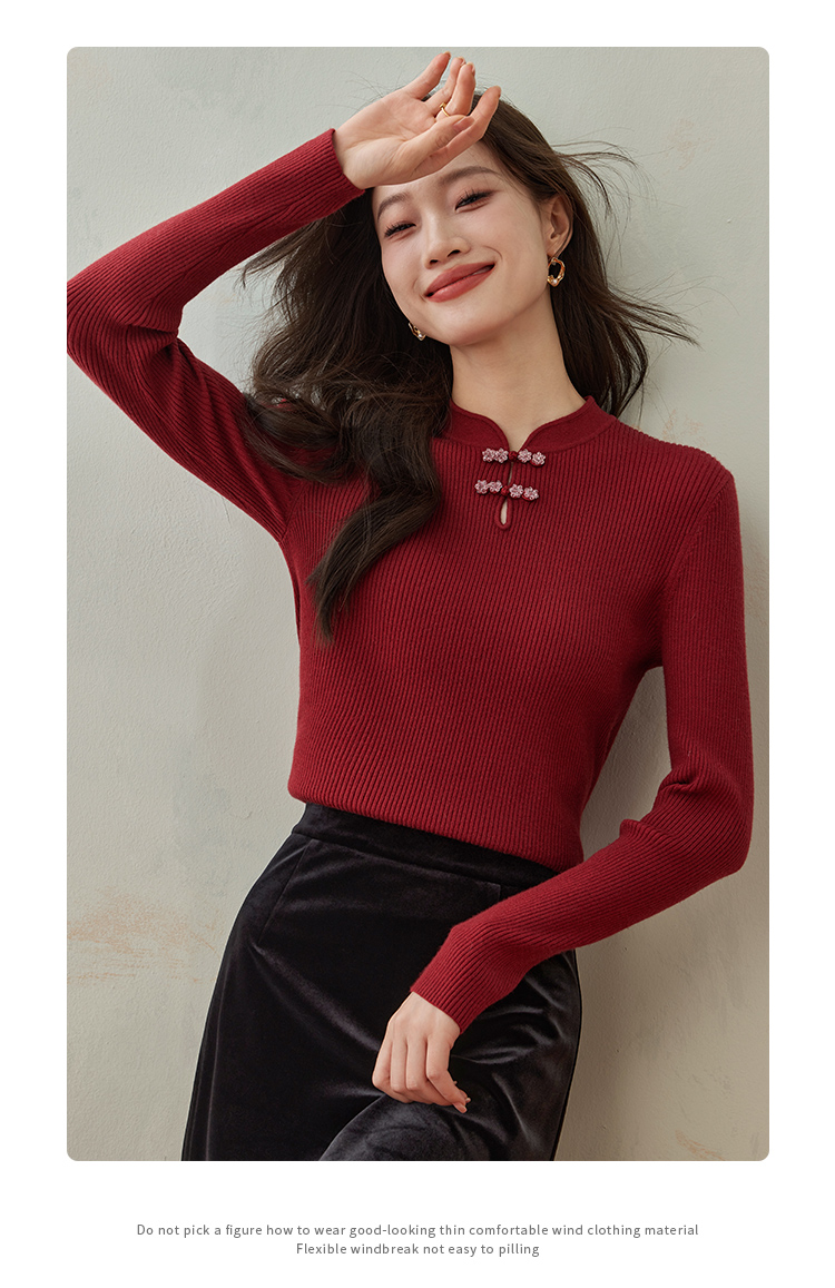【年终特卖】熙世界新中式国风盘扣红色毛衣女秋冬新款修身显瘦内搭针织打底衫