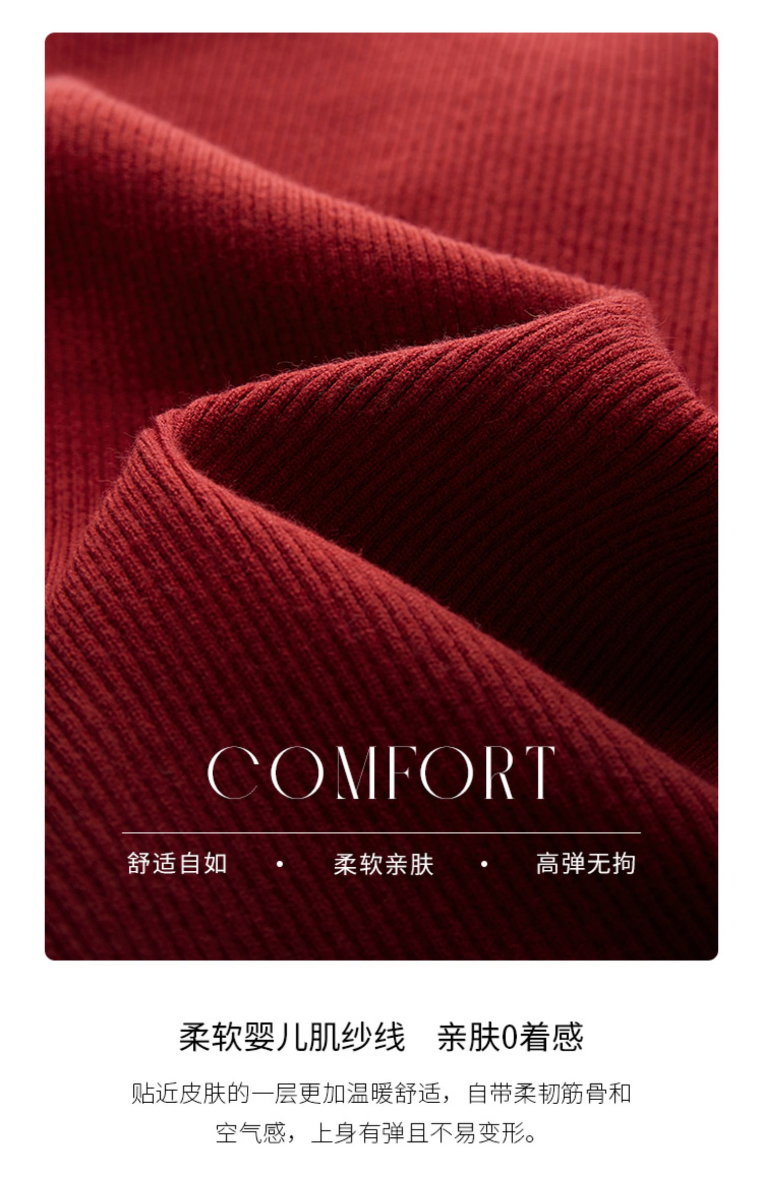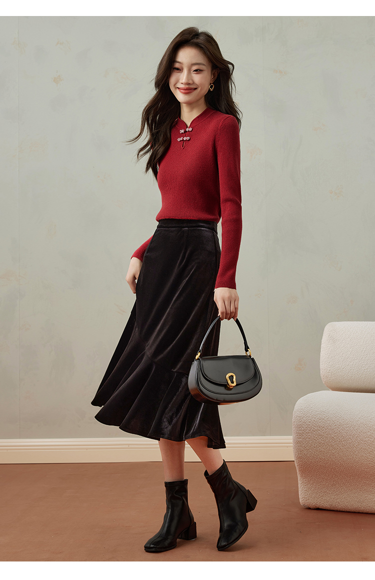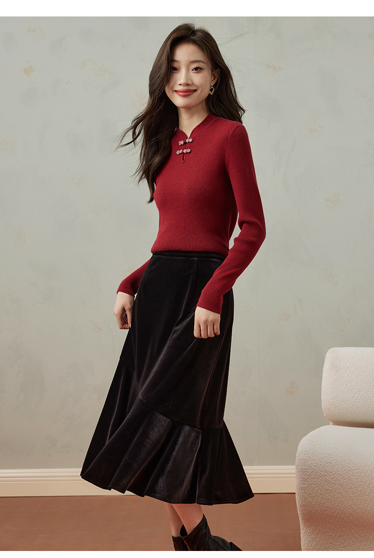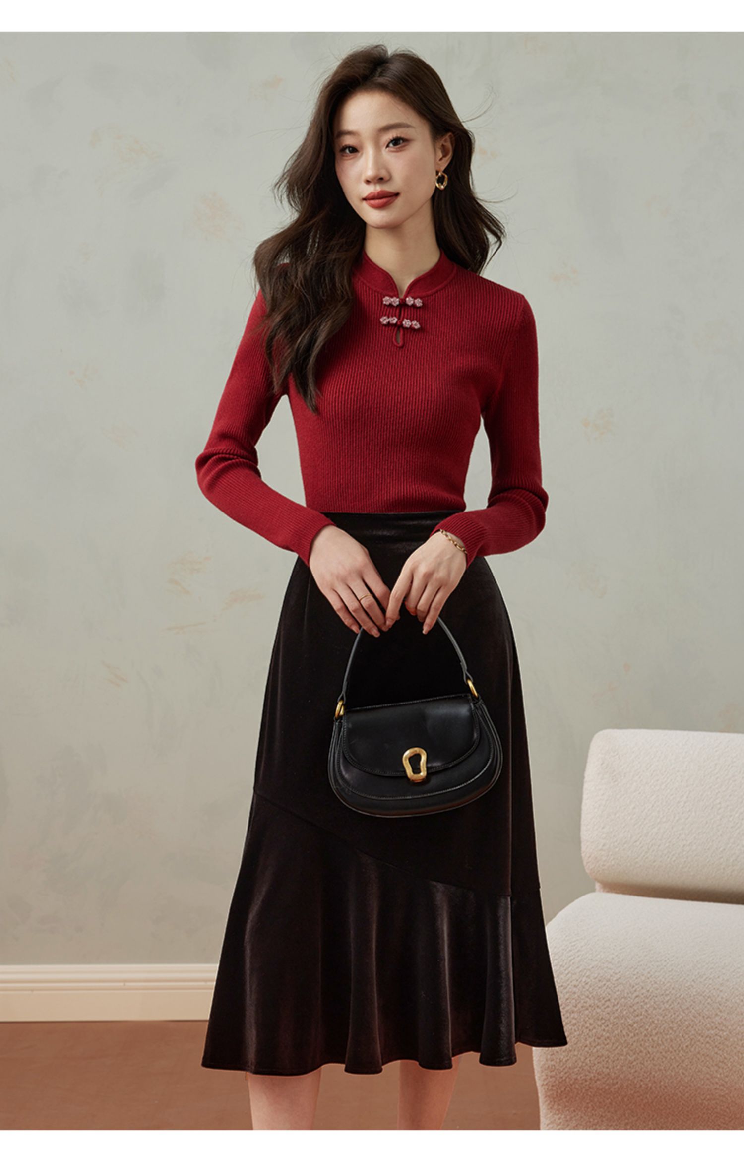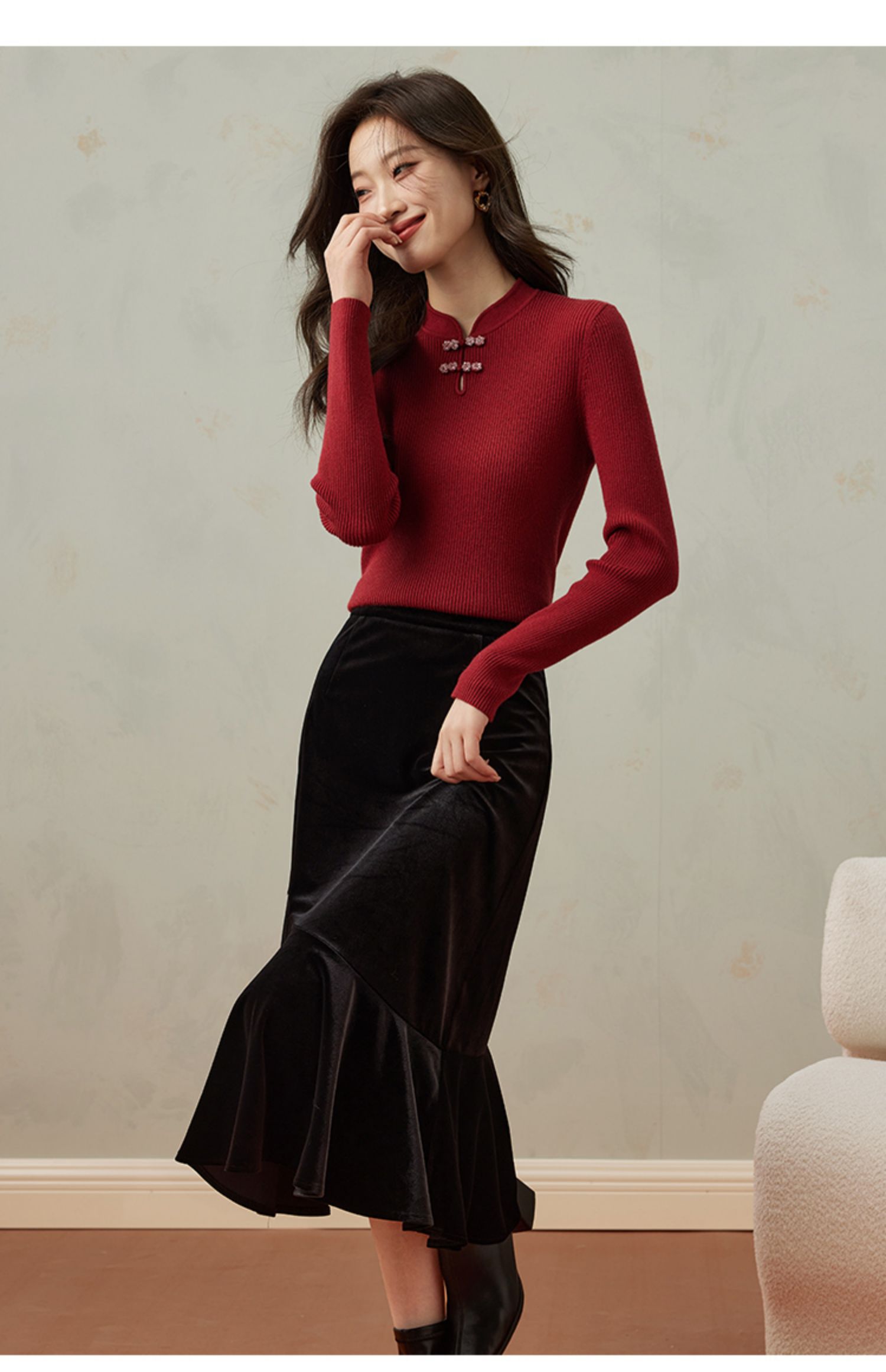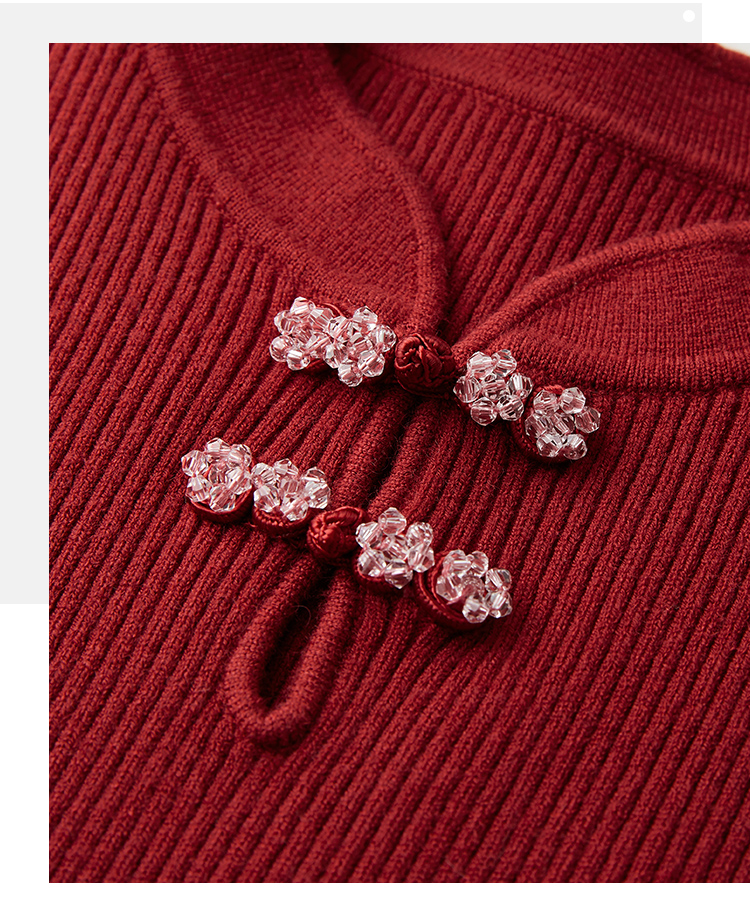 【年终特卖】熙世界新中式国风盘扣红色毛衣女秋冬新款修身显瘦内搭针织打底衫