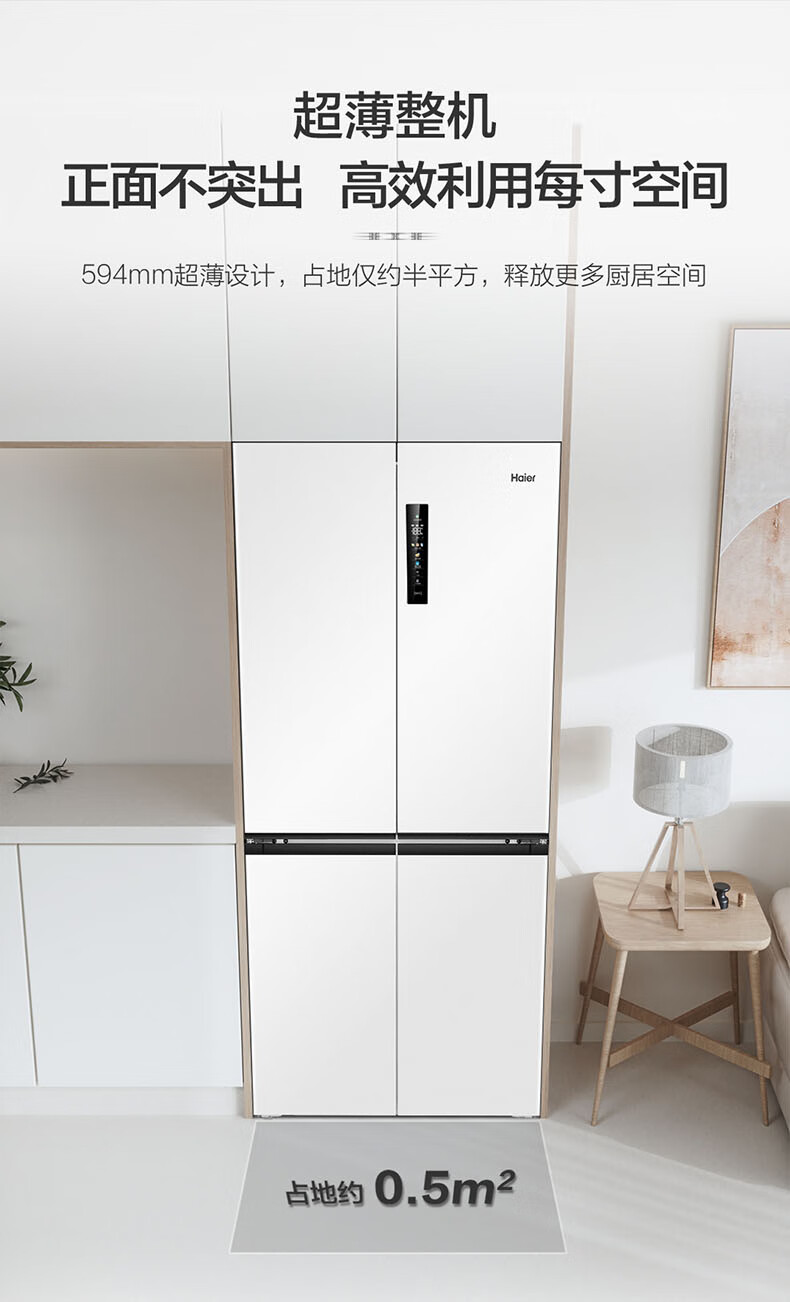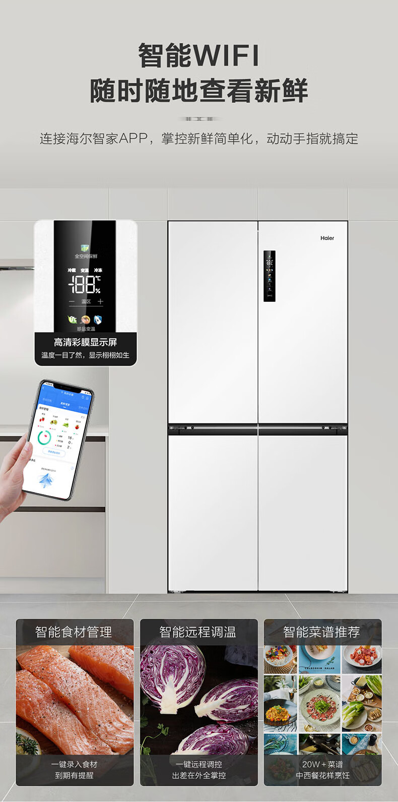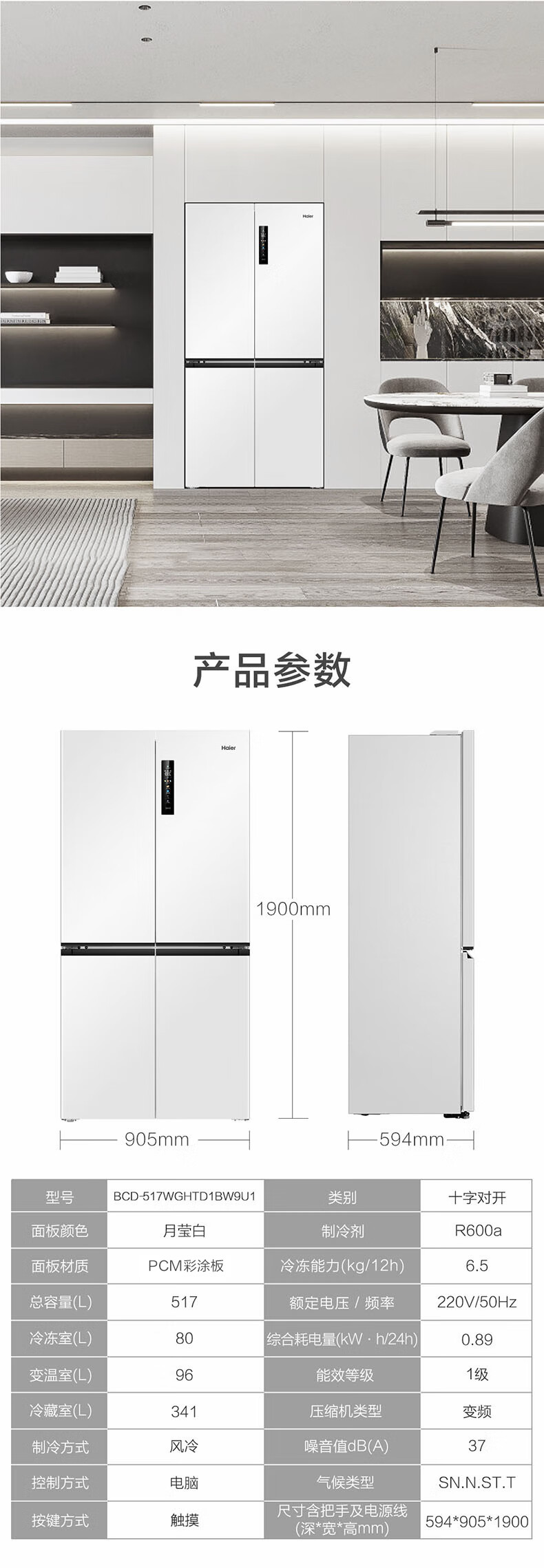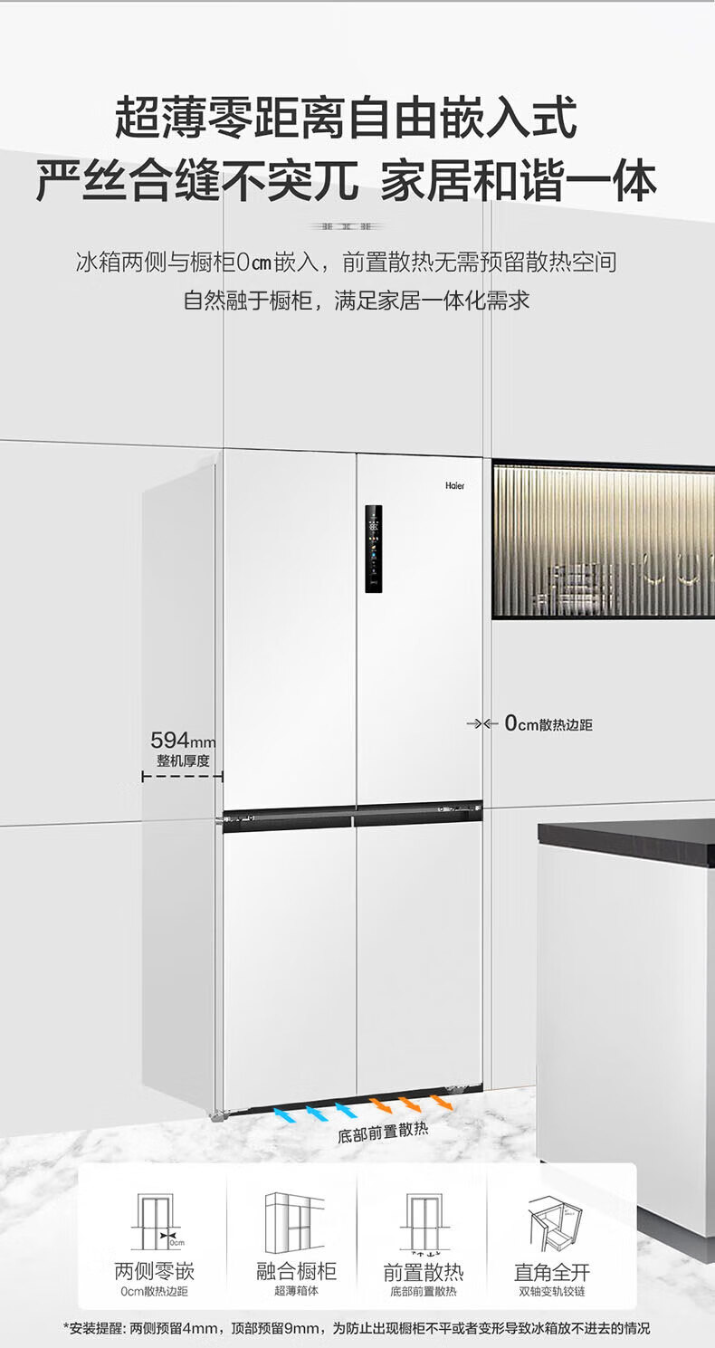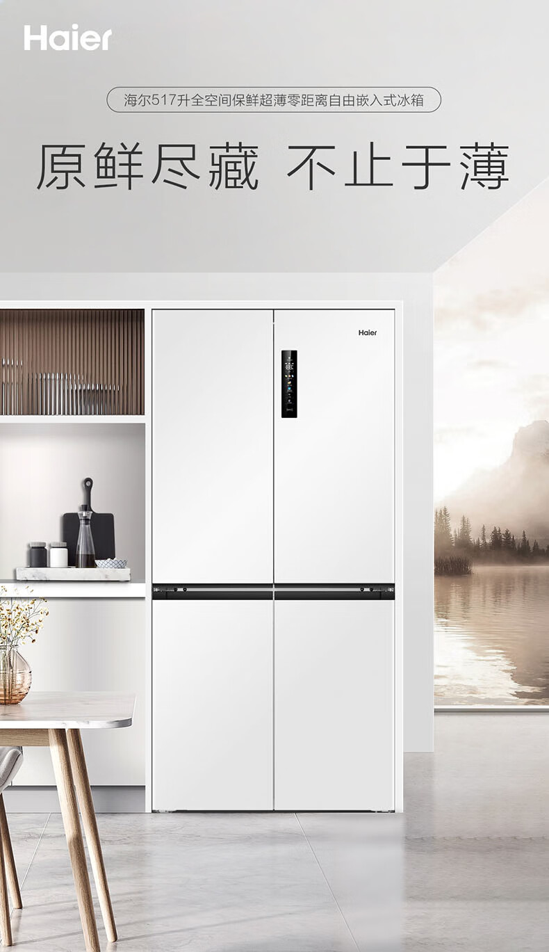 海尔517升超薄零距离自由嵌入式全空间保鲜科技十字对开门一级变频风冷无霜家用电冰箱 T型四门 BCD-517WGHTD1BW9U1