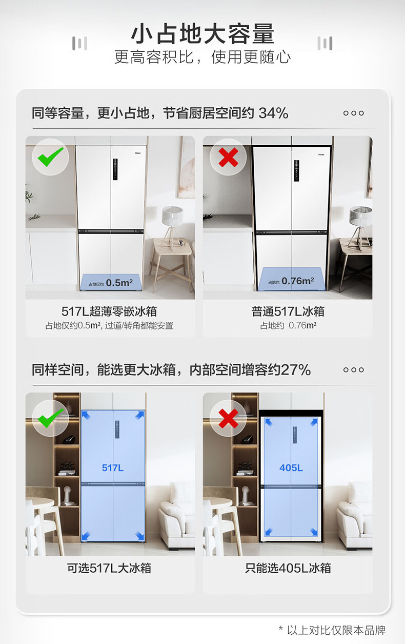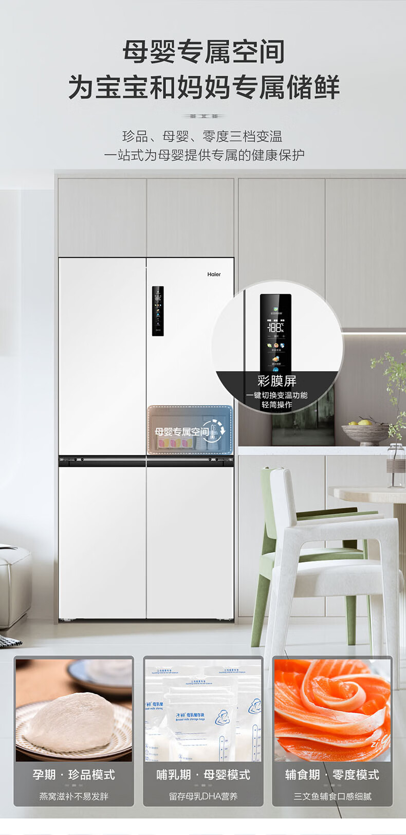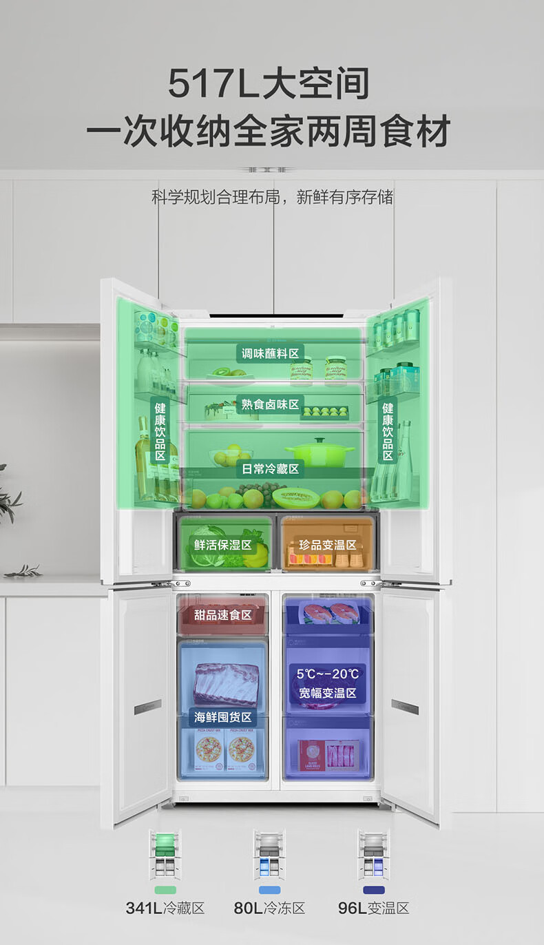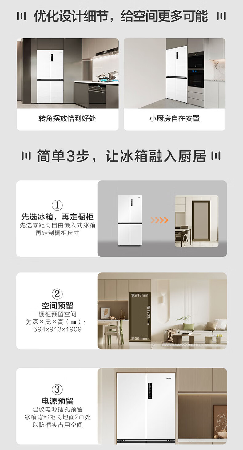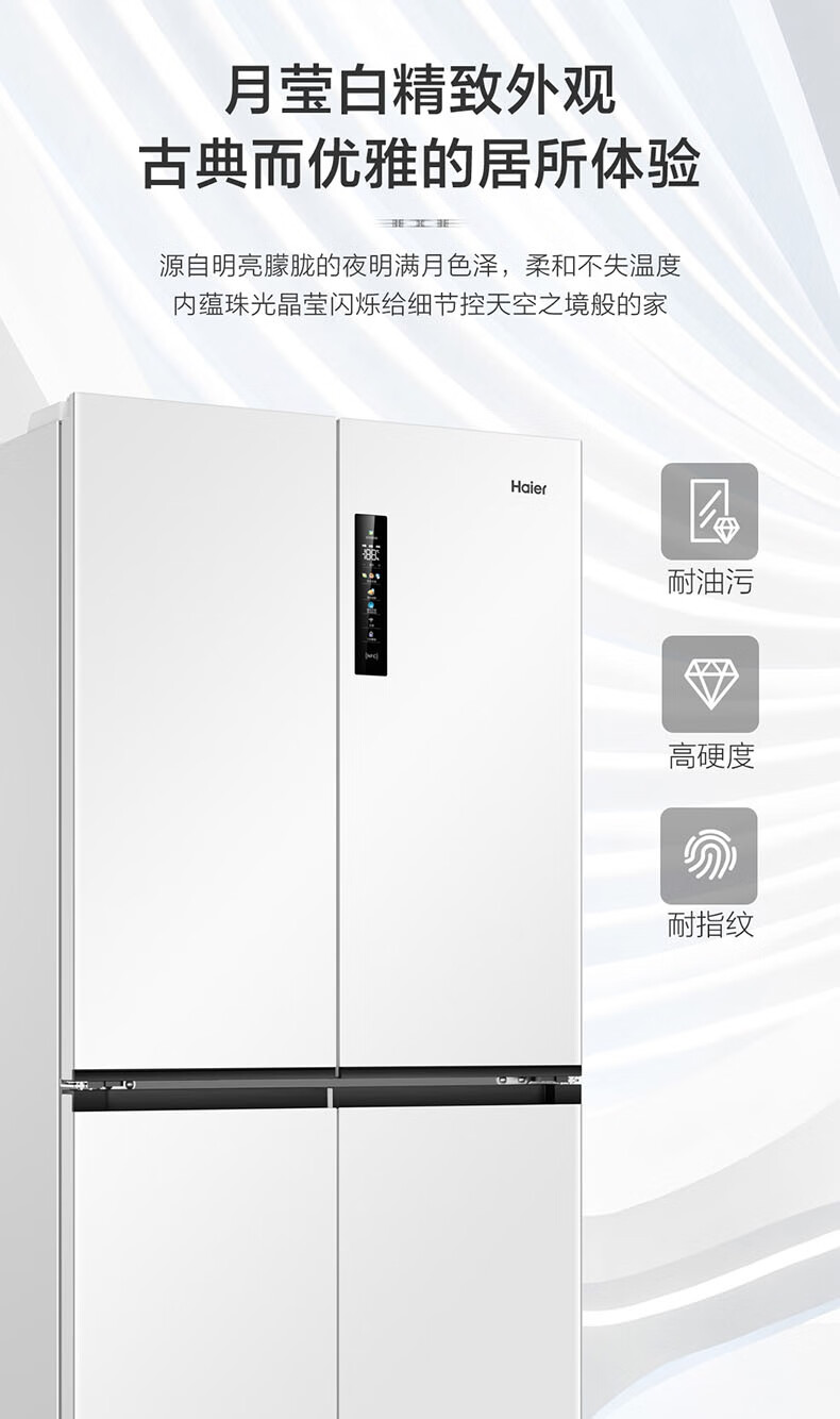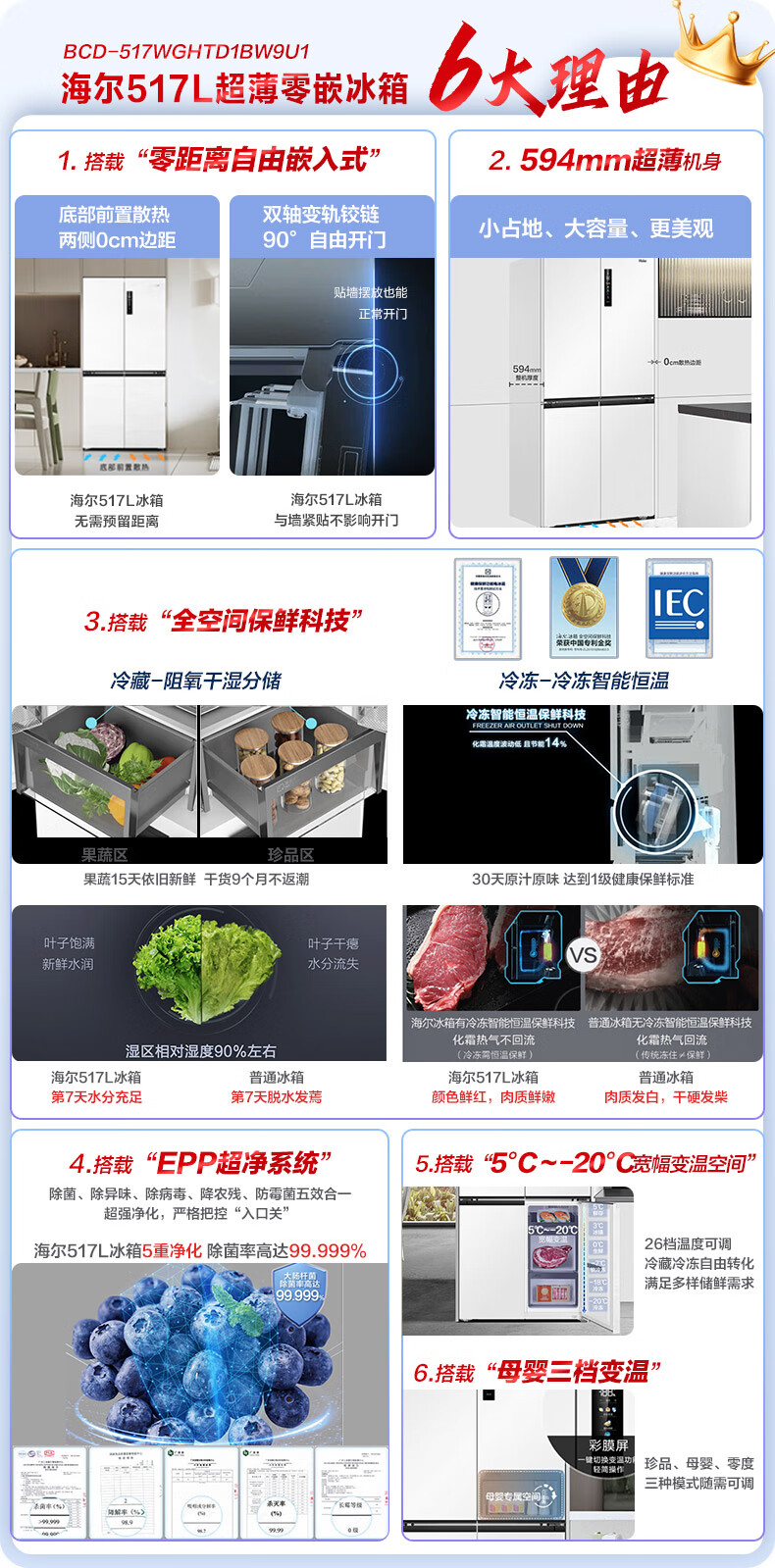 海尔517升超薄零距离自由嵌入式全空间保鲜科技十字对开门一级变频风冷无霜家用电冰箱 T型四门 BCD-517WGHTD1BW9U1