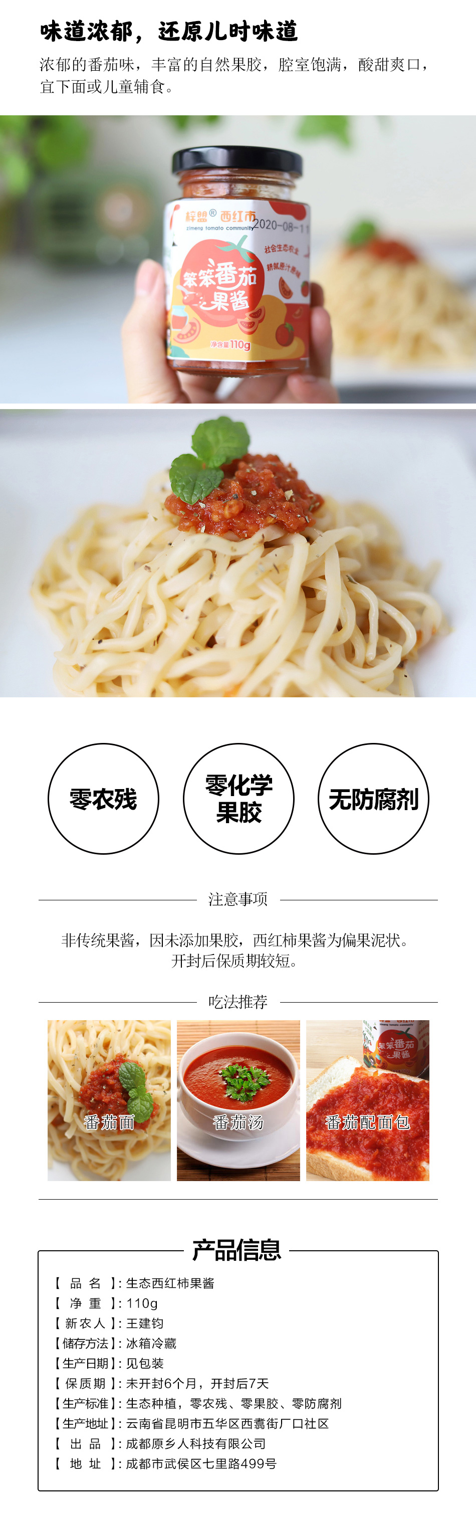 【规格】:220g/瓶,220g/瓶*2 【配料】:生态西红柿 【新农人】:王建钧 【储存方法】:冰箱冷藏 【生产日期】:见包装 【保质期】:未开封6个月,开封后7天 【生产标准】:生态种植,零农残、零果胶、零防腐剂 【生产地址】:云南省昆明市五华区西翥街厂口社区 【注意事项】:非传统果酱,因未添加果胶,西红柿果酱为偏果泥,开封后保质期较短,请尽快食用 |