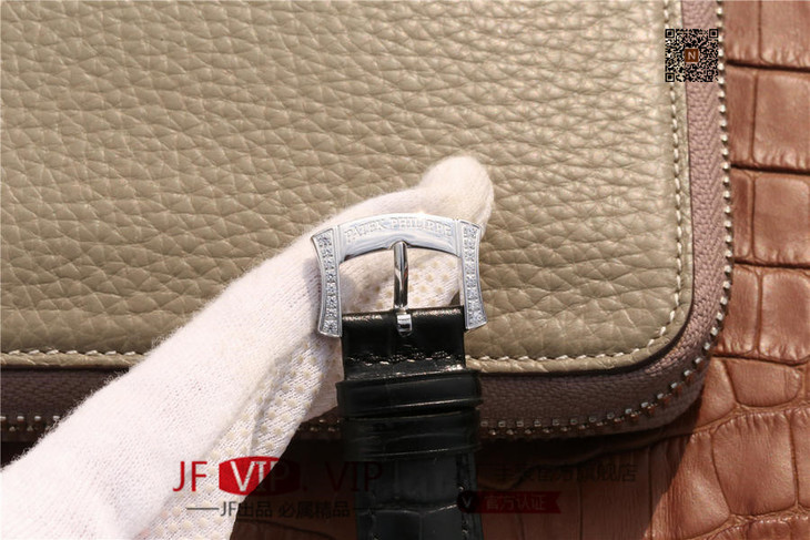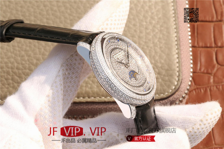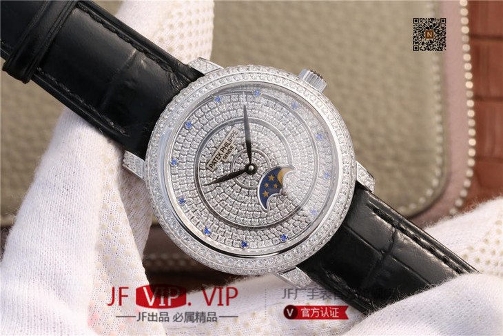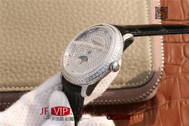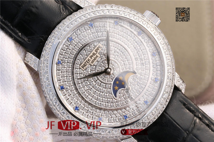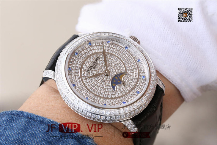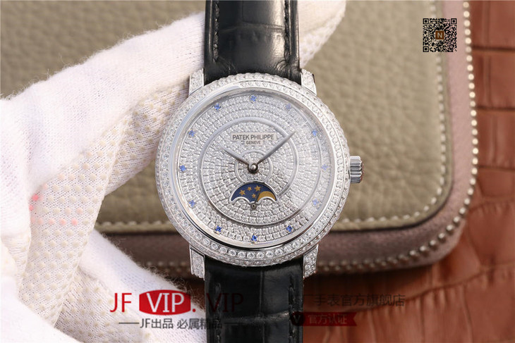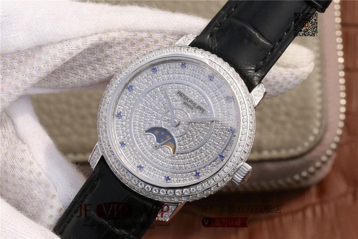 百达翡丽复杂功能系列4968女士手表。海鸥克隆组装215 PS LU手动机械机芯,33.3毫米直径,镶嵌施华洛世奇钻。
