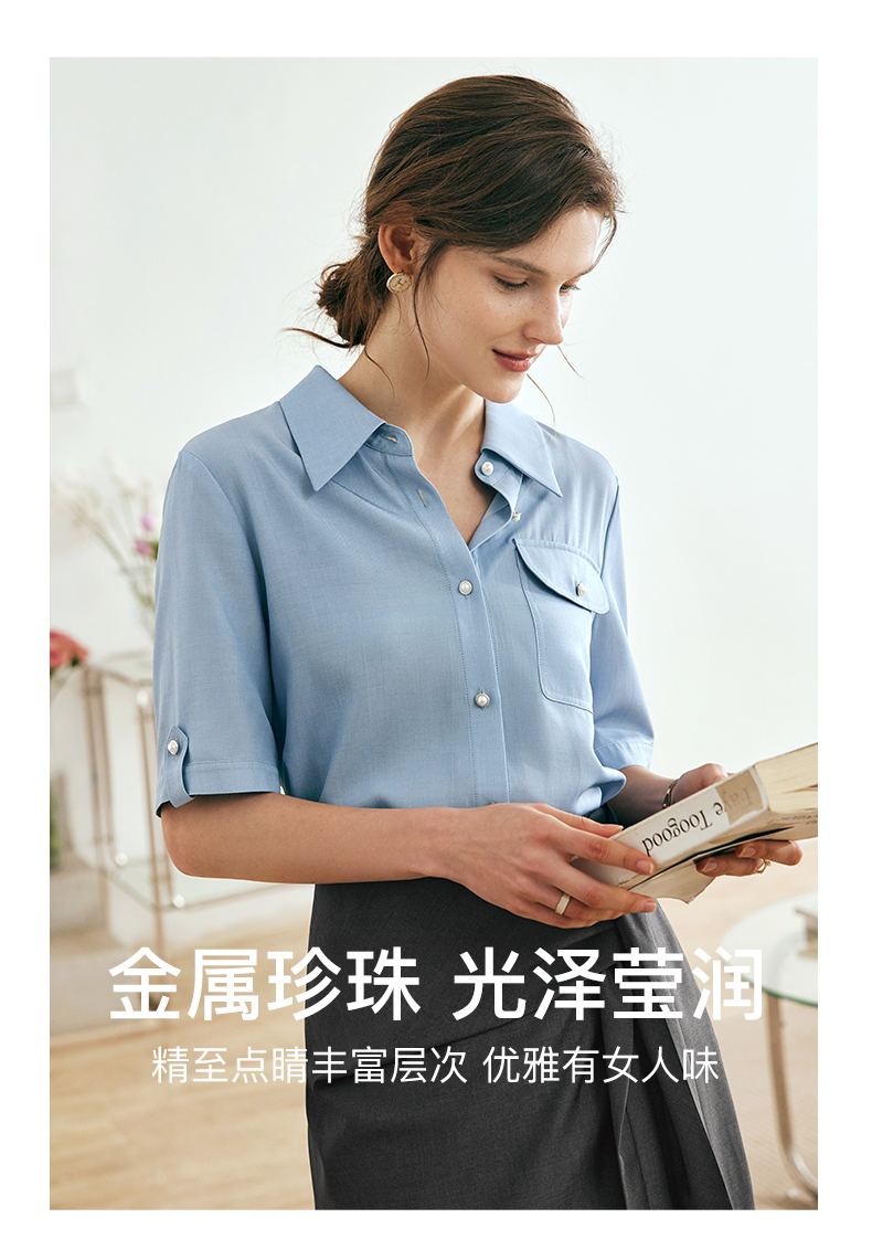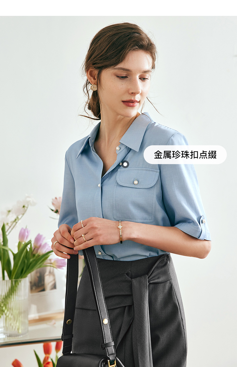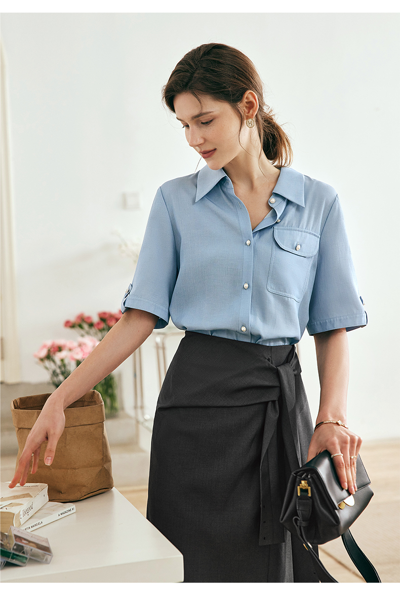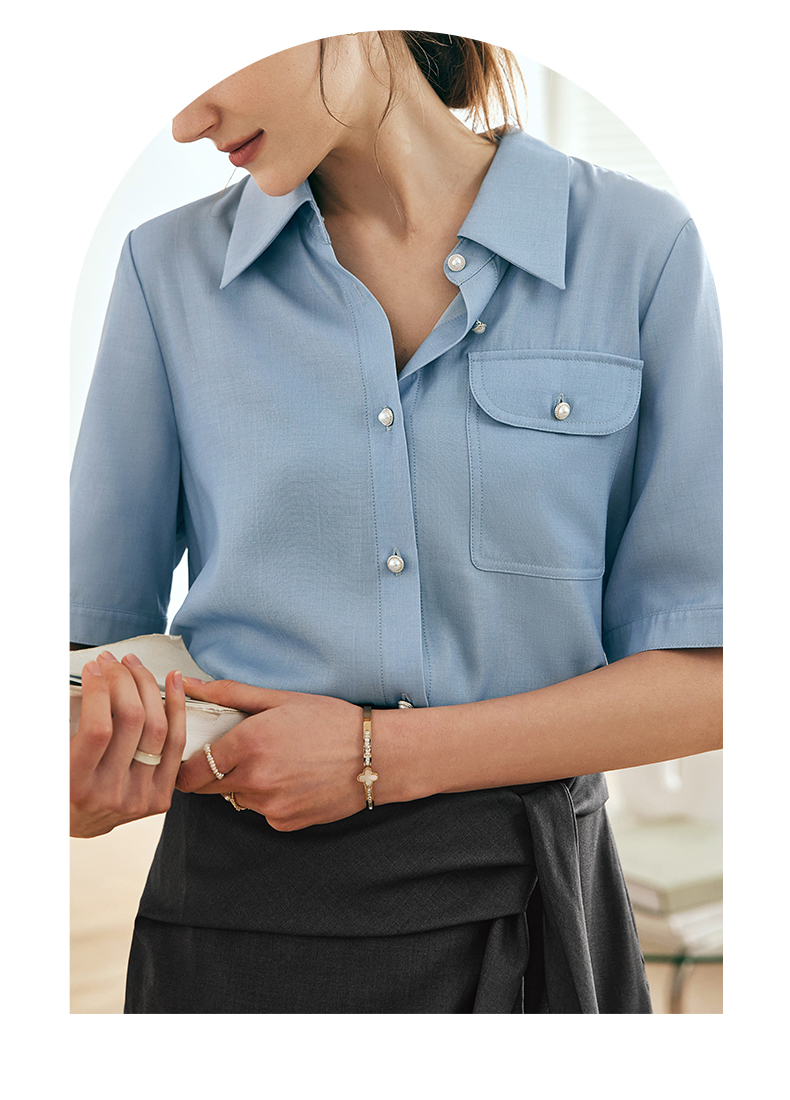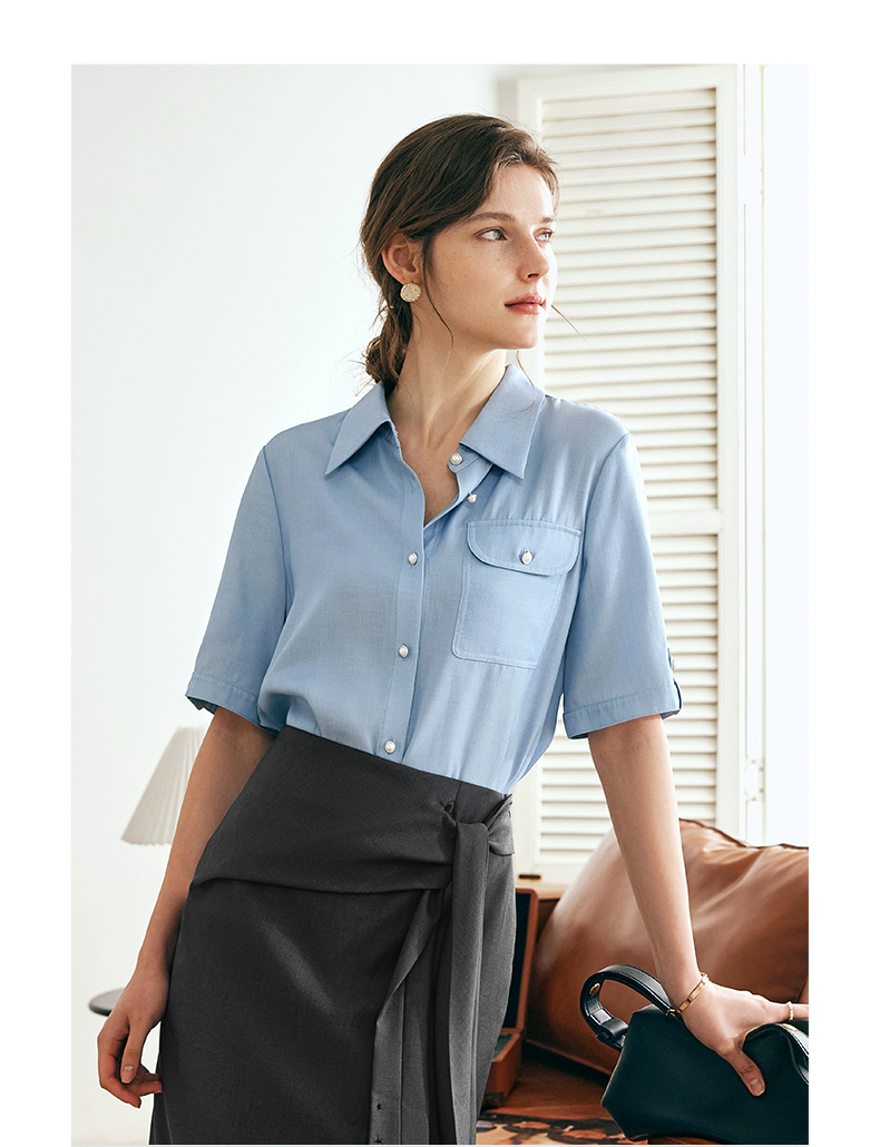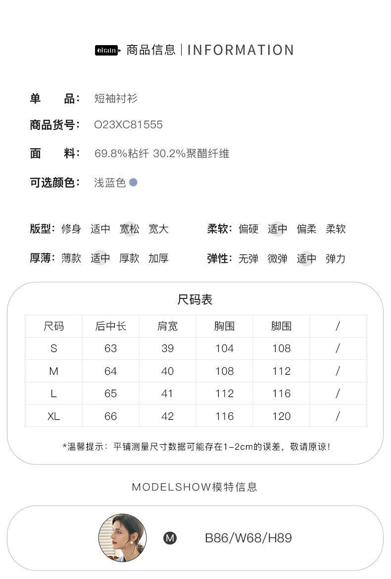 OLrain欧芮儿法式蓝色短袖衬衫女夏季2023年新款宽松百搭通勤衬衣