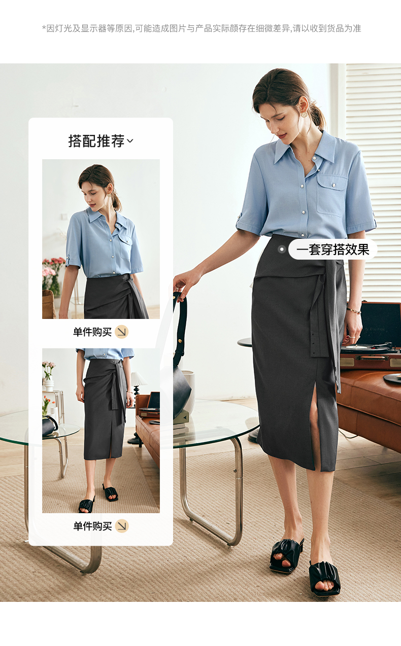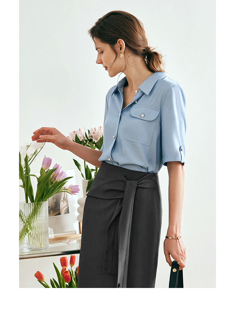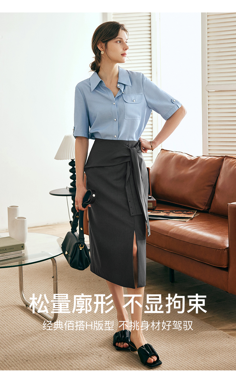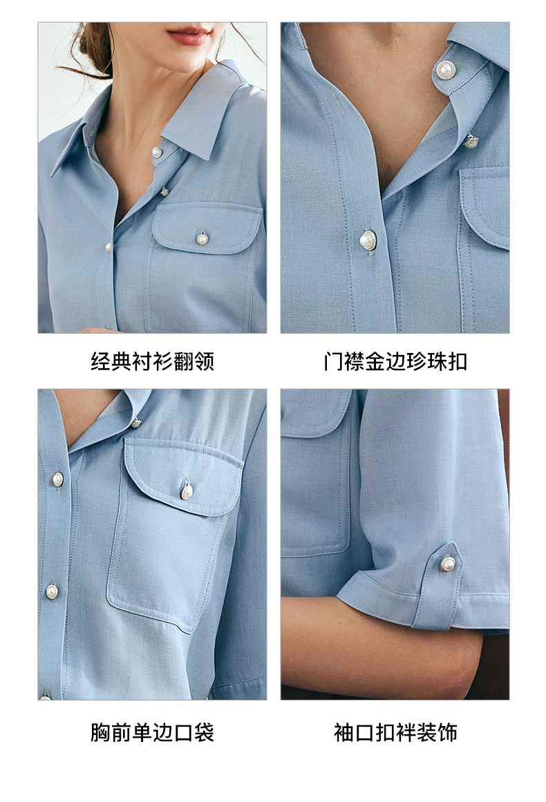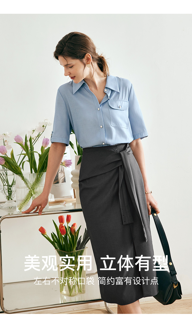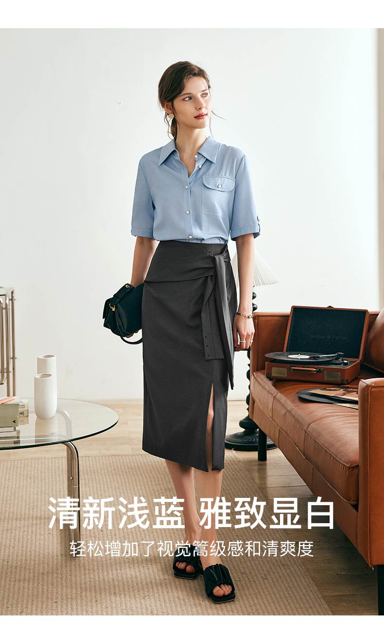OLrain欧芮儿法式蓝色短袖衬衫女夏季2023年新款宽松百搭通勤衬衣