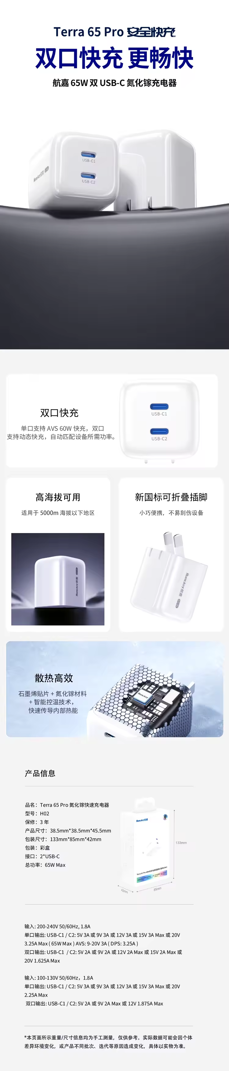 充电器 氮化镓快充 65W 双口 白-航嘉