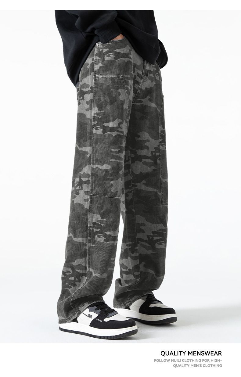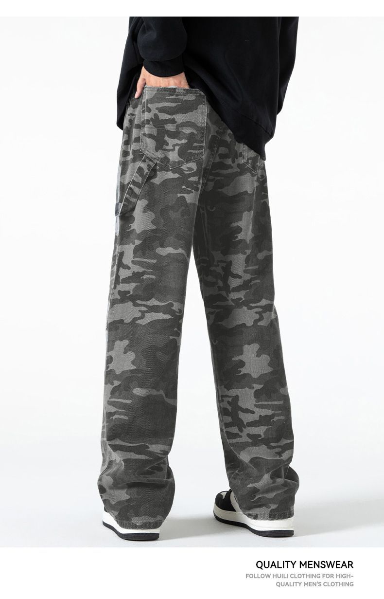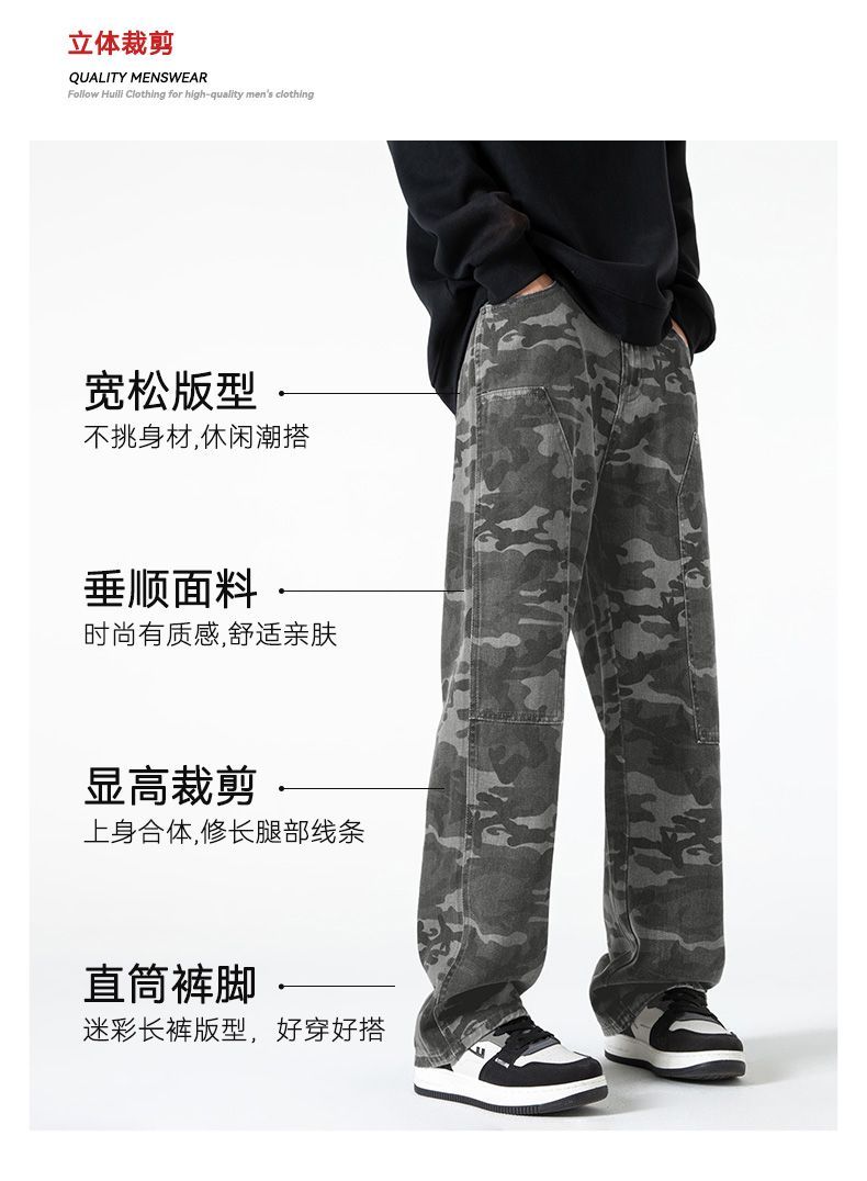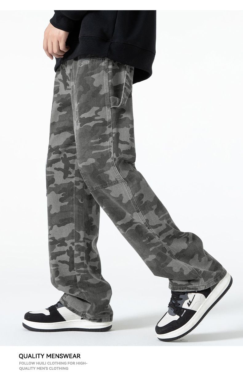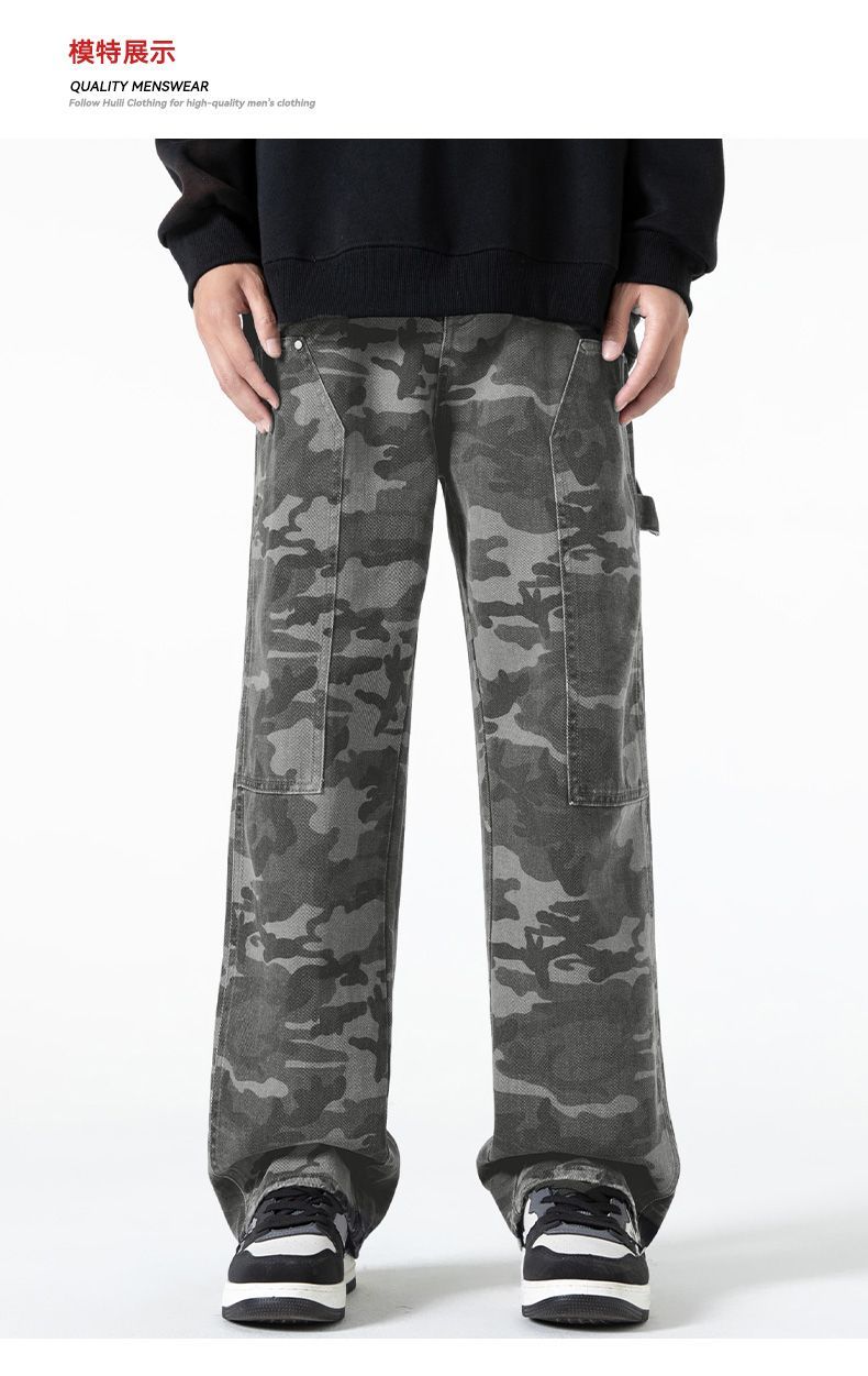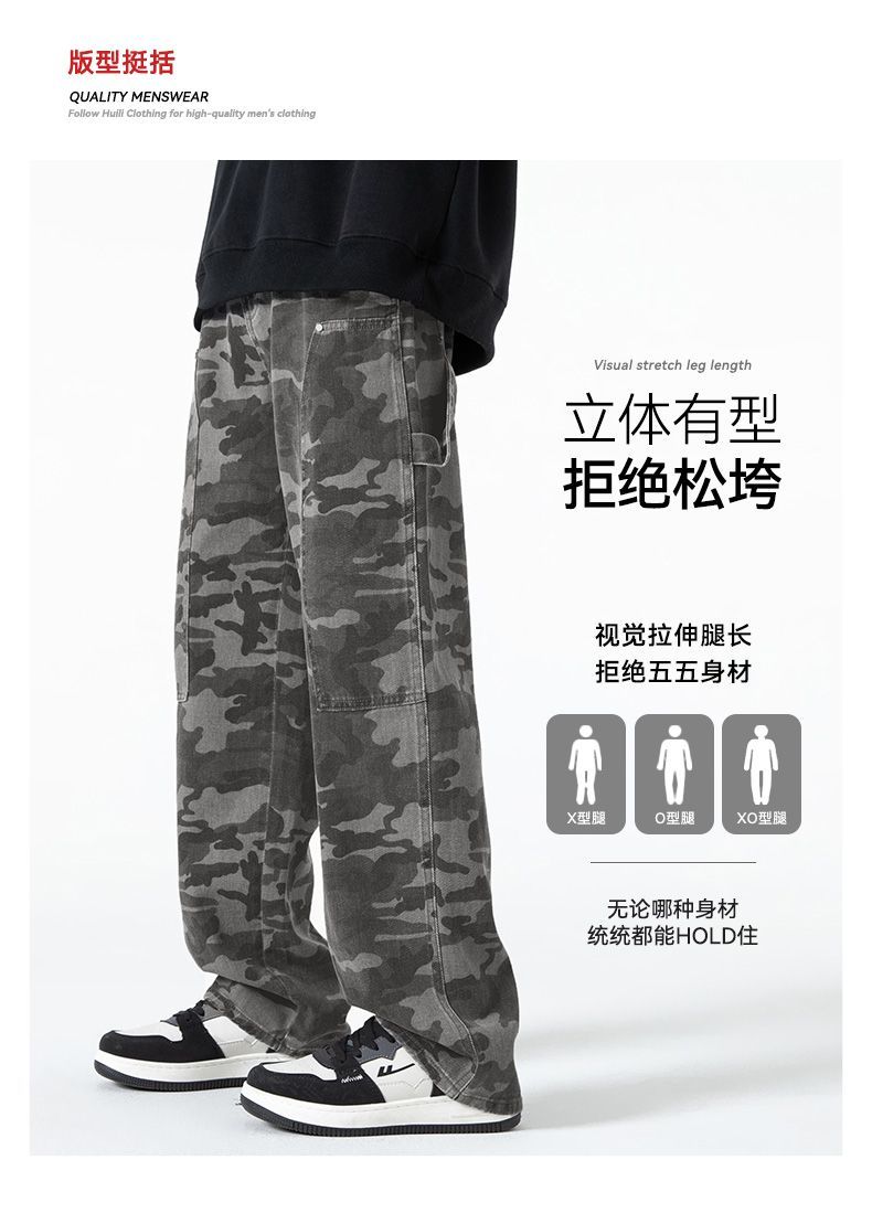 回力工装迷彩裤子男春秋季新款高街直筒美式风牛仔裤子宽松阔腿裤