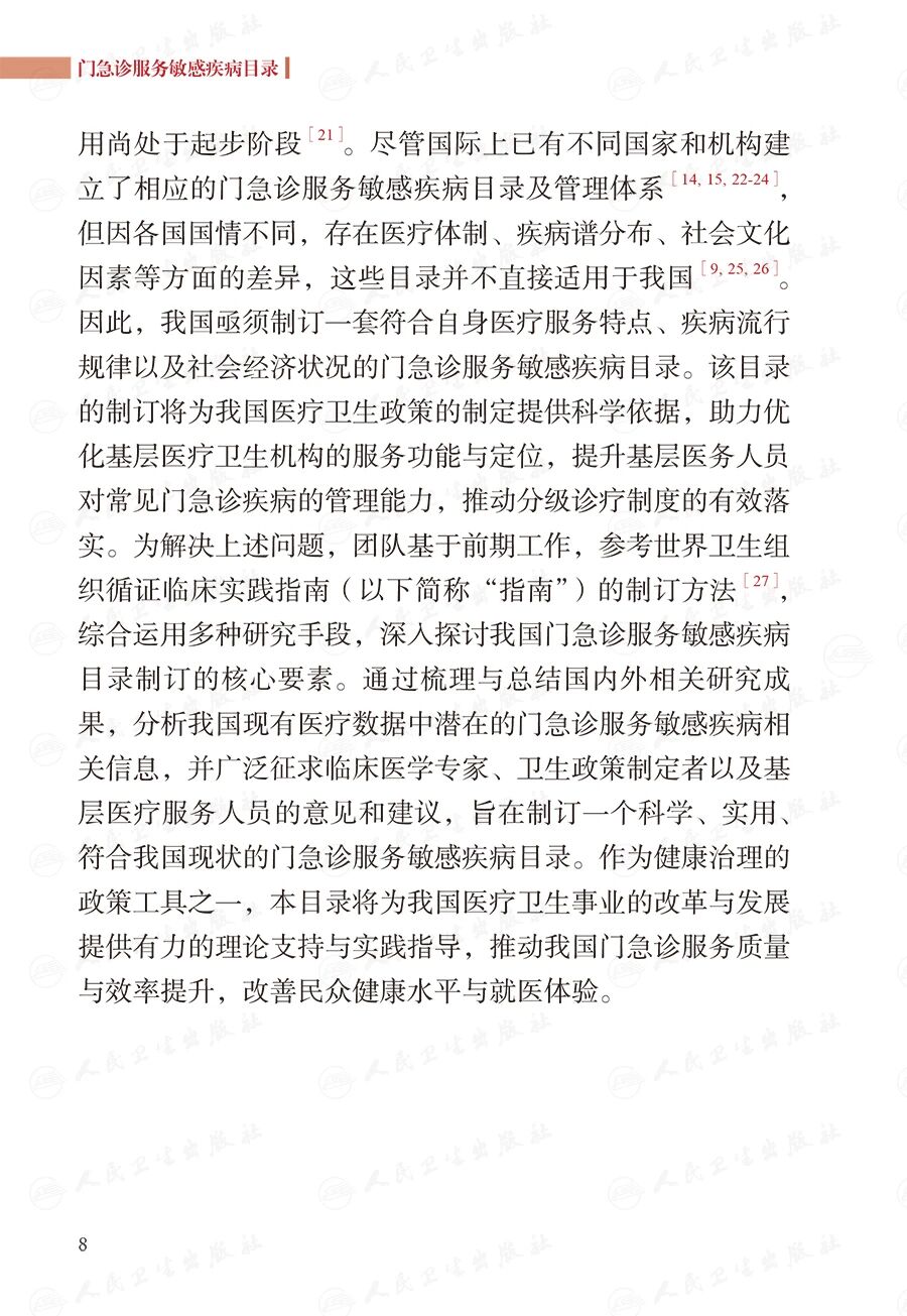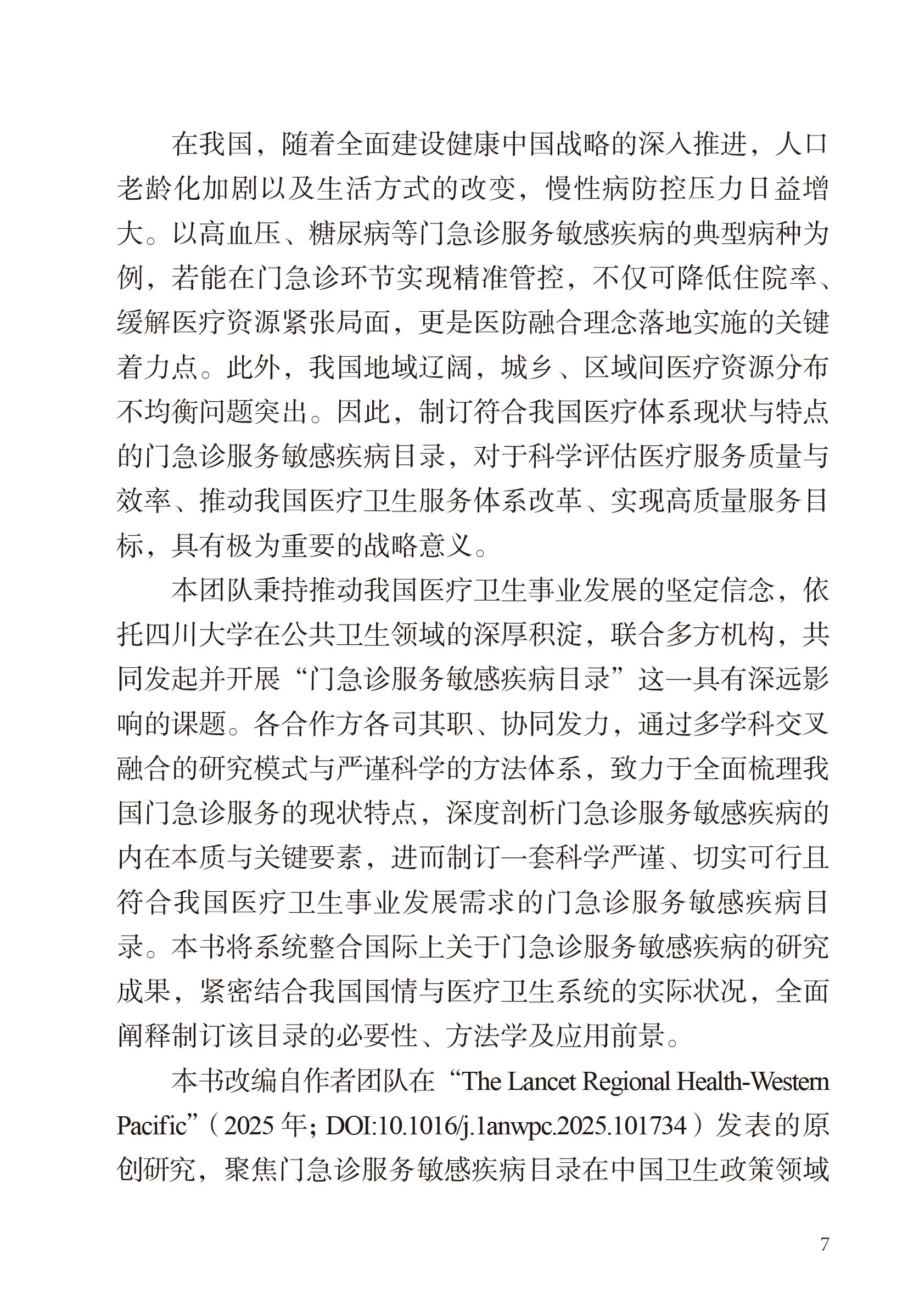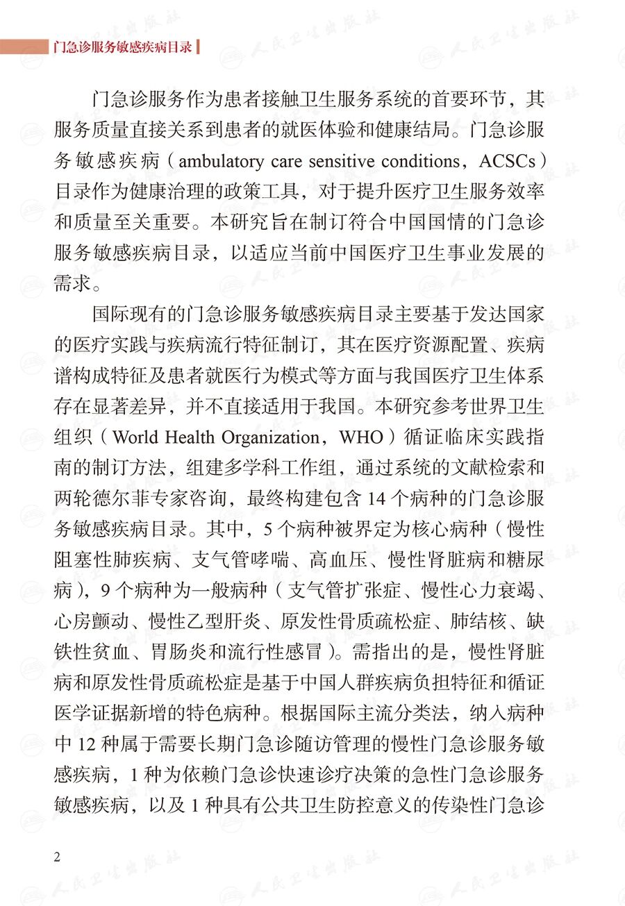 本书由五个章节组成,第一章介绍了研究背景、目的和意义,同时阐述门急诊服务敏感疾病的基本概念及其在医疗卫生领域的重要性。第二章详细阐述了门急诊服务敏感疾病目录的制订标准与方法。第三章具体呈现了门急诊服务敏感疾病目录的制订结果及最终目录内容。第四章重点探讨了门急诊服务敏感疾病目录在医疗卫生领域的实际应用价值。第五章对应用门急诊服务敏感疾病目录时的注意事项进行了系统归纳,并提出了未来的更新计划。