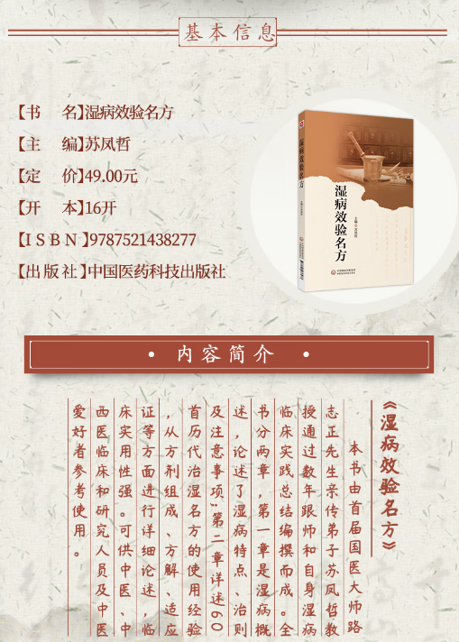 本书由首届国医大师路志正先生亲传弟子苏凤哲教投通过数年跟师和自身湿病临床实践总结编撰而成。全书分两章,第一章是湿病概述,论述了湿病特点、治则及注意事项;第二章详述60首历代治湿名方的使用经验,从方剂组成、方解、适应证等方面进行详细论述,临床实用性强。可供中医、中西医临床和研究人员及中医爱好者参考使用。