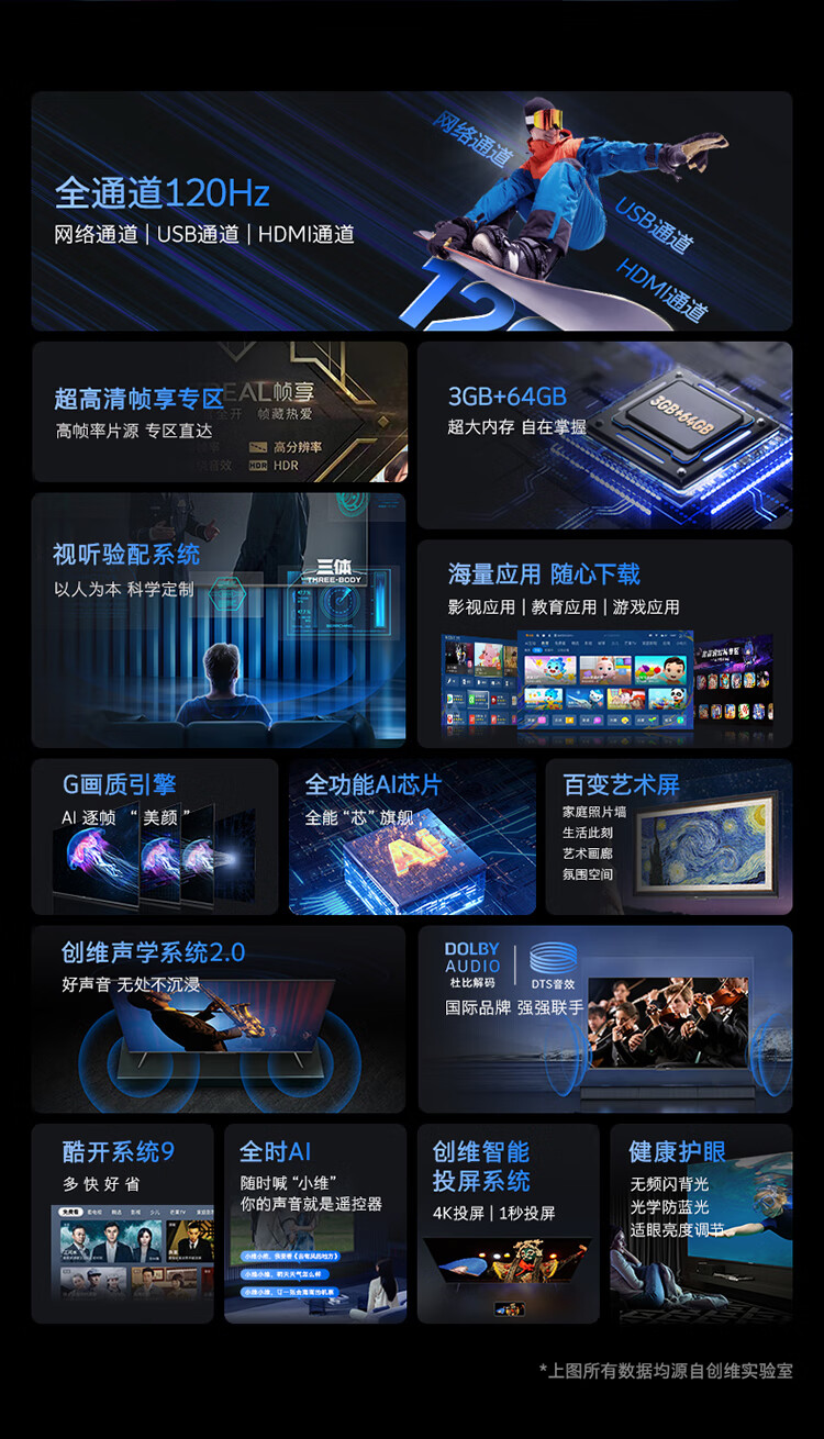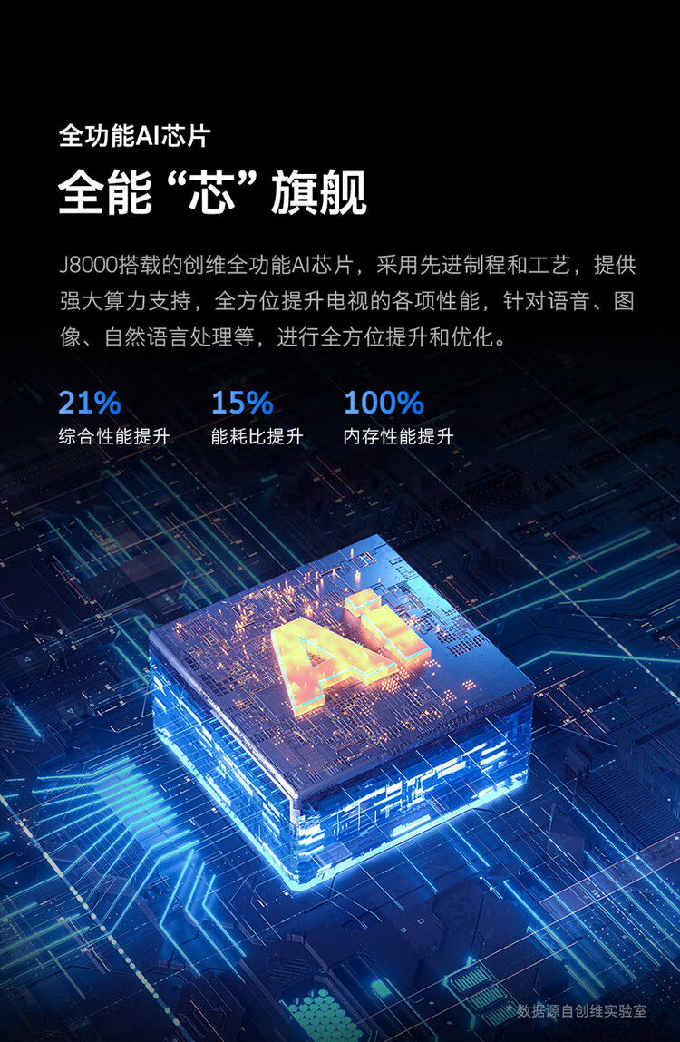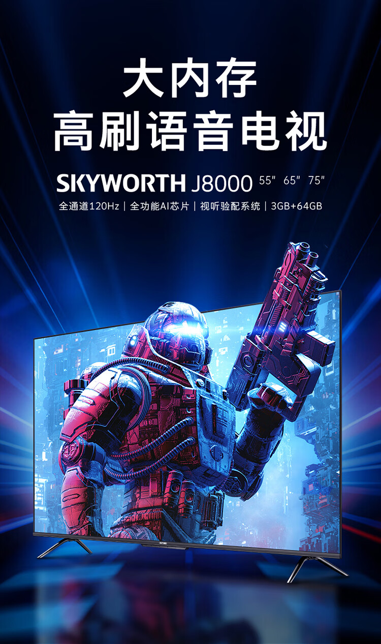 创维电视 65英寸 大内存 全通道120Hz 全功能AI芯片 视听验配系统 4K超高清 远场语音 3+64GB大内存 65J8000