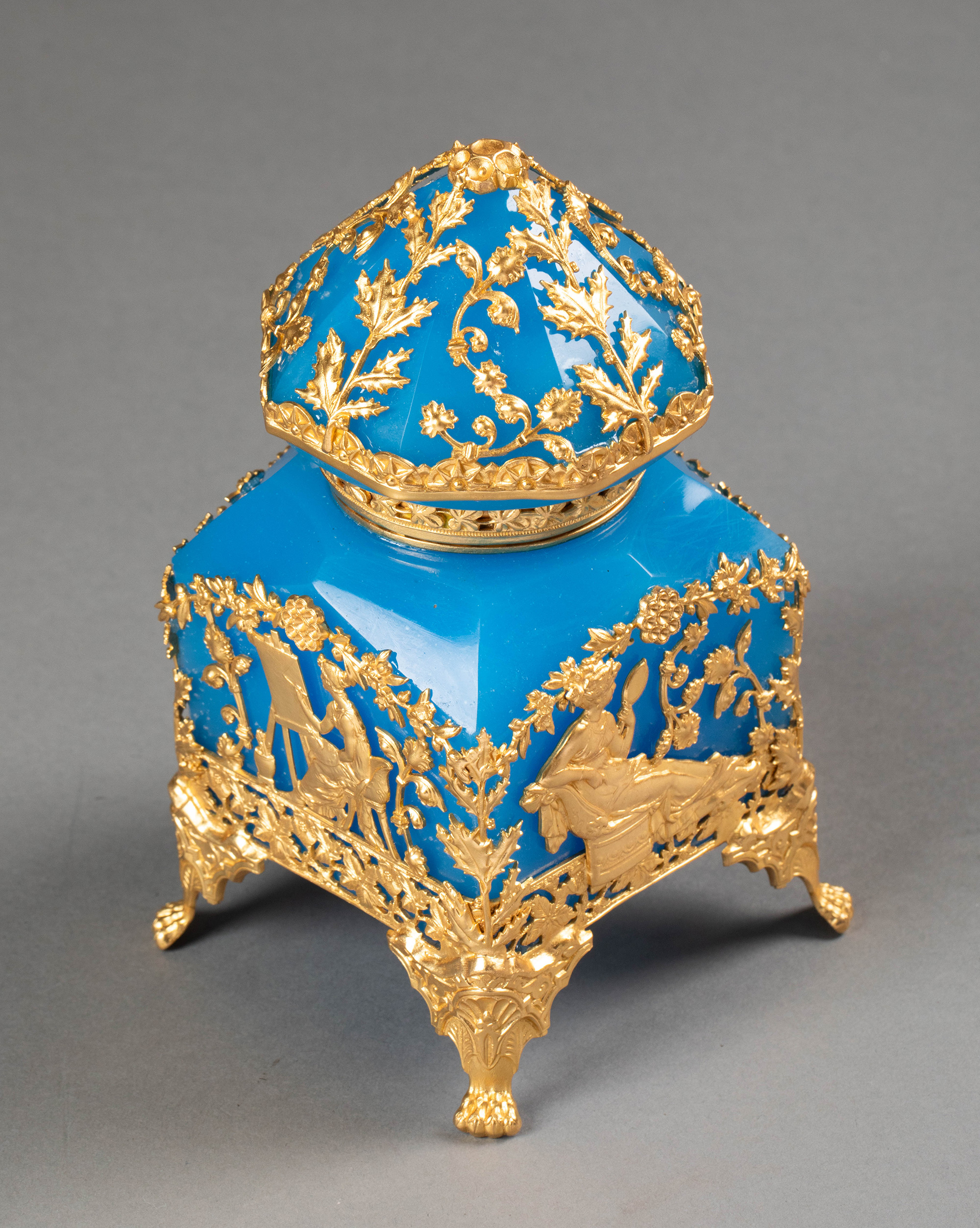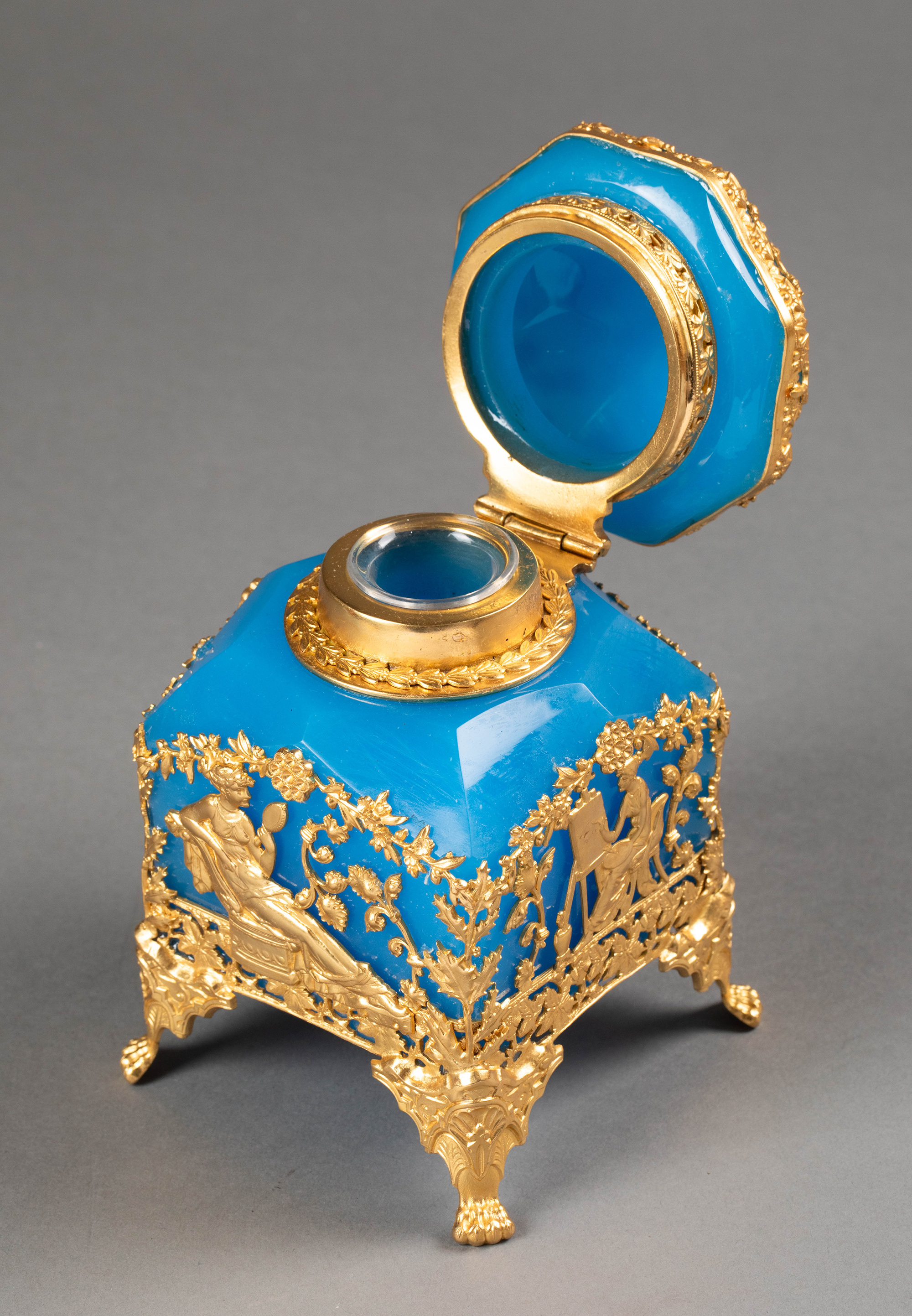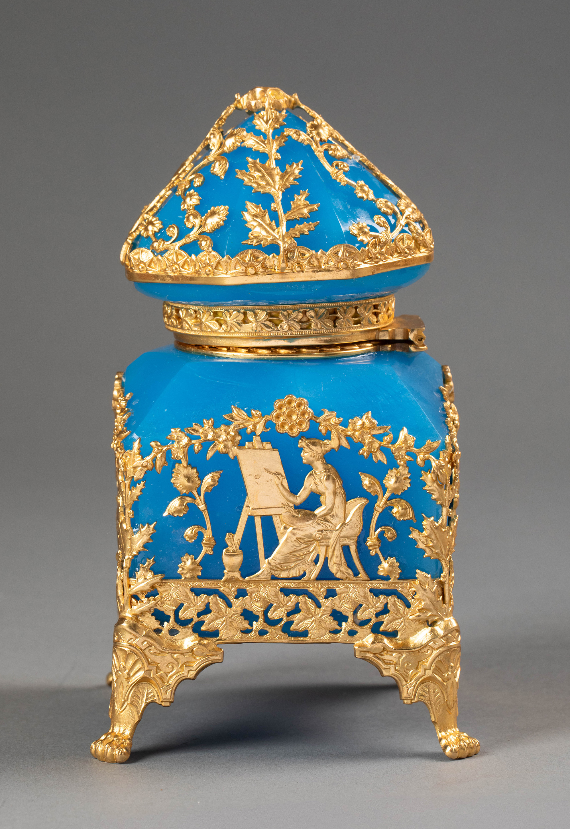 19世纪法国出品古典女神与花叶主题铜鎏金精雕装饰蓝色欧泊水晶墨水瓶