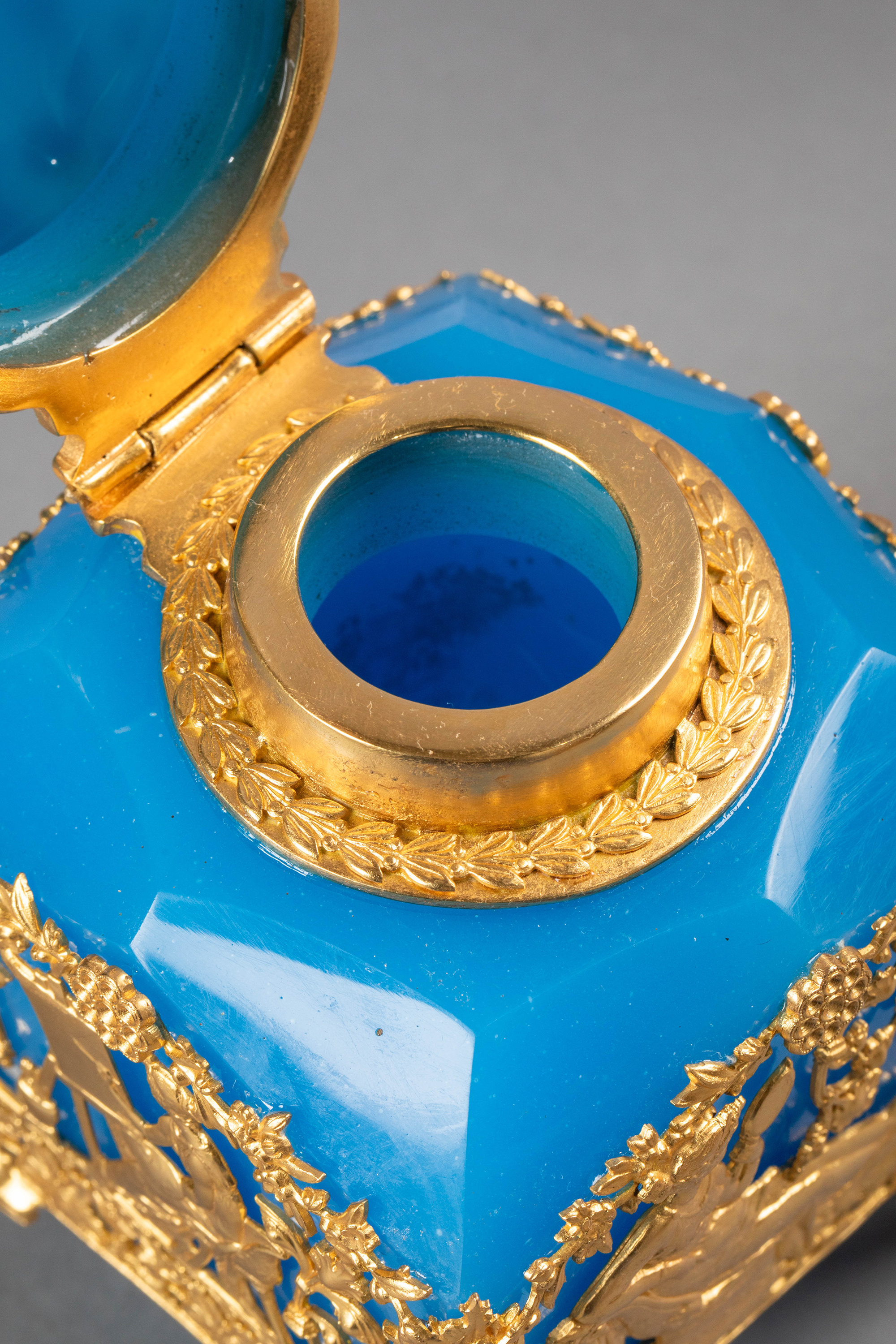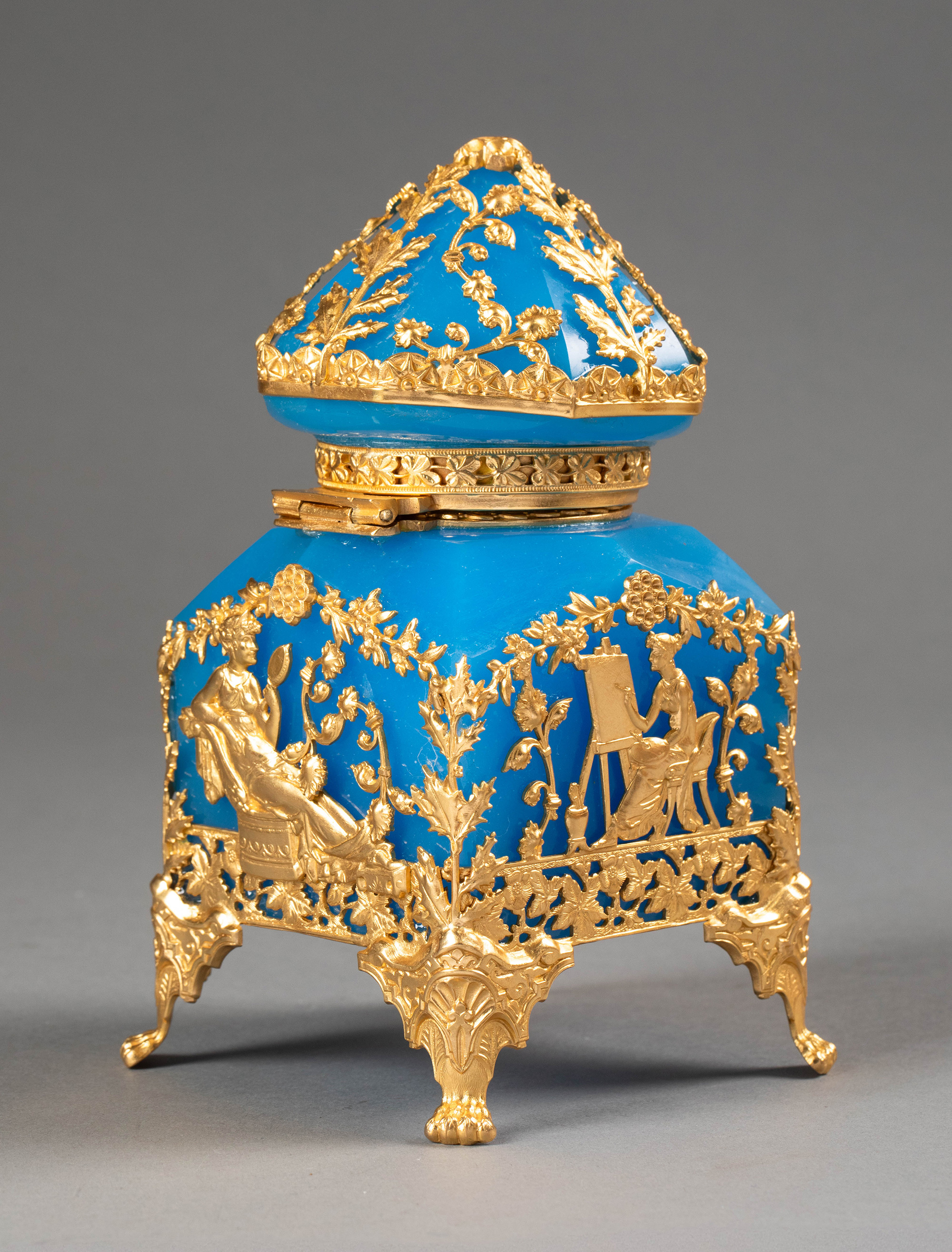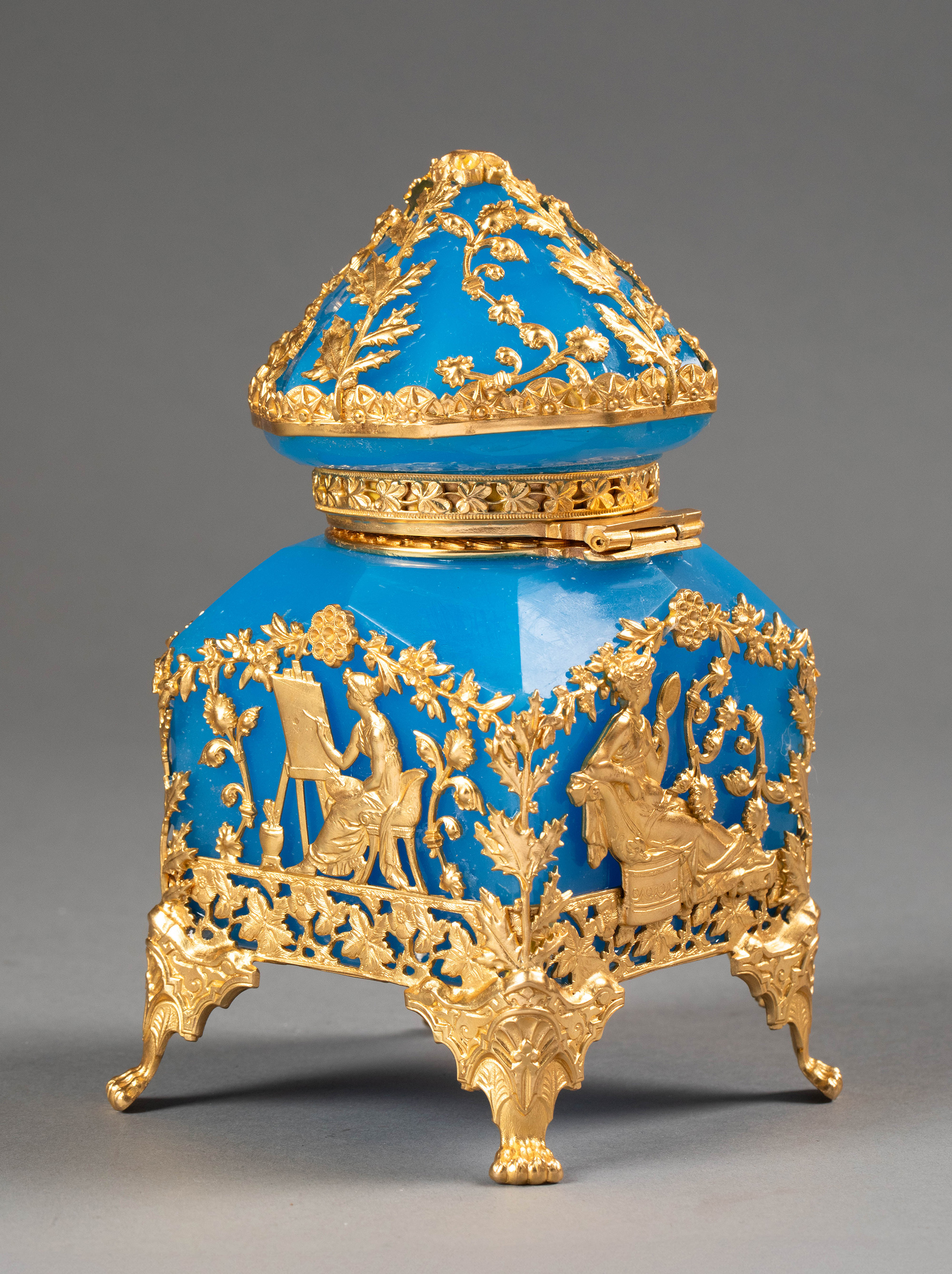 19世纪法国出品古典女神与花叶主题铜鎏金精雕装饰蓝色欧泊水晶墨水瓶