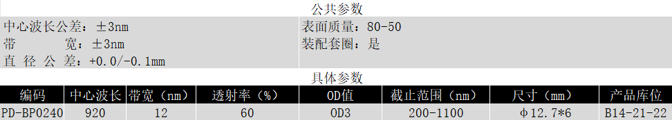 BP920/12K OD3@200-1100 T>60% Φ12.7*6 带通滤光片 (带套圈)