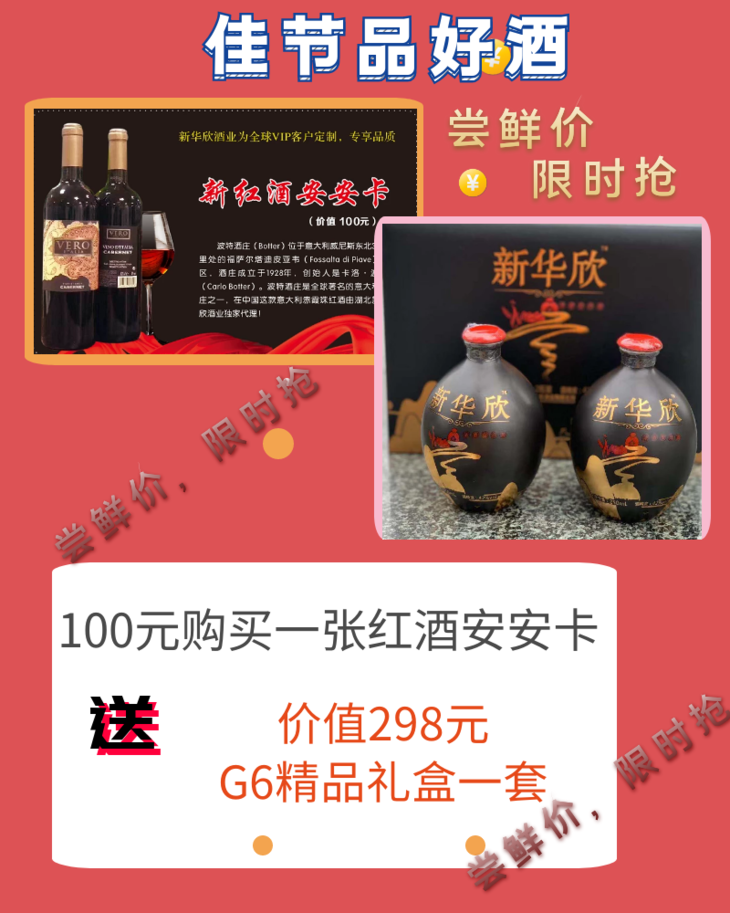 一张红酒安安卡,送一套新华欣G6精品礼盒。
