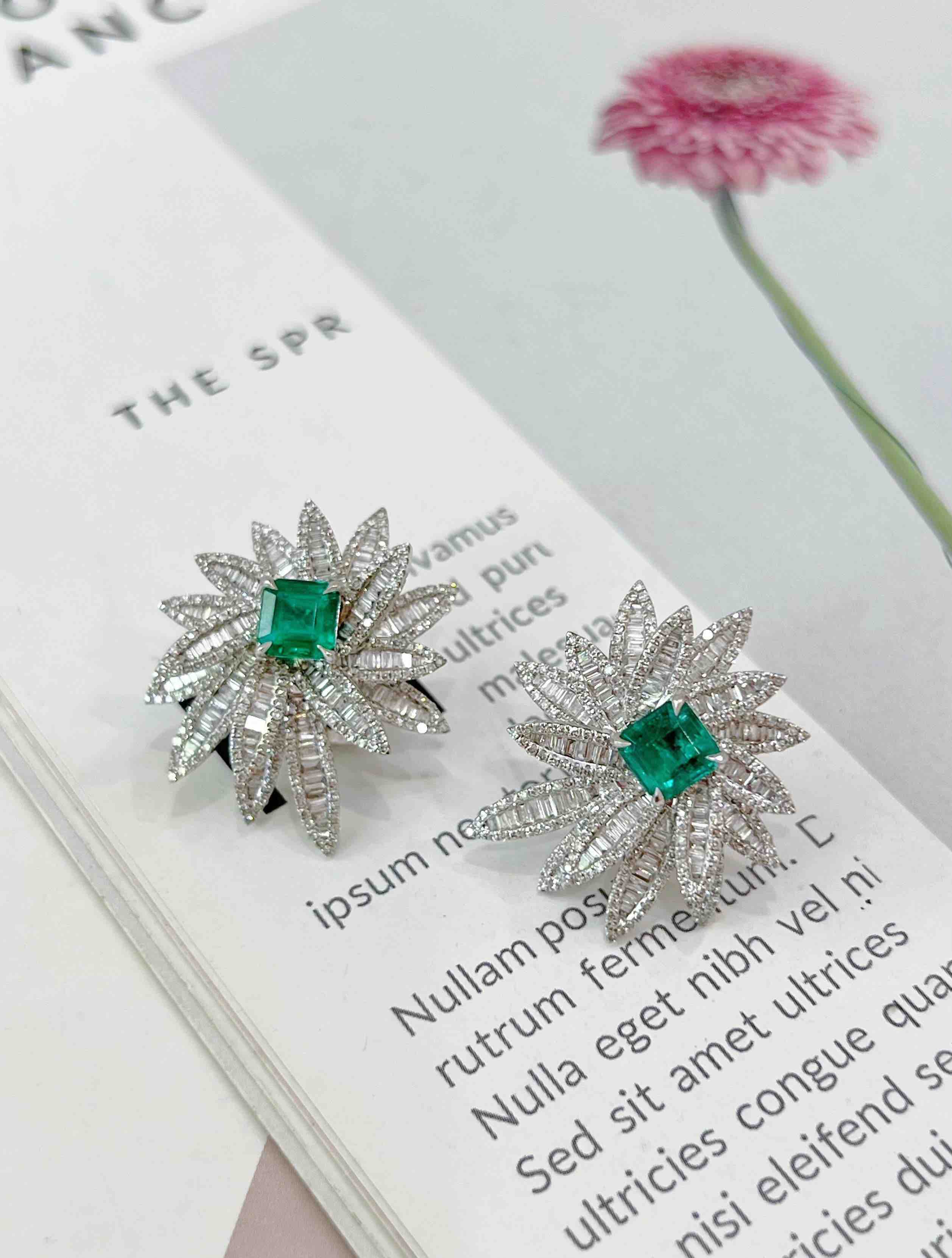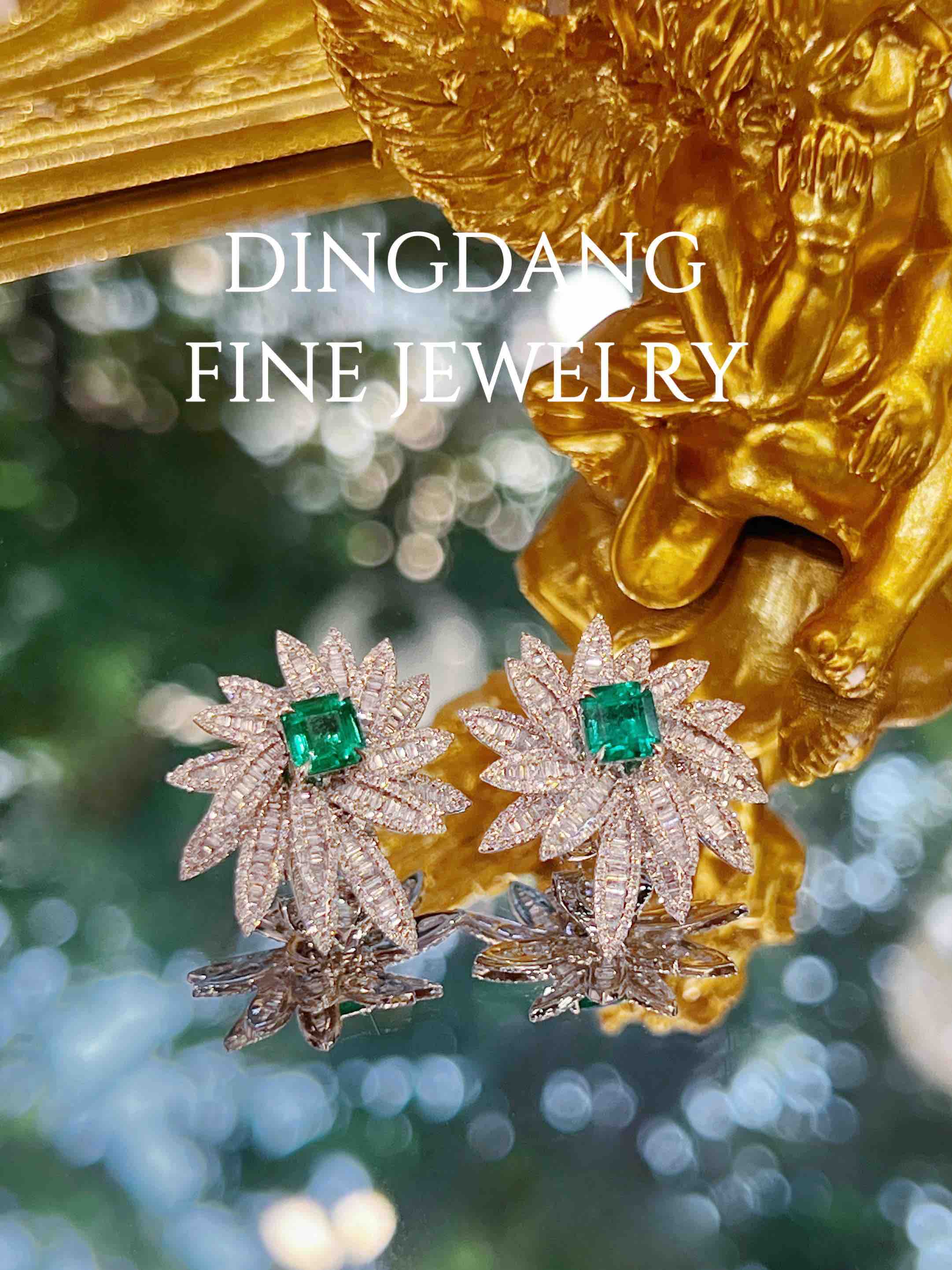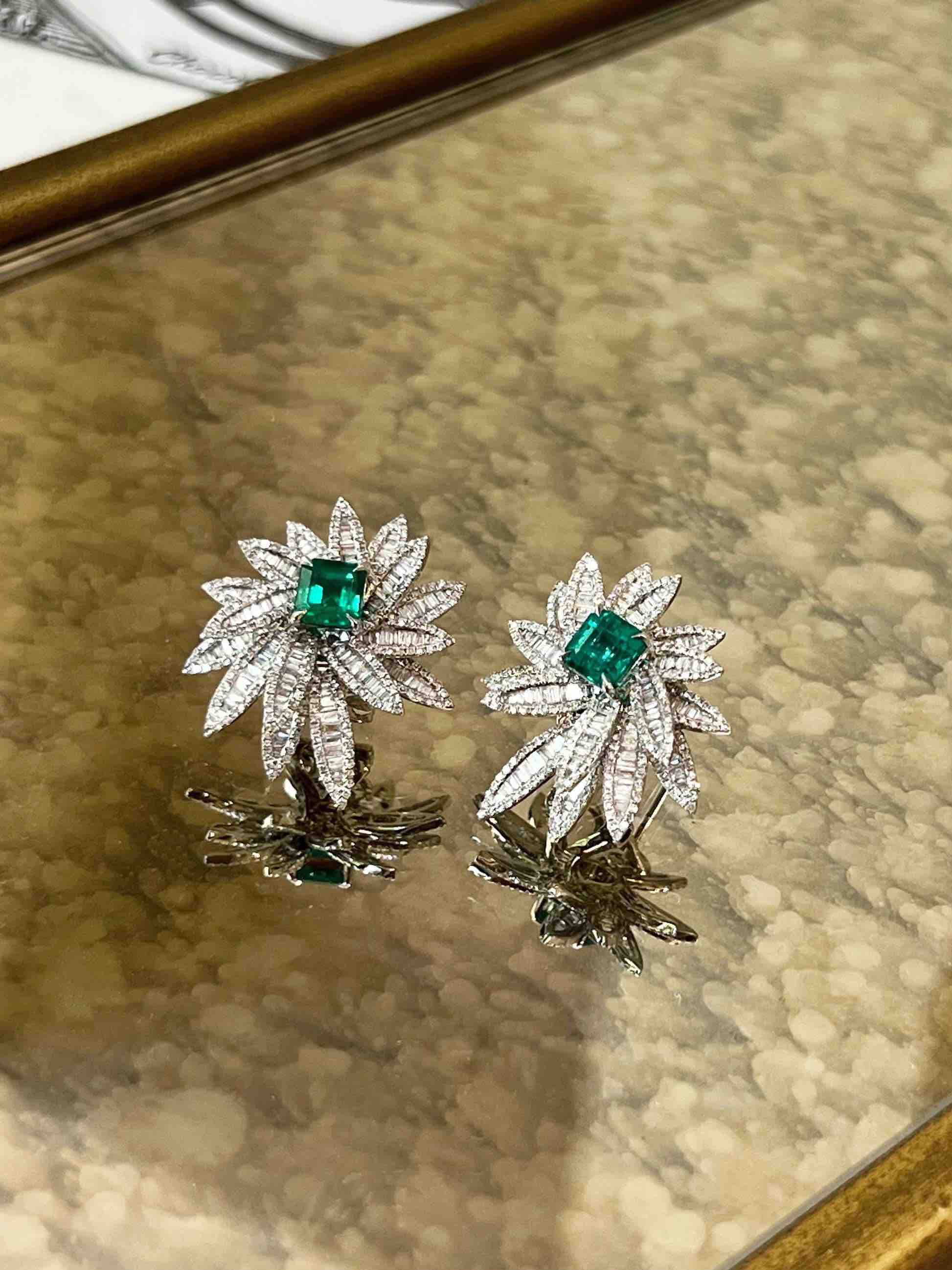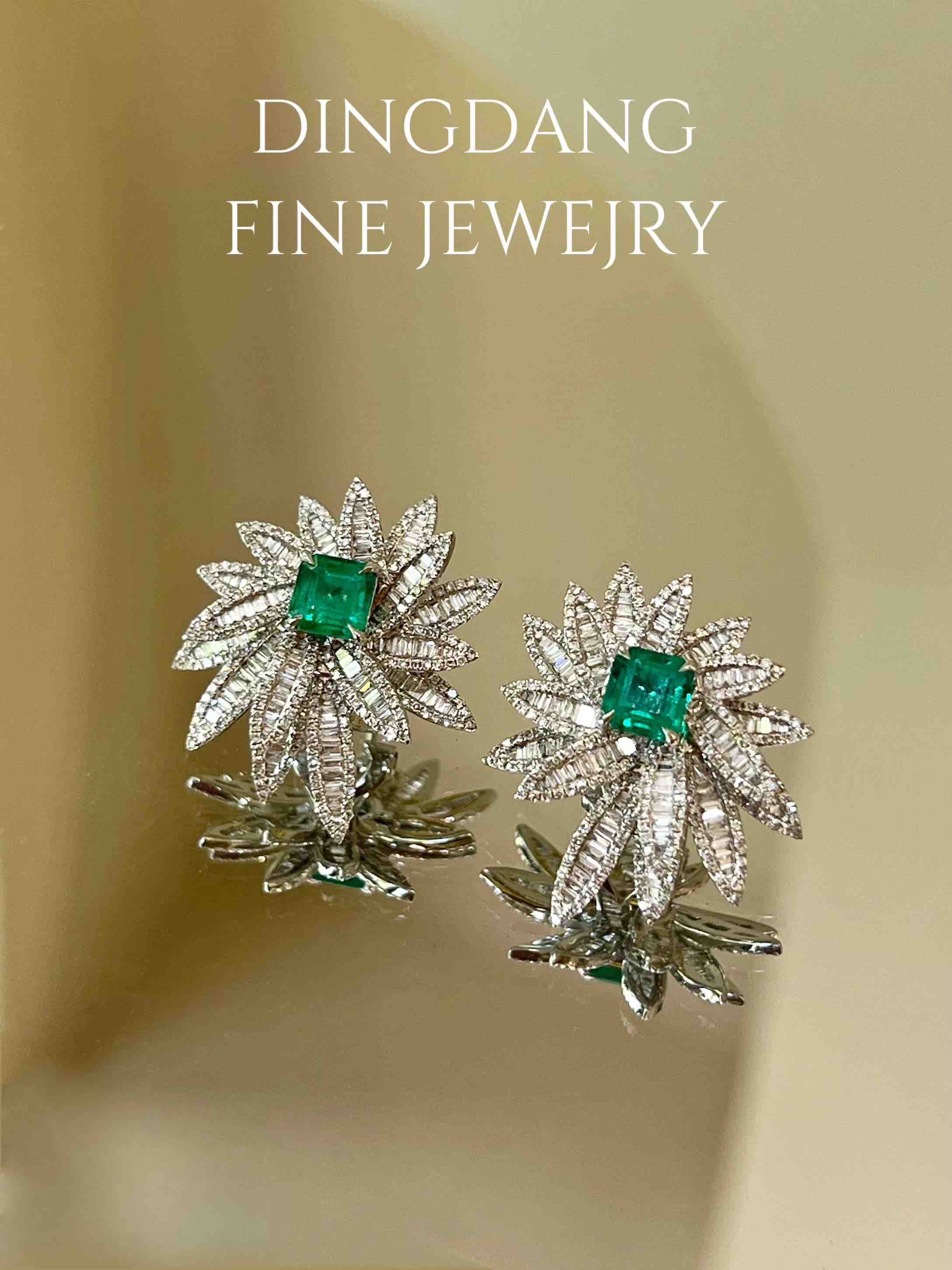 💚火彩和净度超赞!18k祖母绿耳钉,祖母绿2克拉,💎大钻豪镶!旁侧搭配一颗59分花形钻石,更加衬托出祖母绿在指间绽放出的动人绿意,而线条流畅的戒臂设计 ,都令整何精简时髦