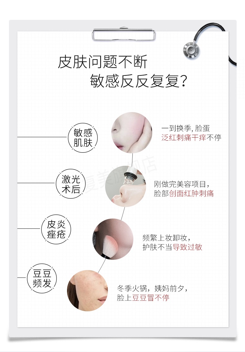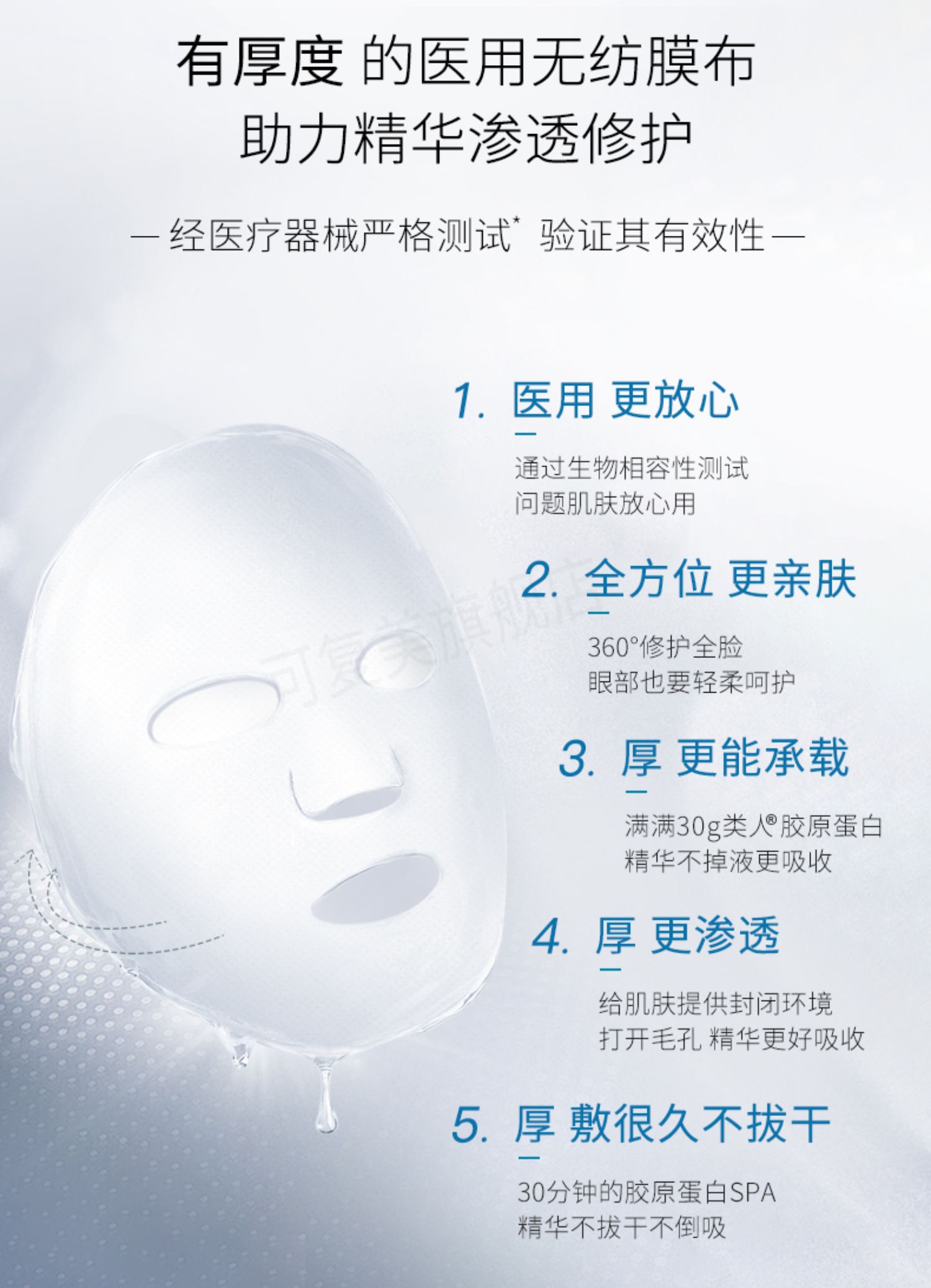 3、功效: 满满的胶原蛋白原液以及无纺布组成!消炎镇定 保湿缓解皮肤炎症!亲测有效!适合各种激光术后,痘痘肌肤、皮肤炎症、敏感肌肤。不仅修复肌肤屏障,还补水保湿。