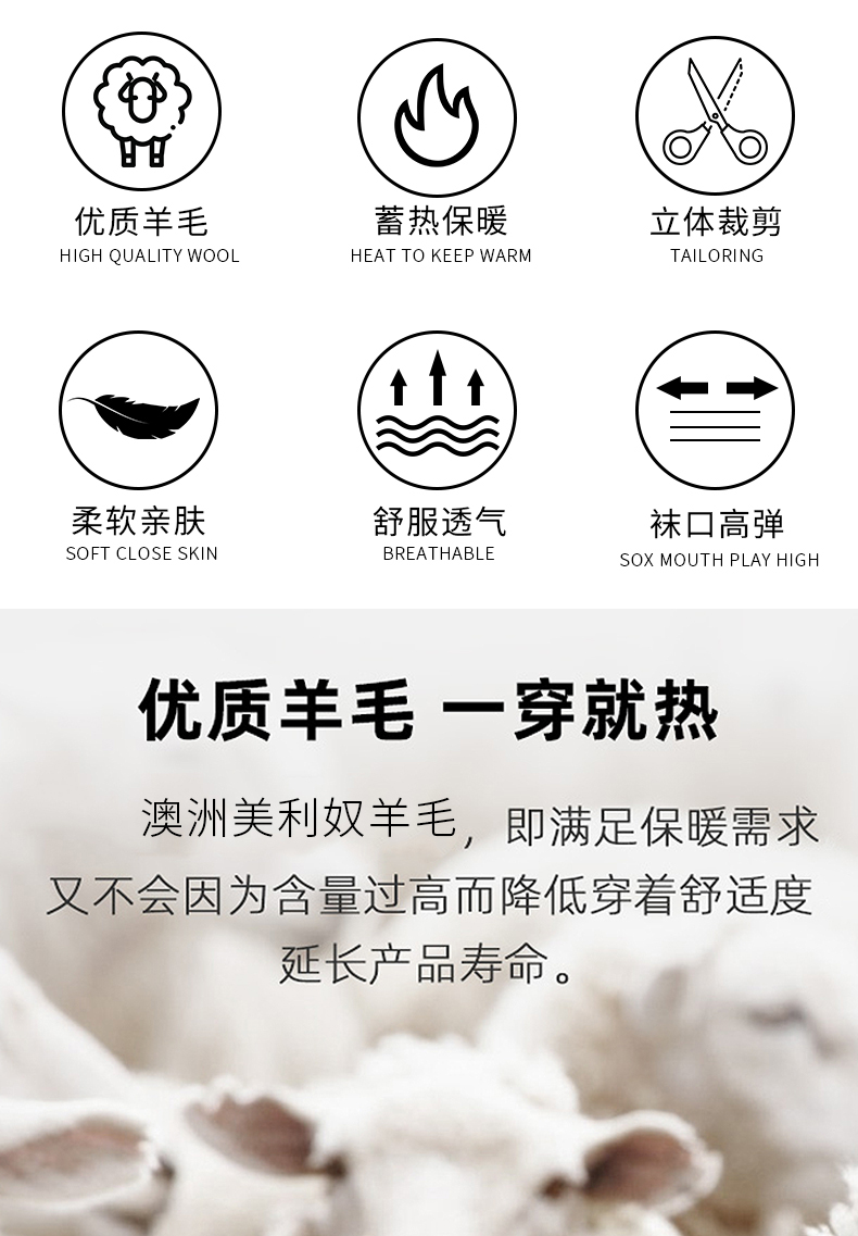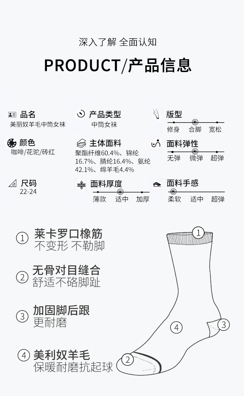 洁丽雅3双装美丽奴羊毛中筒女袜保暖亲肤简约柔软舒适袜子女
