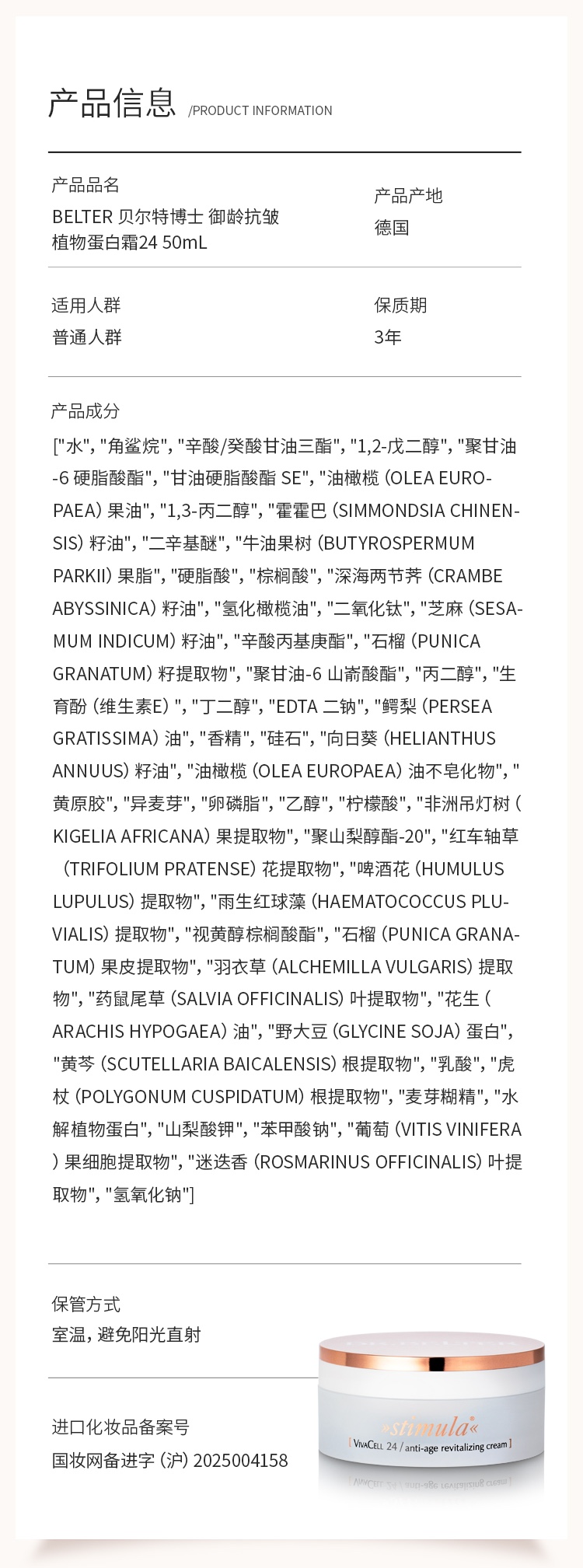 【特卖】DR.BELTER 贝尔特博士 御龄抗皱植物蛋白霜 50mL 德国进口 28年到期全新