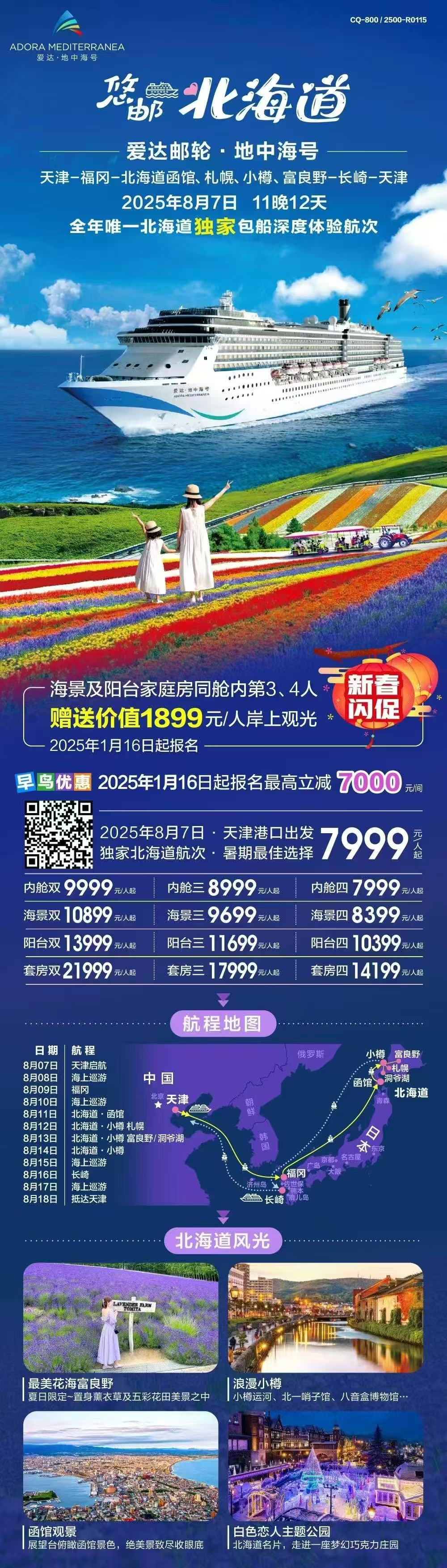 【天津港出发】爱达地中海号邮轮8月7日出发 悠邮北海道独家包船深度体验